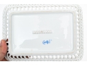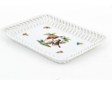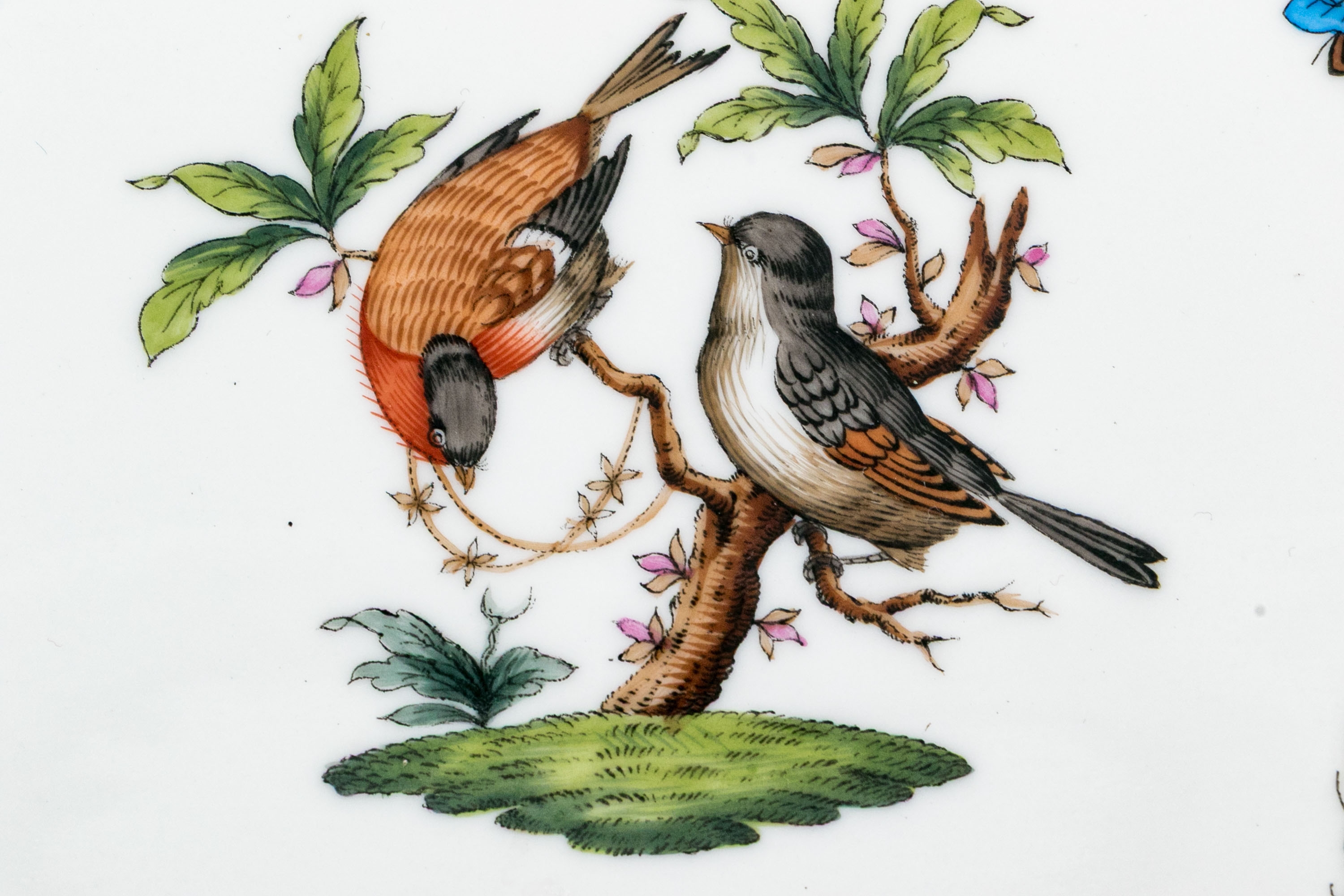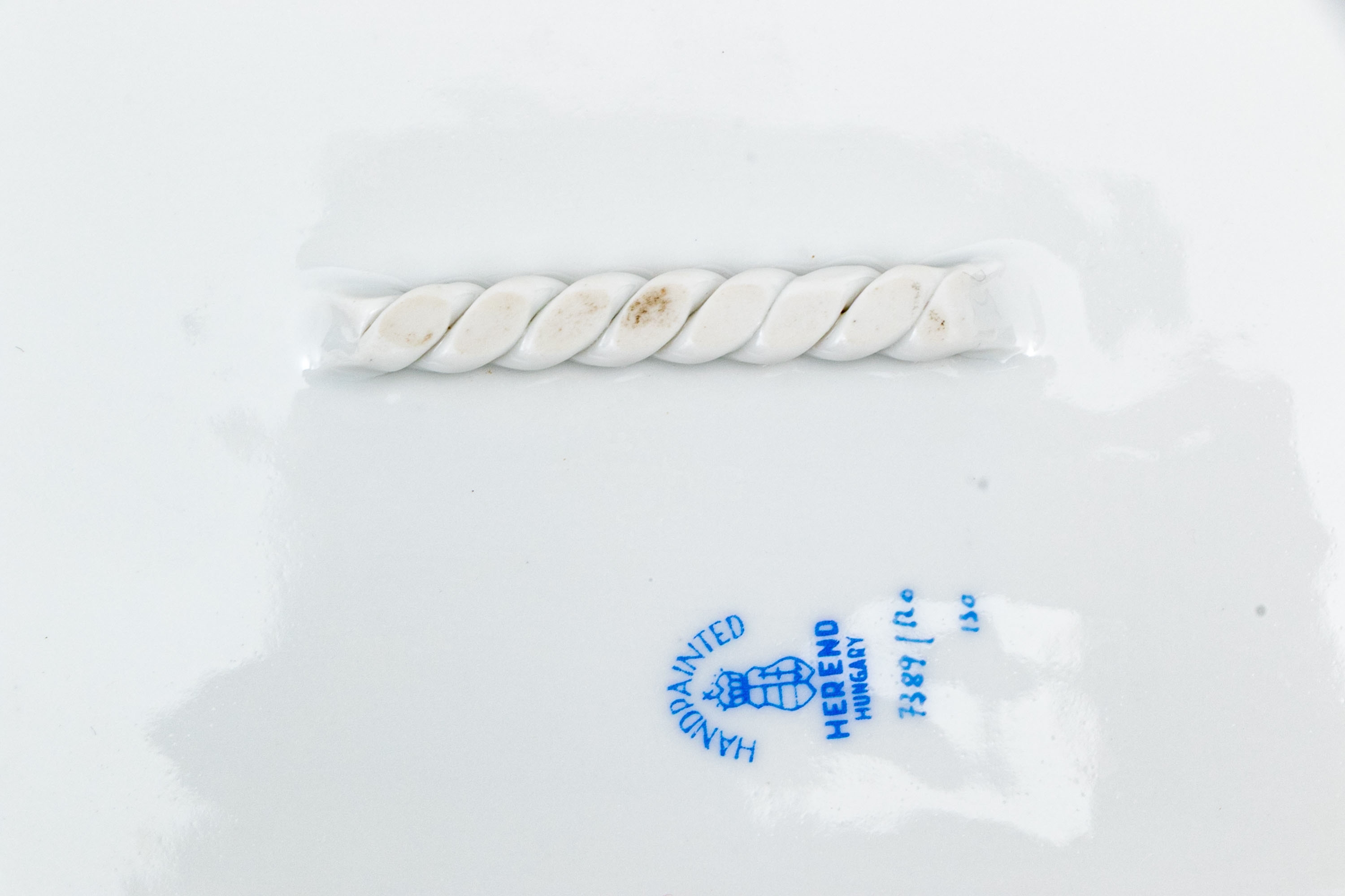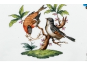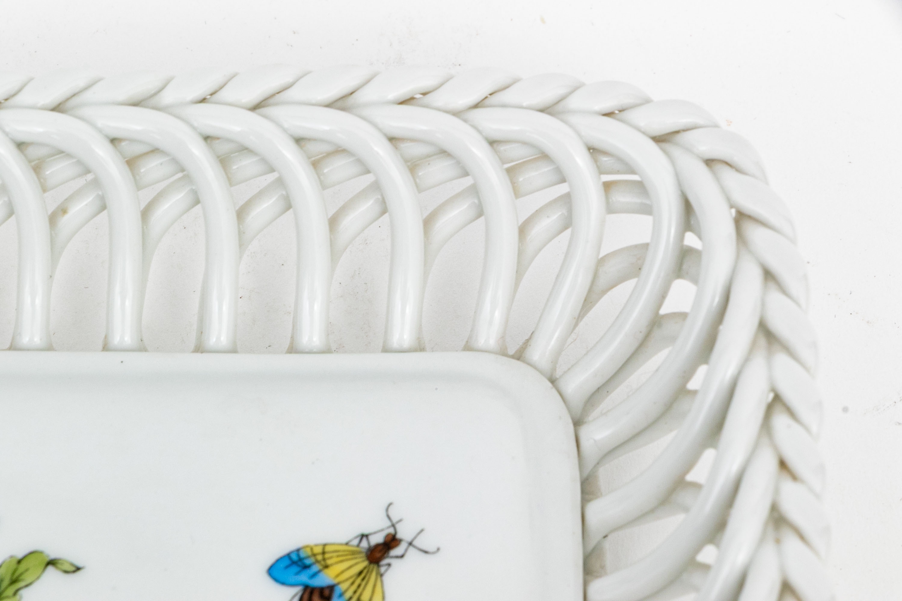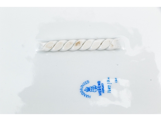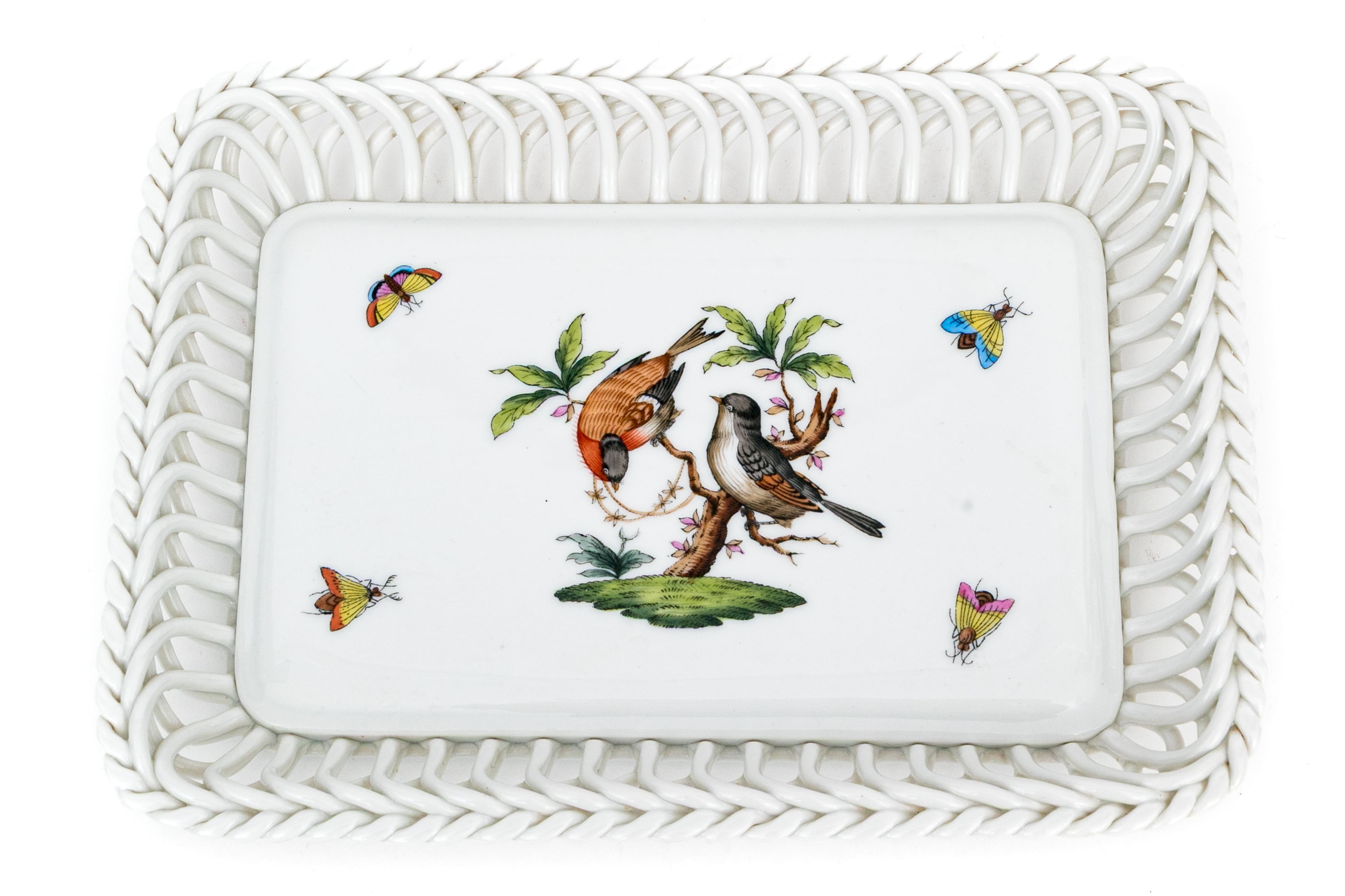 Herend Hungary’s hand-painted porcelain ectangular reticulated basket (model 7389/RO) features the Rothschild Bird (RO) pattern. The handwoven porcelain design showcases an intricately pierced and braided border, creating a delicate openwork effect that exemplifies Herend’s mastery of porcelain craft. At the center, two vividly painted songbirds perch on flowering branches with necklace, surrounded by colorful butterflies rendered in bright hues of yellow, magenta, blue, and orange. The design is executed on a glossy white porcelain ground, framed by a smooth, rectangular inner border that emphasizes the meticulous hand-painting. Underside bears the Herend Hungary blue shield hallmark with crossed paintbrushes and “HANDPAINTED” inscription, along with the model number 7389/RO.