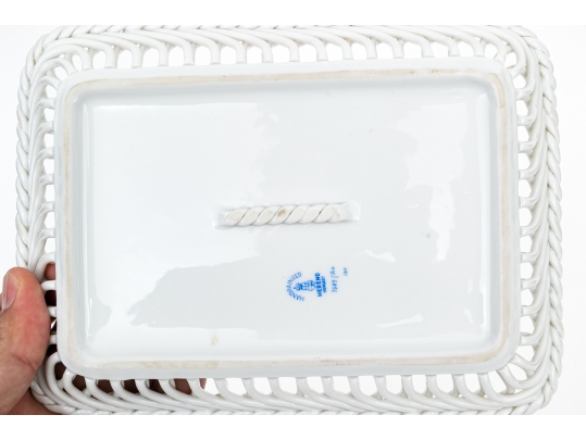 The base is clean and well-marked, showing clear factory stamps and impressed detailing from the handwoven porcelain construction. The glaze remains smooth and lustrous.