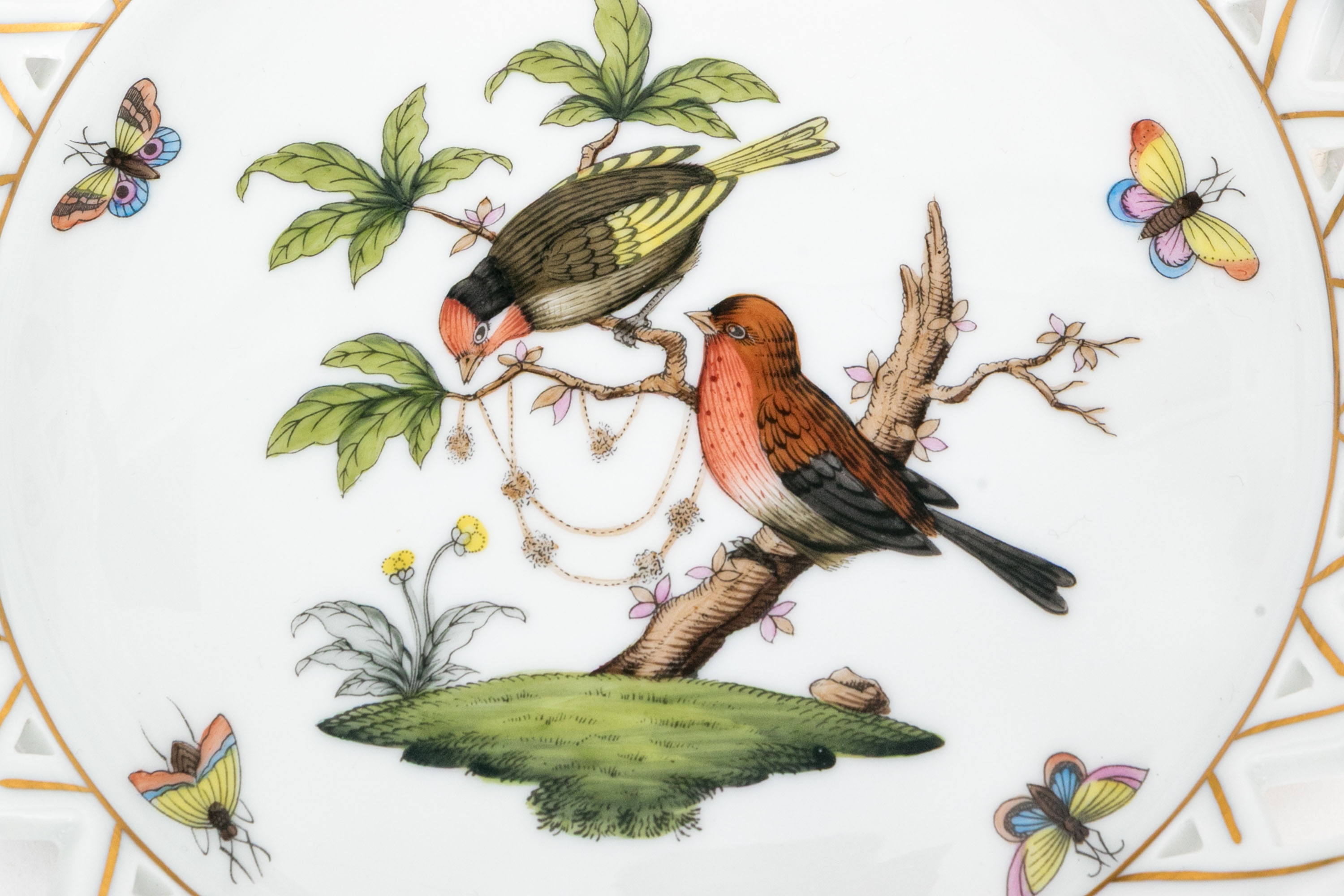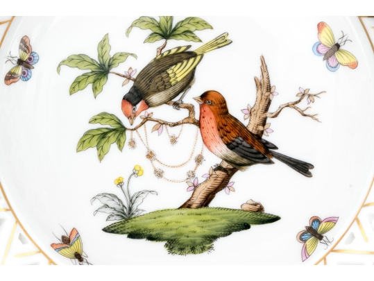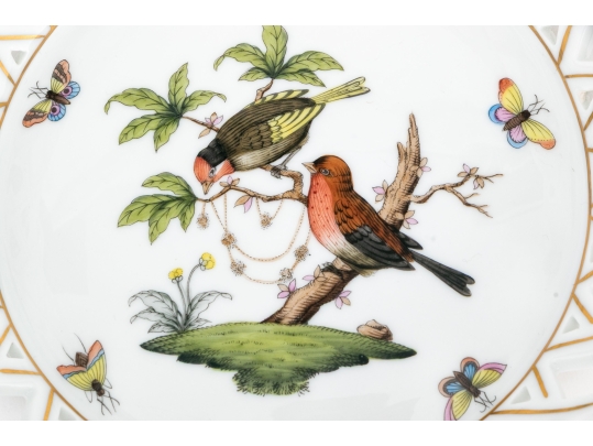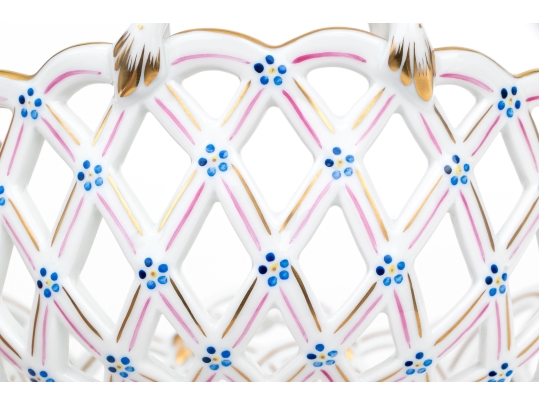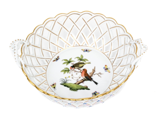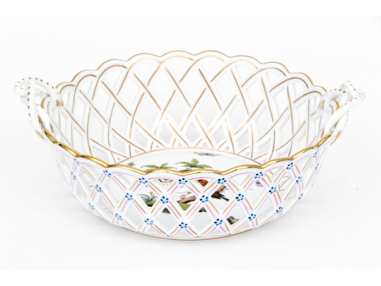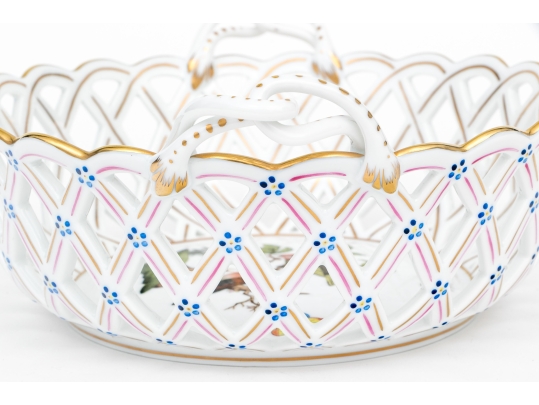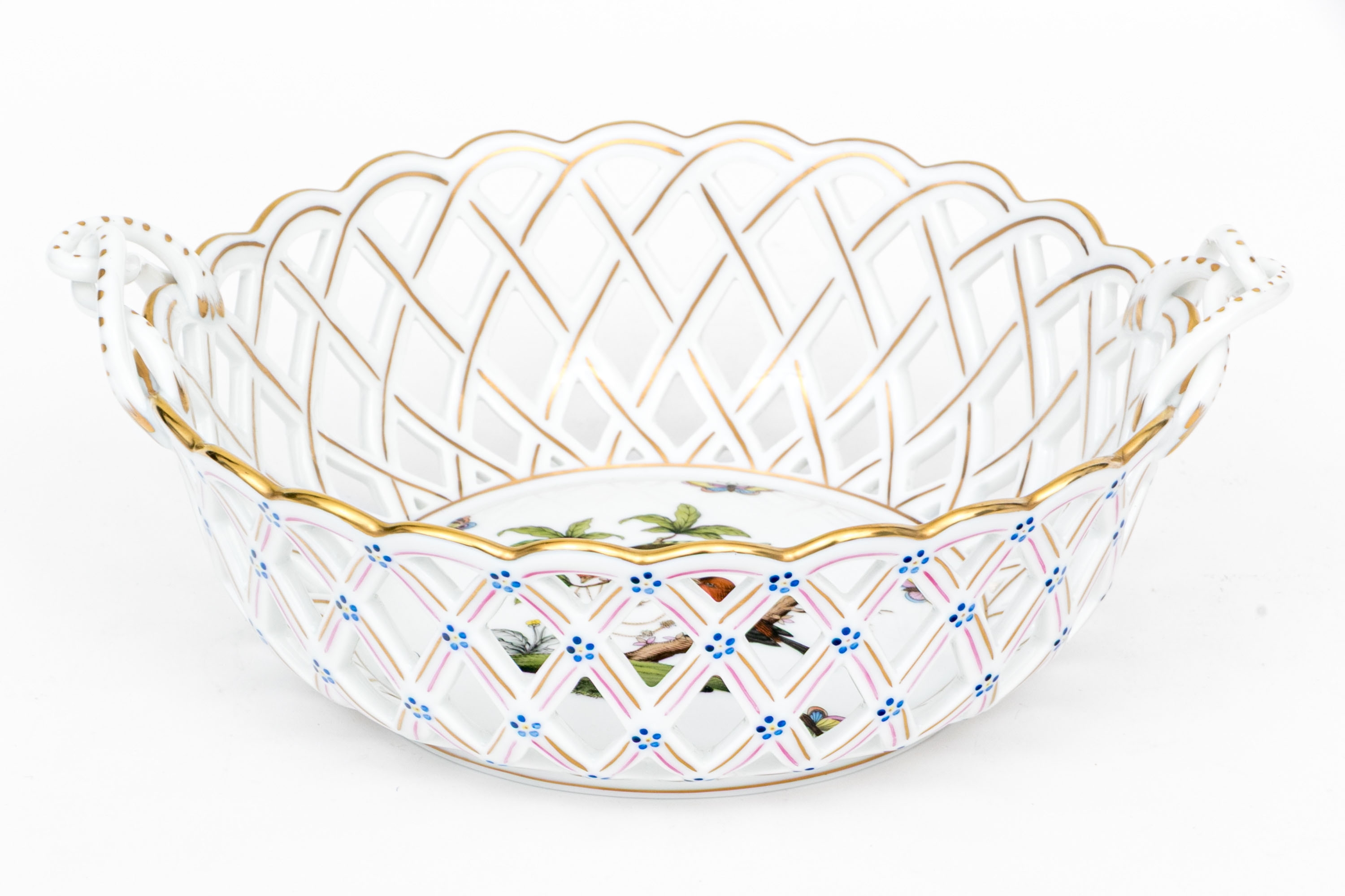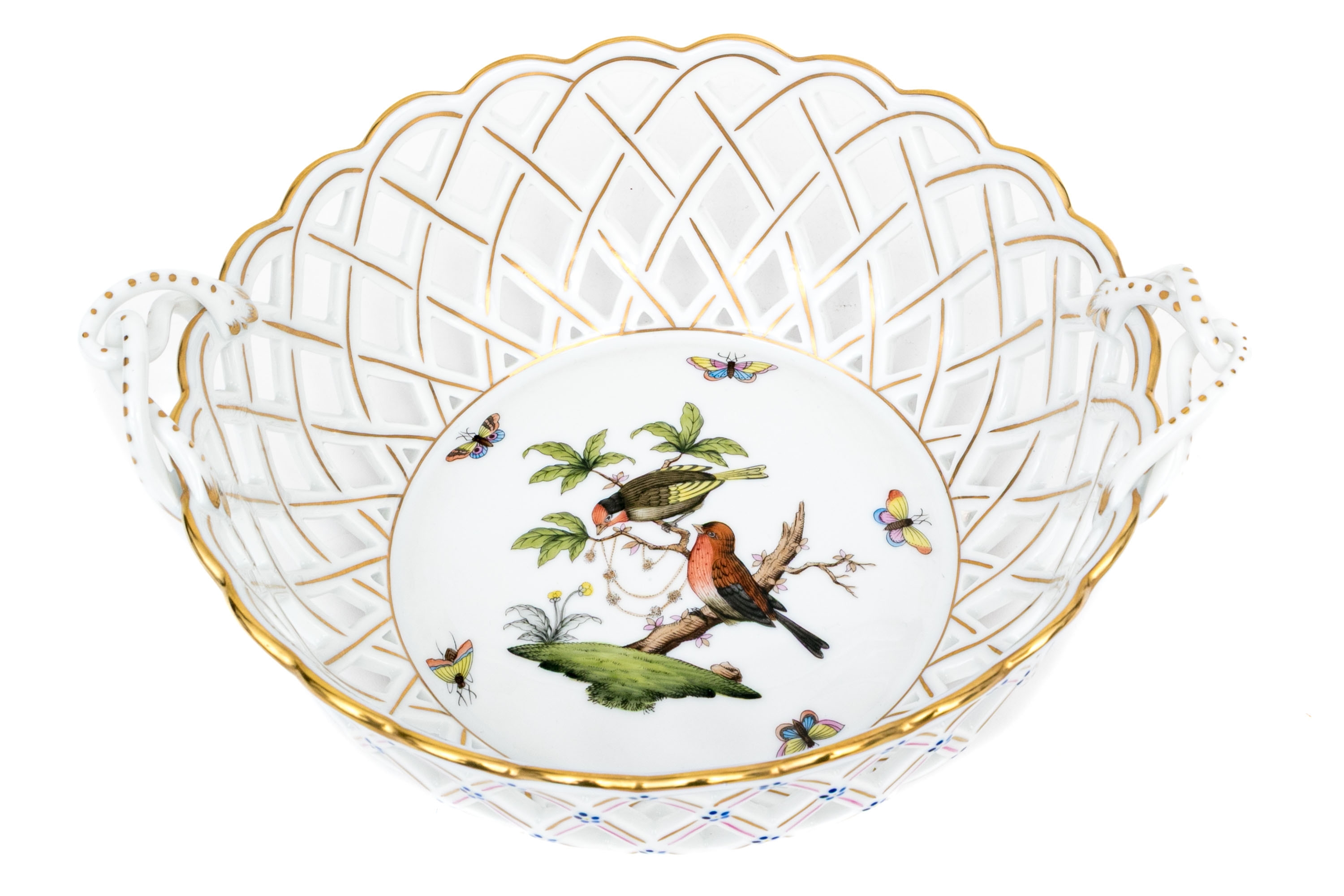 Herend Hungary Hand-Painted Porcelain Reticulated Basket, Rothschild Bird (RO) Pattern