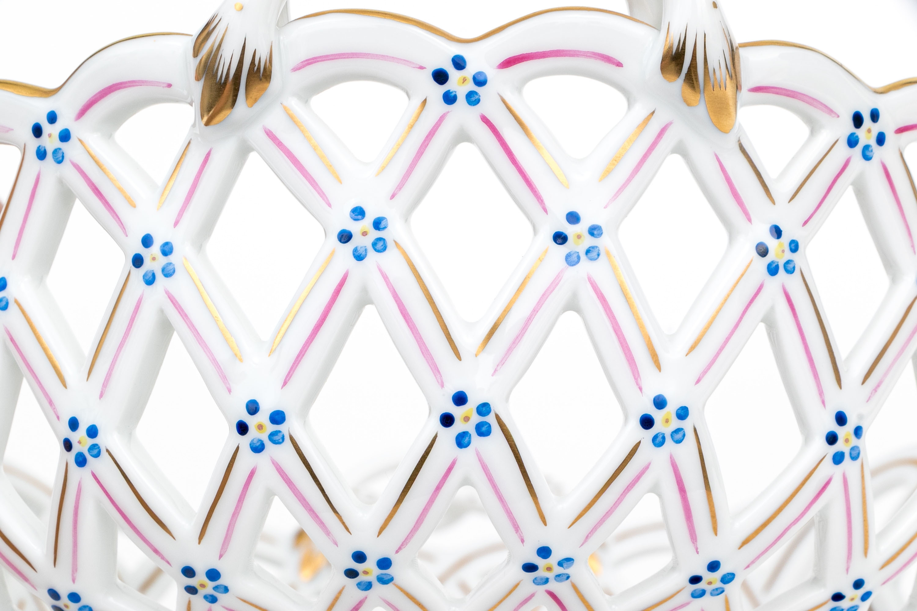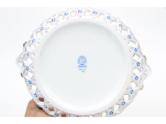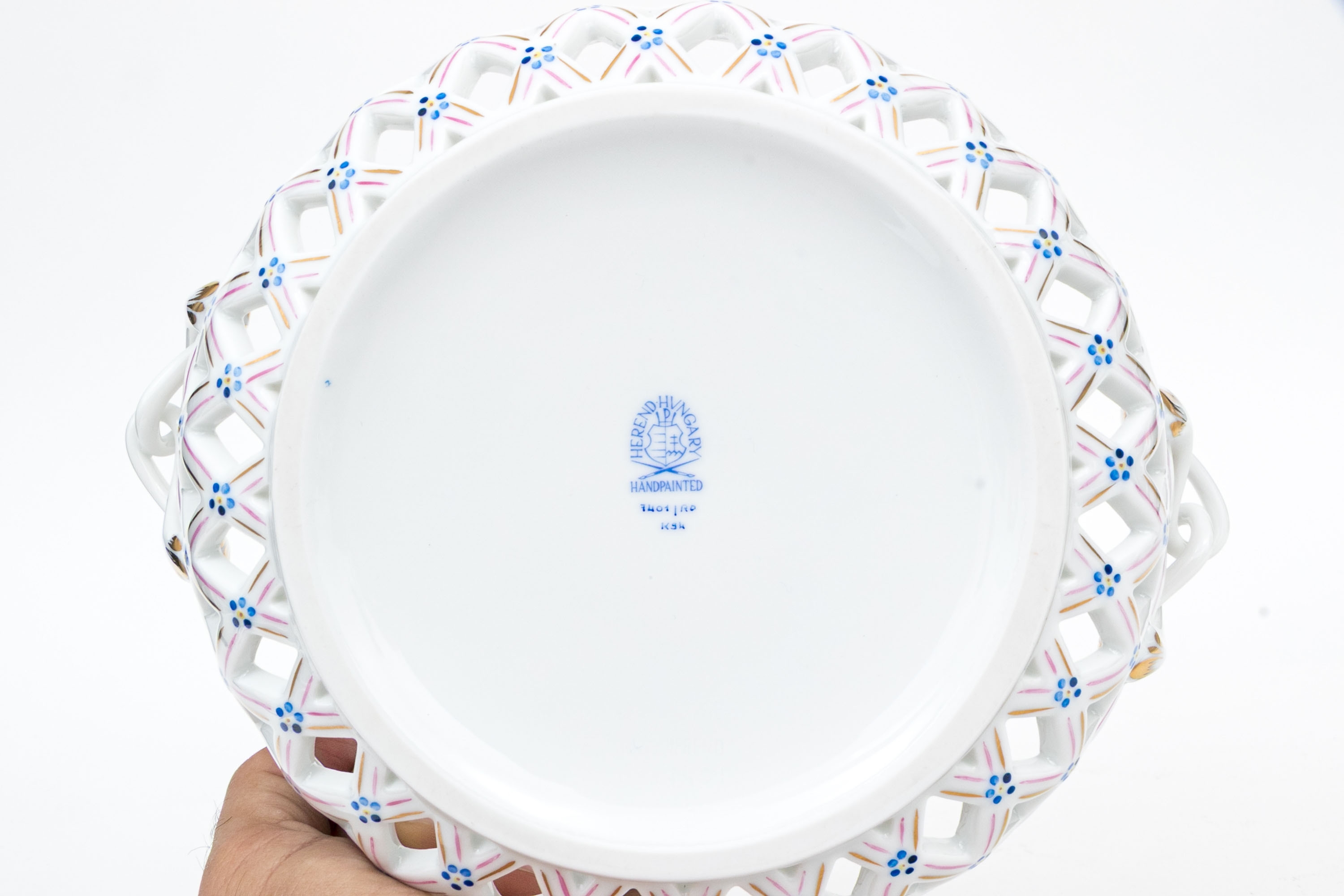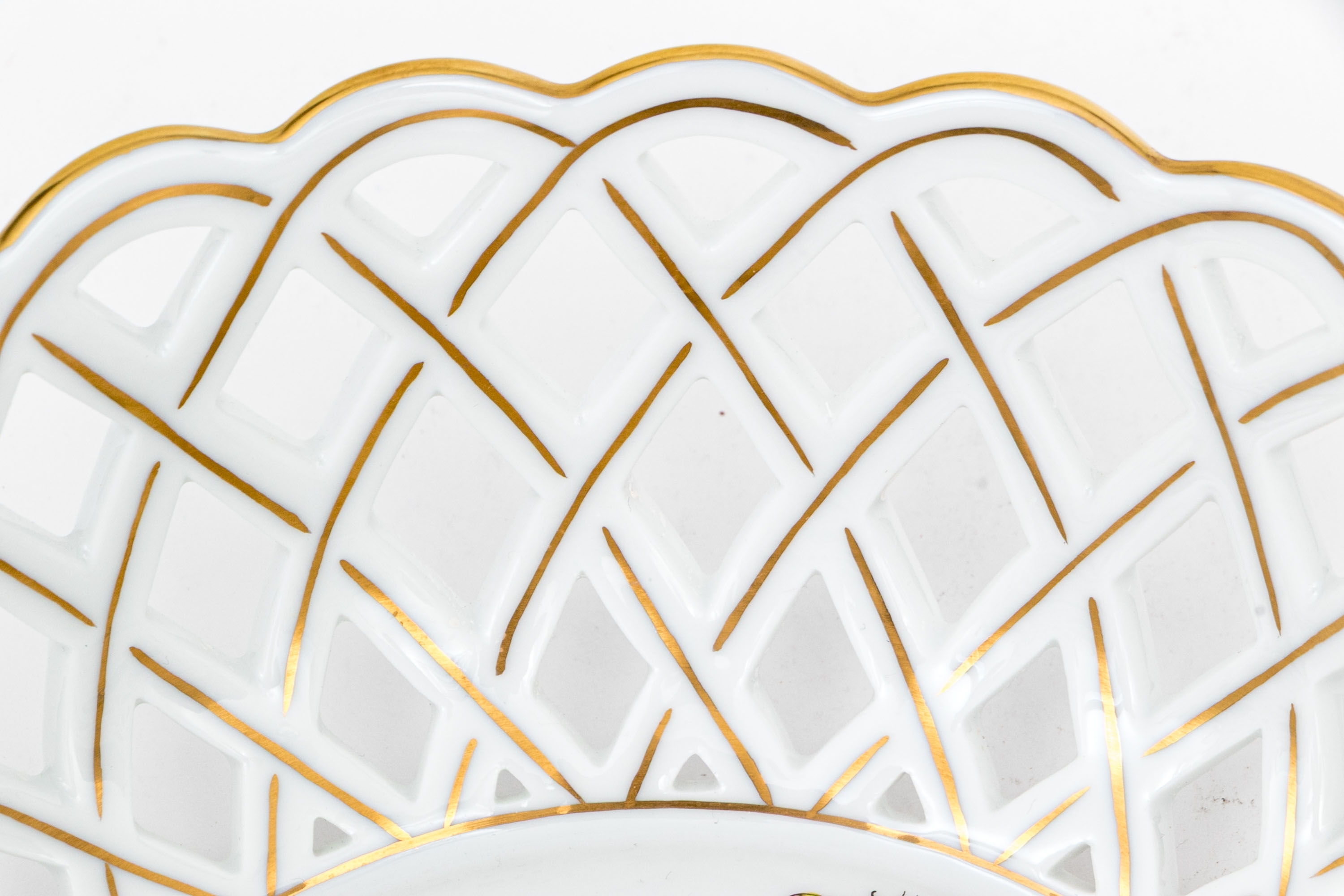 Condition: Excellent condition throughout. No chips, cracks, or restorations. The openwork lattice is intact and even, and the hand-painted decoration retains its brilliance and precision. The gilding remains rich and bright, with only the most minimal signs of age. The underside is clean and well-marked, showing the full Herend factory hallmark and painter’s markings. The unglazed foot shows only minor shelf wear consistent with careful display.