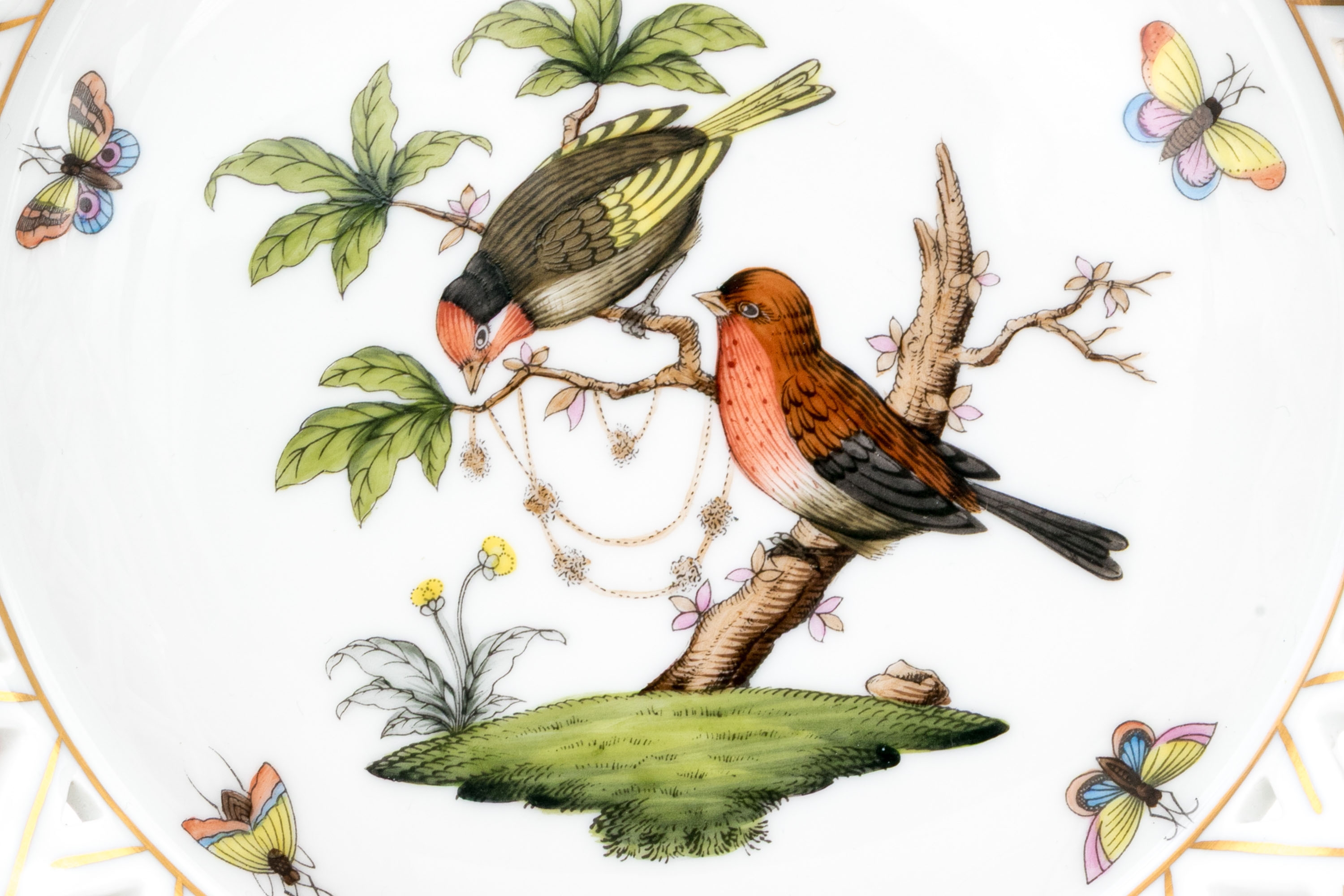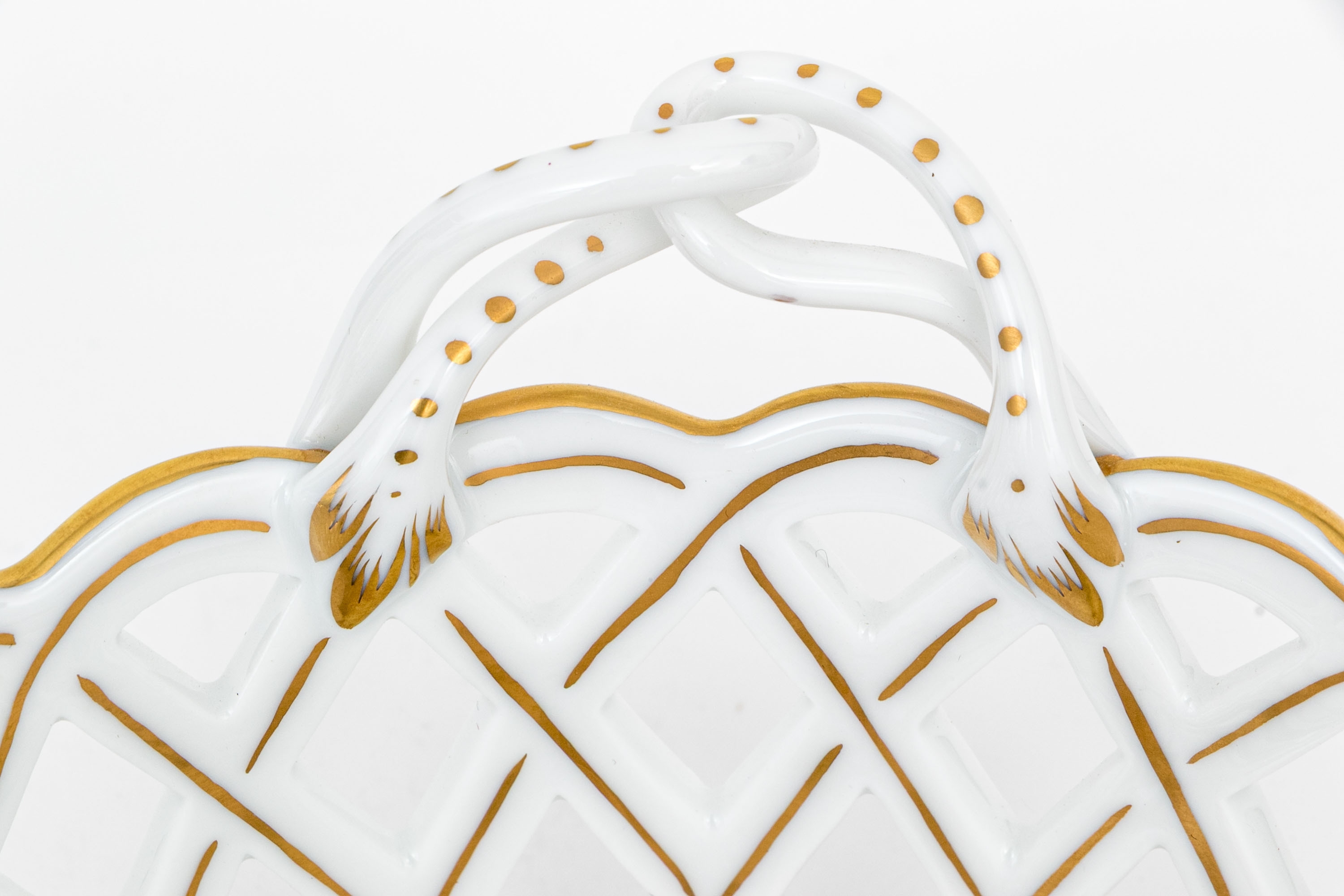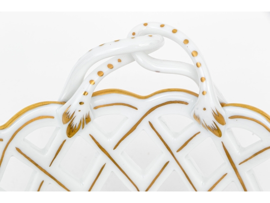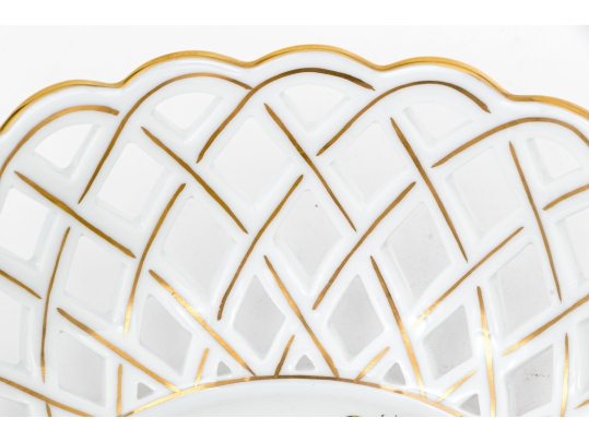 Condition: Excellent condition throughout. No chips, cracks, or restorations. The openwork lattice is intact and even, and the hand-painted decoration retains its brilliance and precision. The gilding remains rich and bright, with only the most minimal signs of age. The underside is clean and well-marked, showing the full Herend factory hallmark and painter’s markings. The unglazed foot shows only minor shelf wear consistent with careful display.