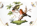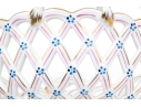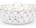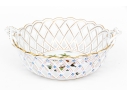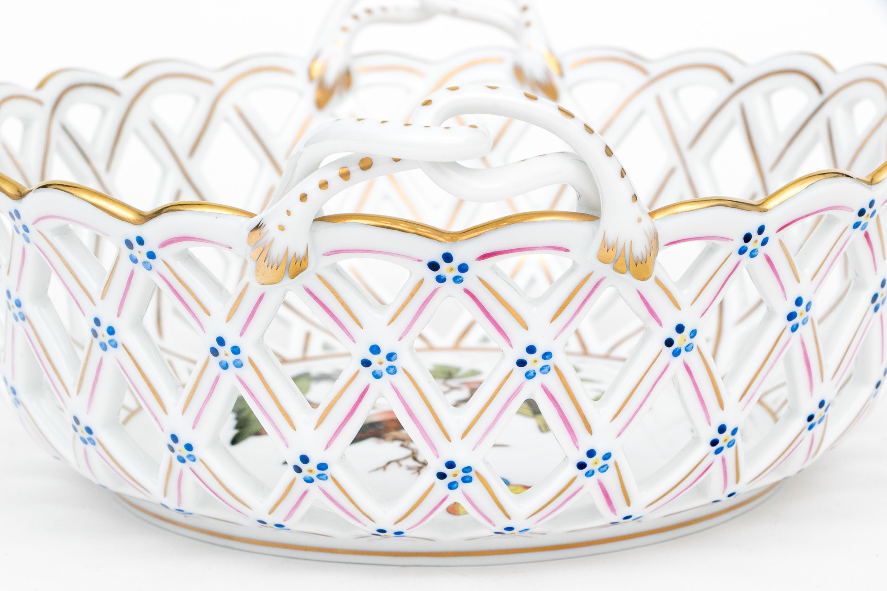 Herend Hungary, this hand-painted reticulated basket (model 7401/RO) showcases the Rothschild Bird pattern.