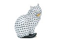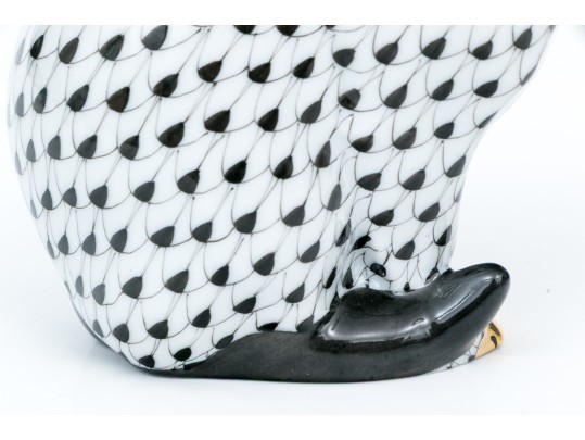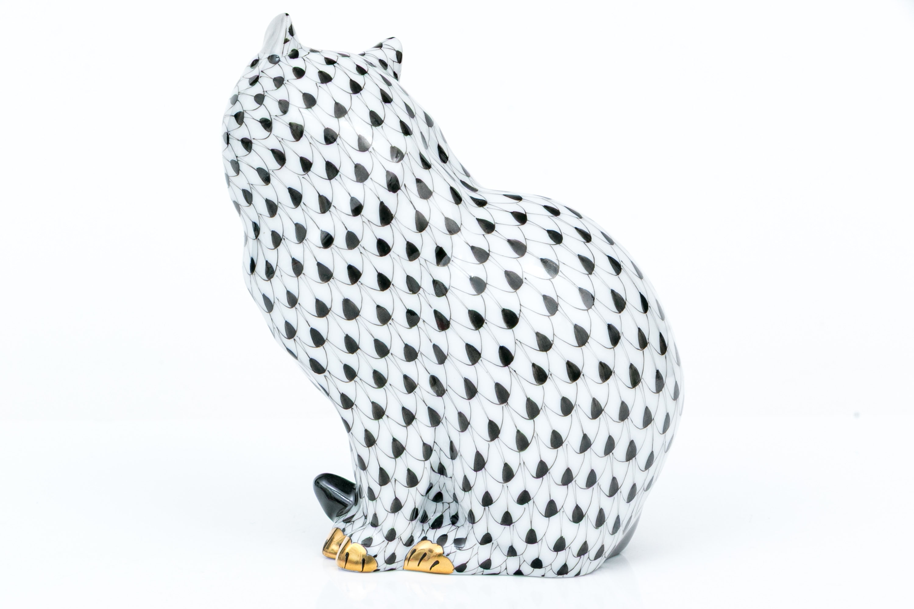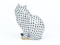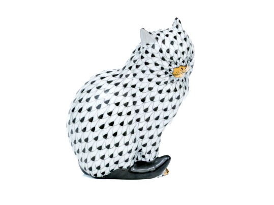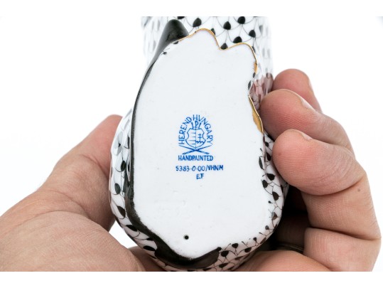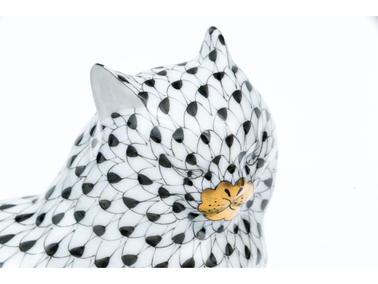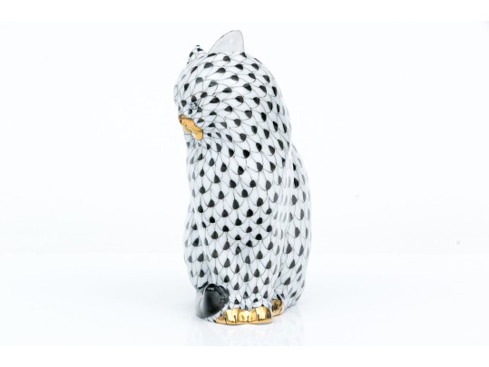 This porcelain cat figure by Herend is model 5383, a seated feline rendered with serene poise and soft curves. The piece is hand-painted in the iconic black fishnet (VHNM) pattern. The cat’s face is accentuated by a 24K gold nose and whisker detailing, while the paws are gilded in rich gold, adding a touch of warmth and contrast to the glossy monochrome surface. The underside bears the blue Herend Hungary shield mark, inscribed HANDPAINTED, with model number 5383-0-00/VHNM.