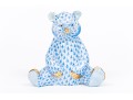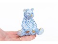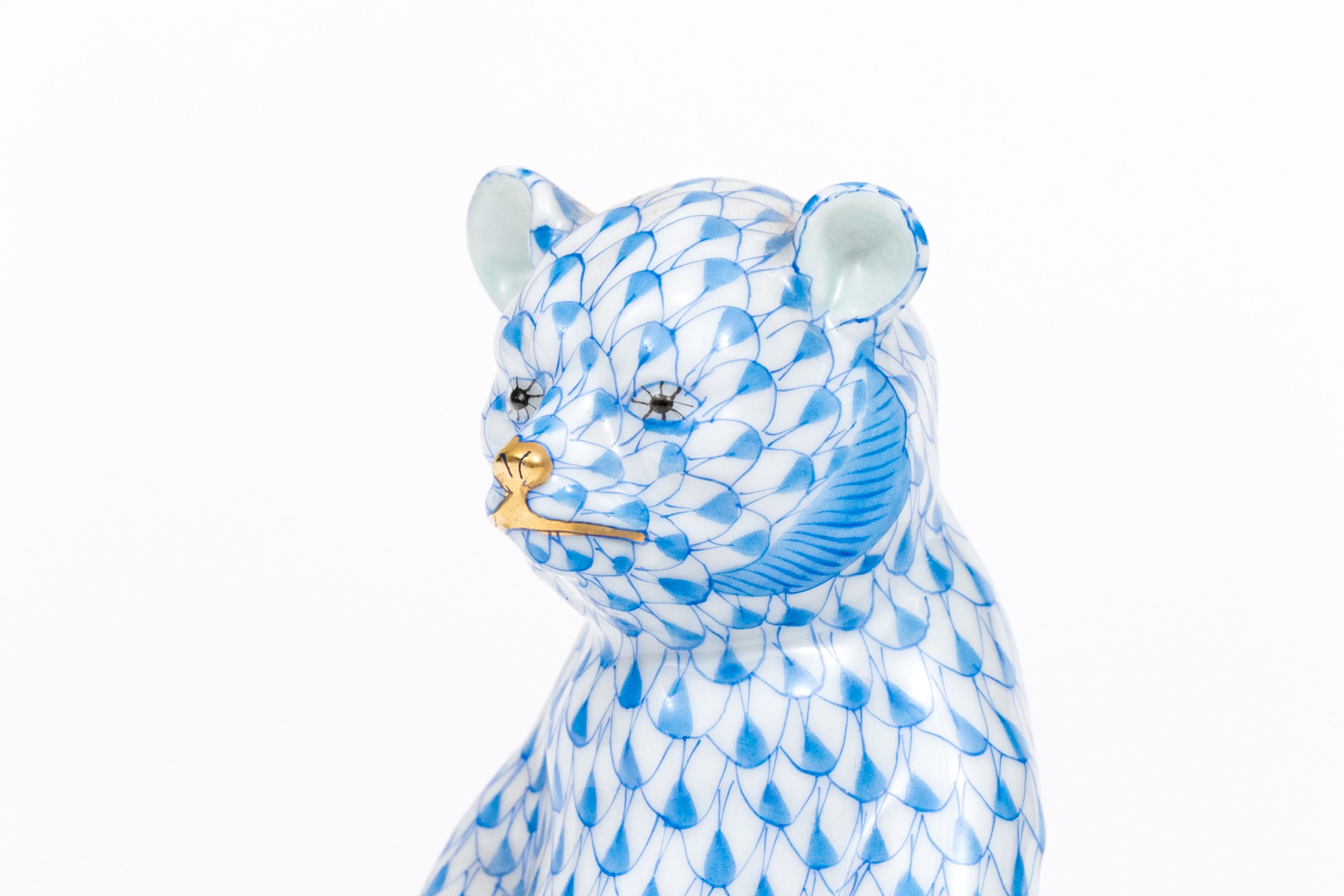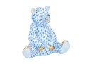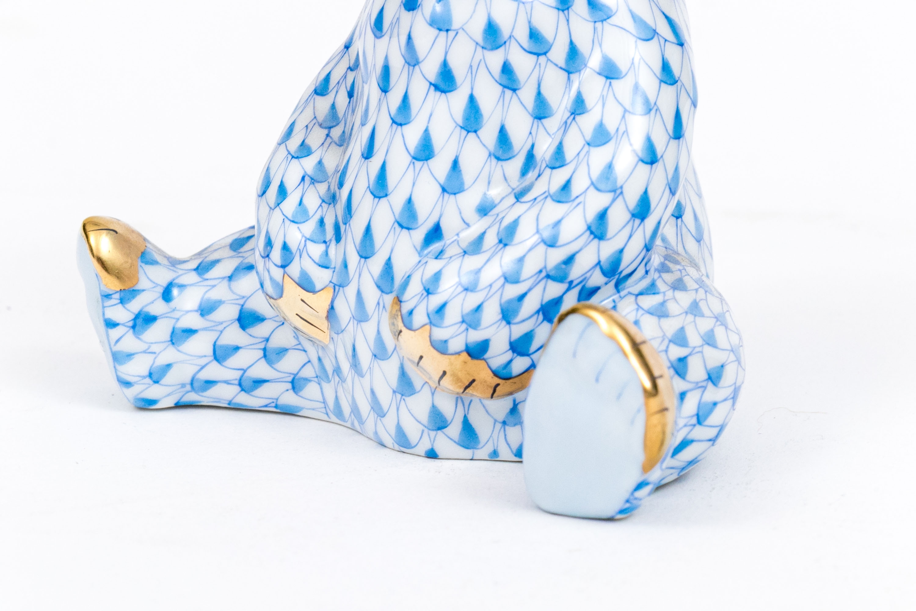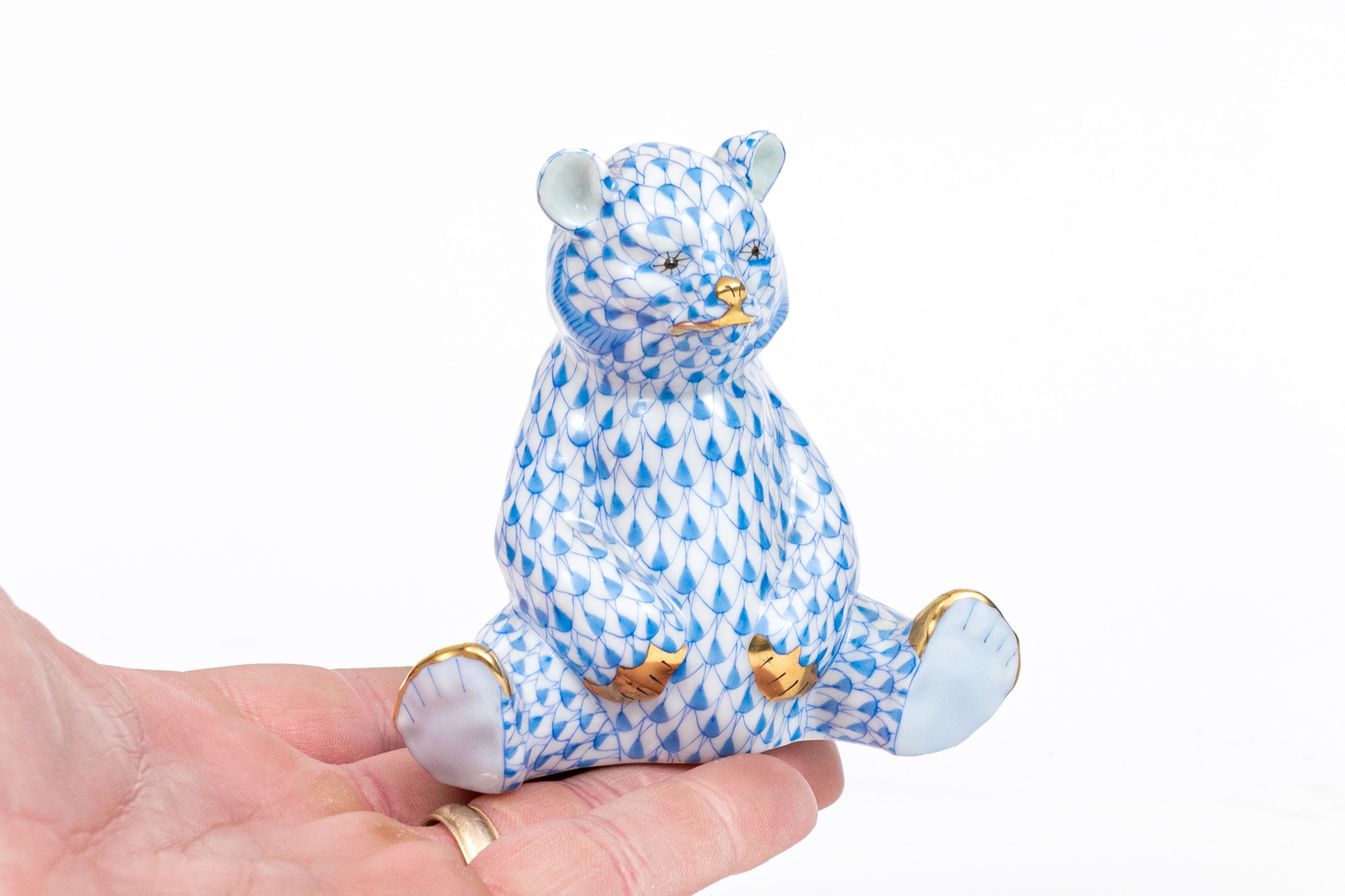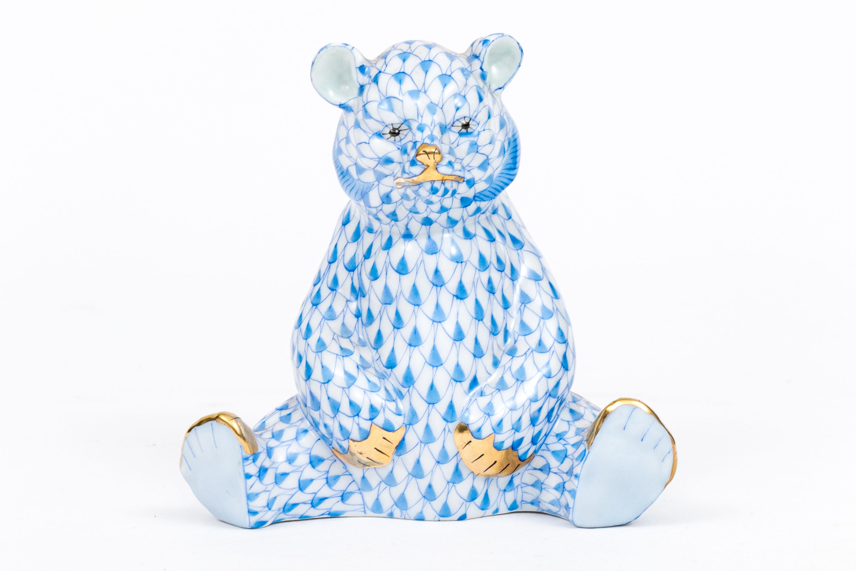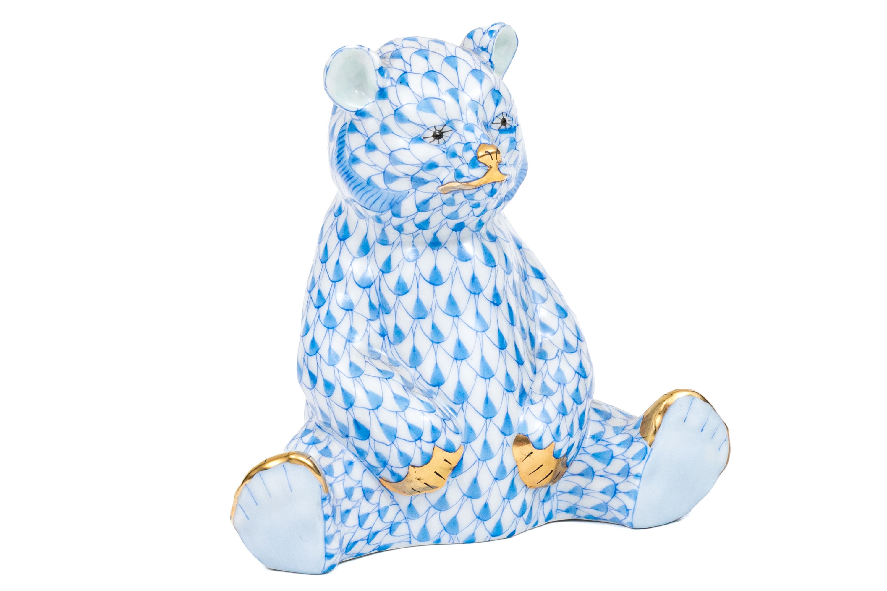 Herend Hungary porcelain sitting bear figure, hand-painted in the Blue Fishnet (VHB) pattern with 24K gold accents. This charming bear, rendered in a seated pose with a gentle expression, is in the "teddy bear" position.