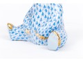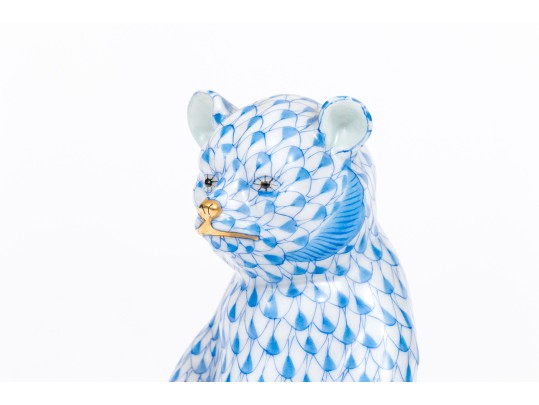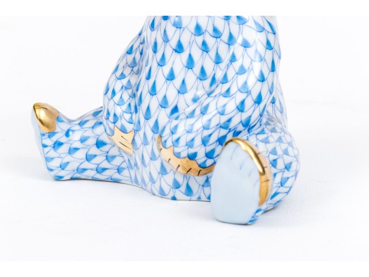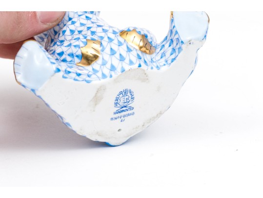 The bear’s surface features Herend’s iconic fishnet motif, hand-painted in soft cobalt blue, complemented by gilded paws, nose, and muzzle. The underside is stamped with the Herend Hungary blue shield hallmark and crossed paintbrushes, marked Handpainted, with the model number 15361-0-00/VHB and painter’s initials.