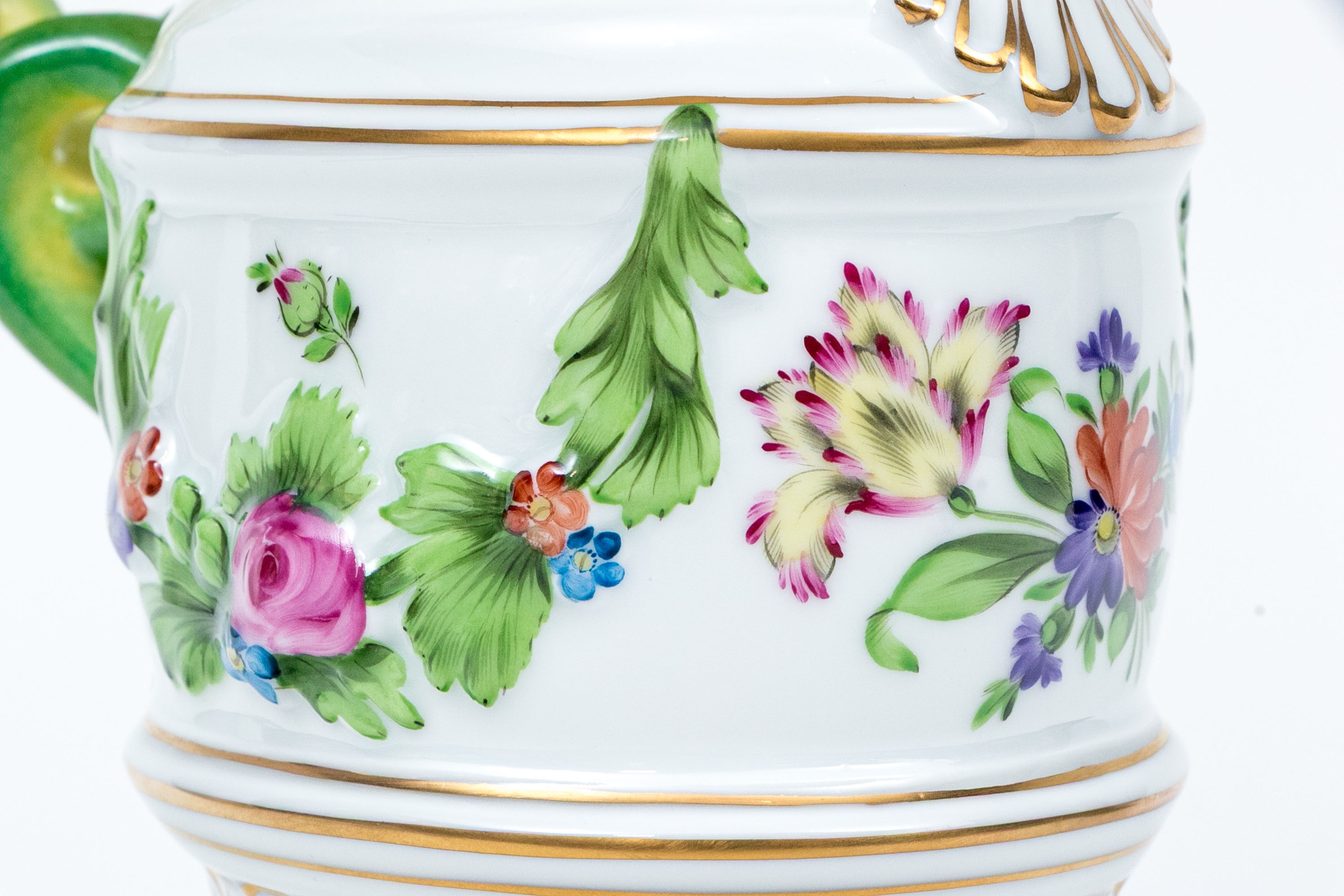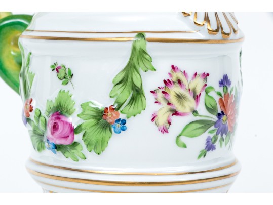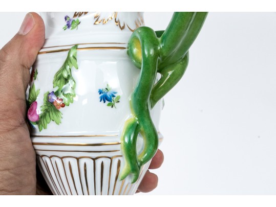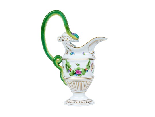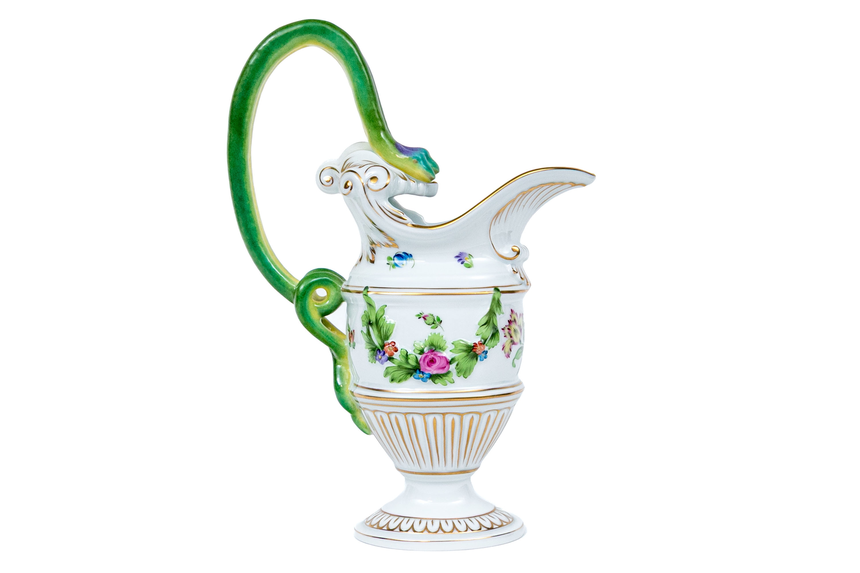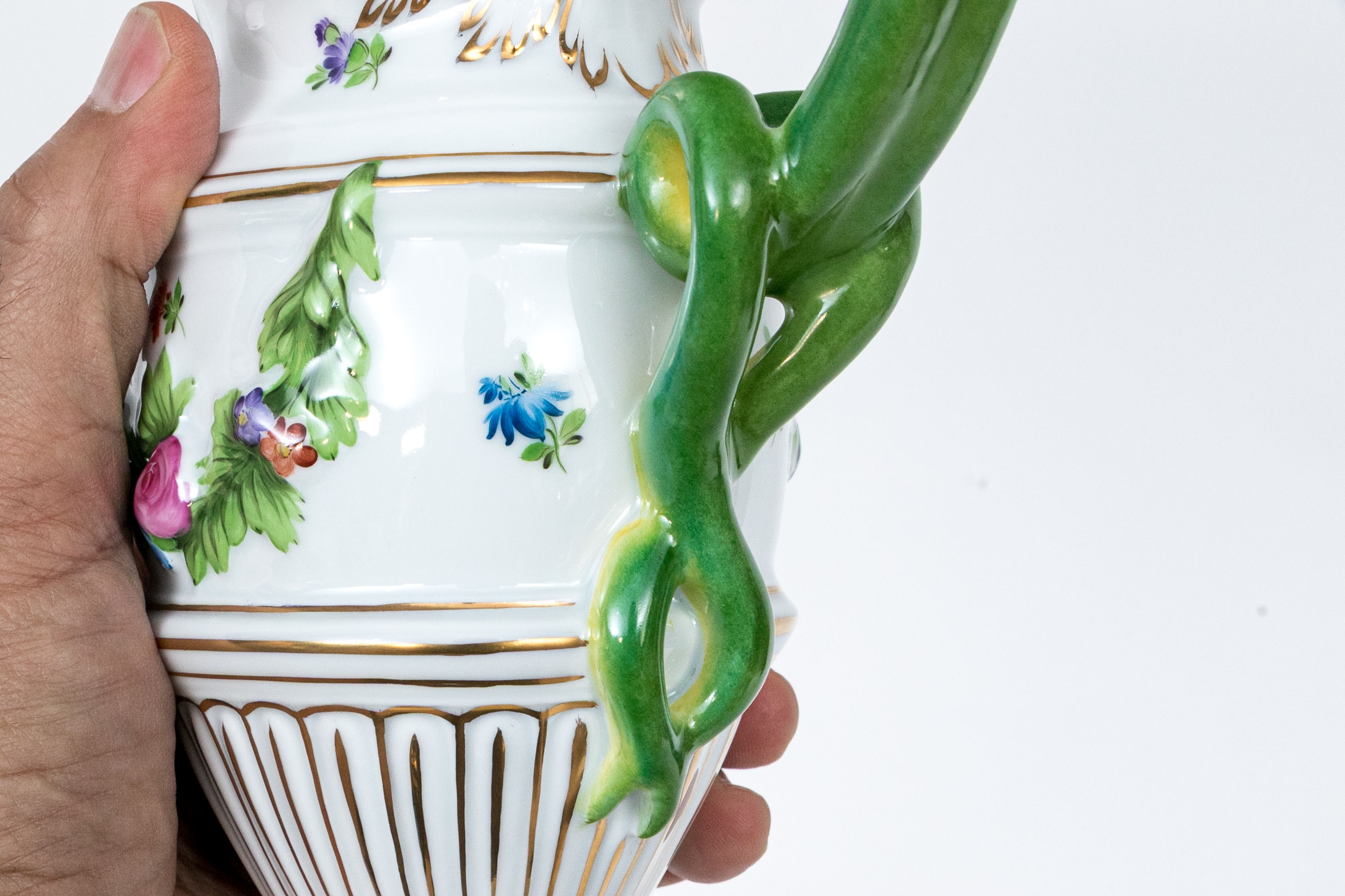 Herend Hungary hand-painted porcelain ewer in the Printemps (PT) pattern, distinguished by its vivid floral decoration, ornate gilding, and dramatic green and violet snake-form handle. The body is richly decorated with hand-painted garden blossoms—roses, violets, and wildflowers—in vibrant shades of pink, blue, purple, and green. The serpent-form handle, glazed in green with subtle violet and turquoise shading, curling gracefully from the rim to the lower body. The dual snake heads rest elegantly at the base of the spout, finely detailed with brown eyes and shaded scales. The ewer’s classical silhouette is enhanced by fluted molding, gilded accents, and a pedestal base trimmed in hand-applied 24K gold.The underside bears the Herend blue shield mark, reading HEREND HUNGARY HANDPAINTED, with additional factory and painter’s marks
