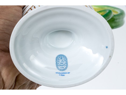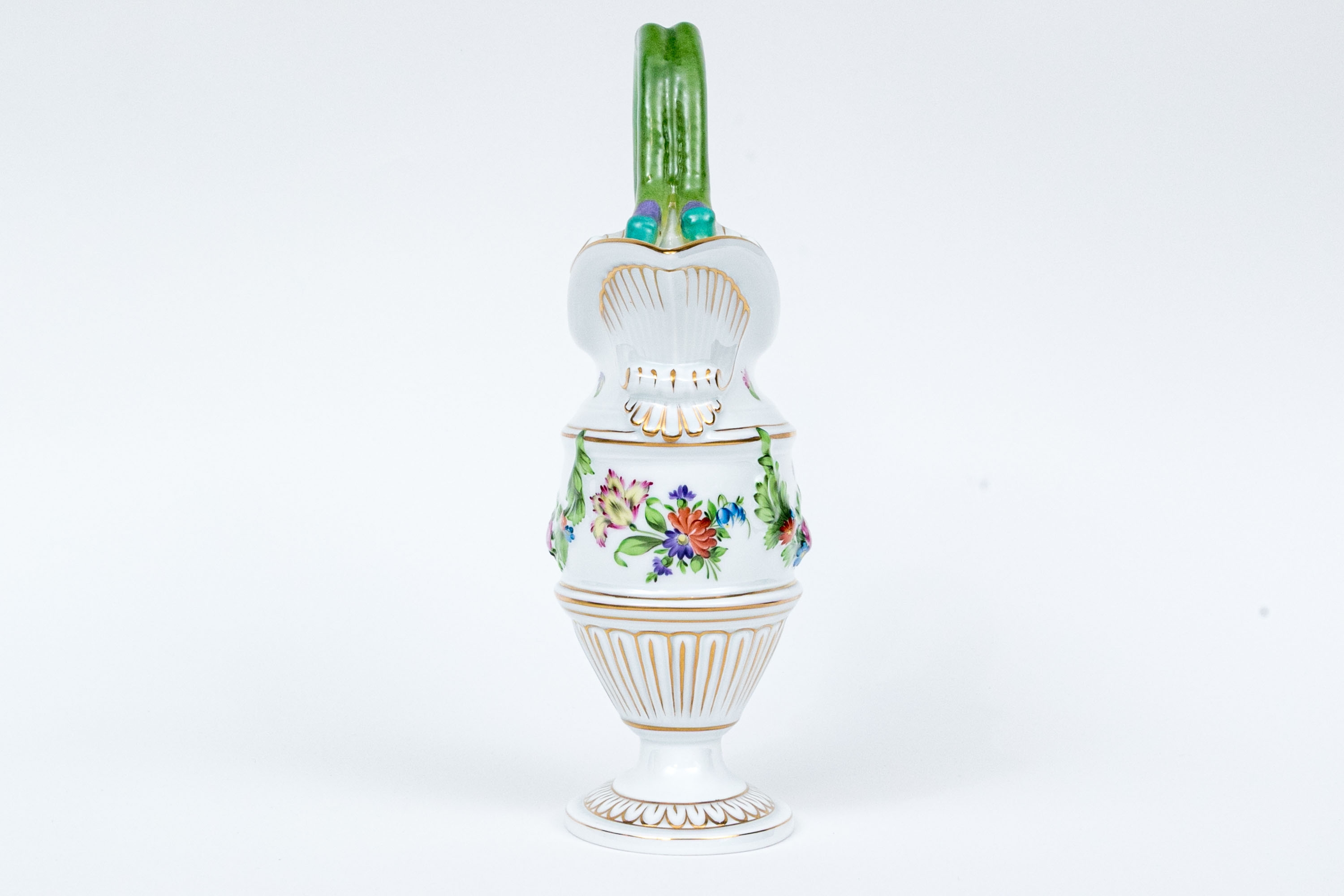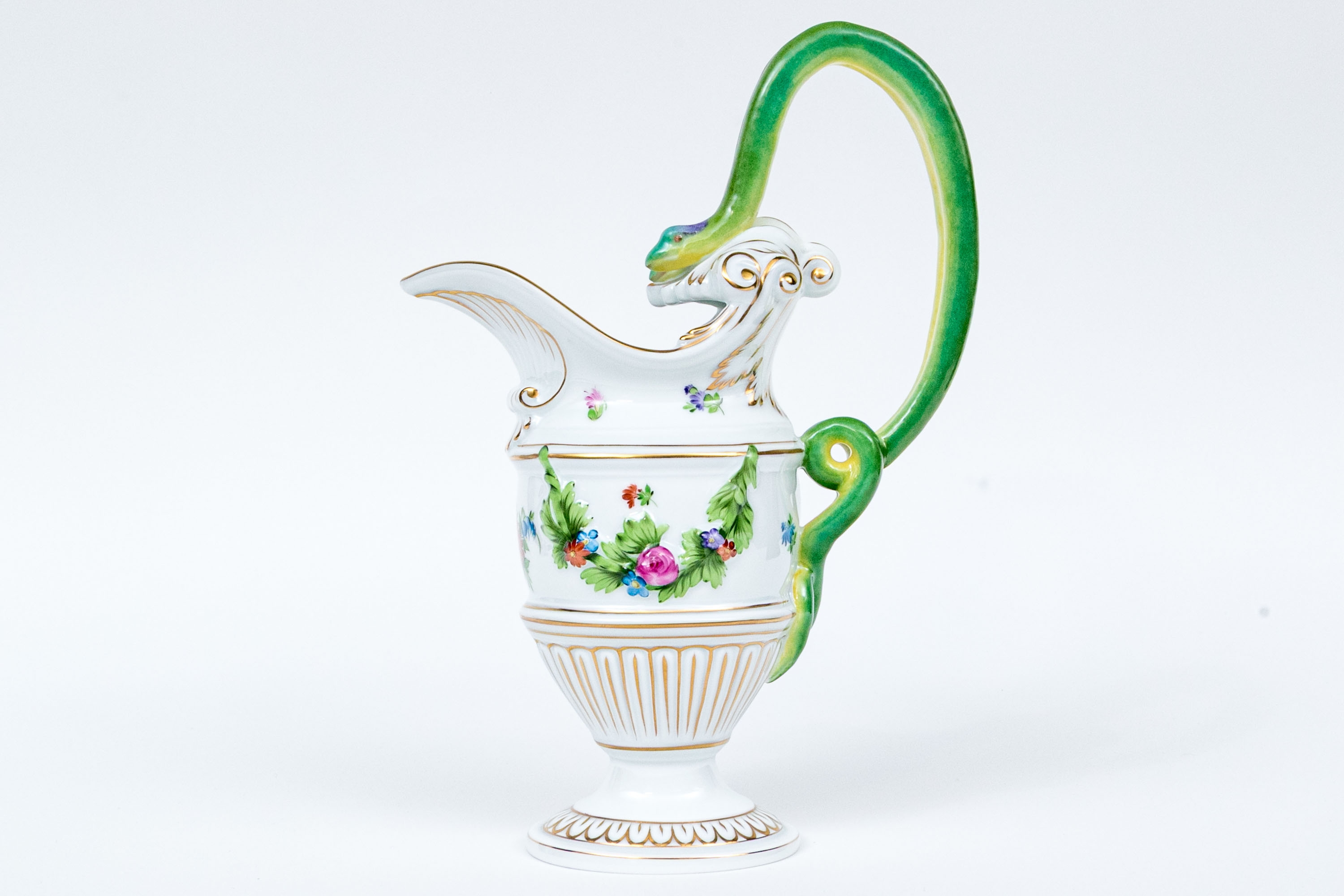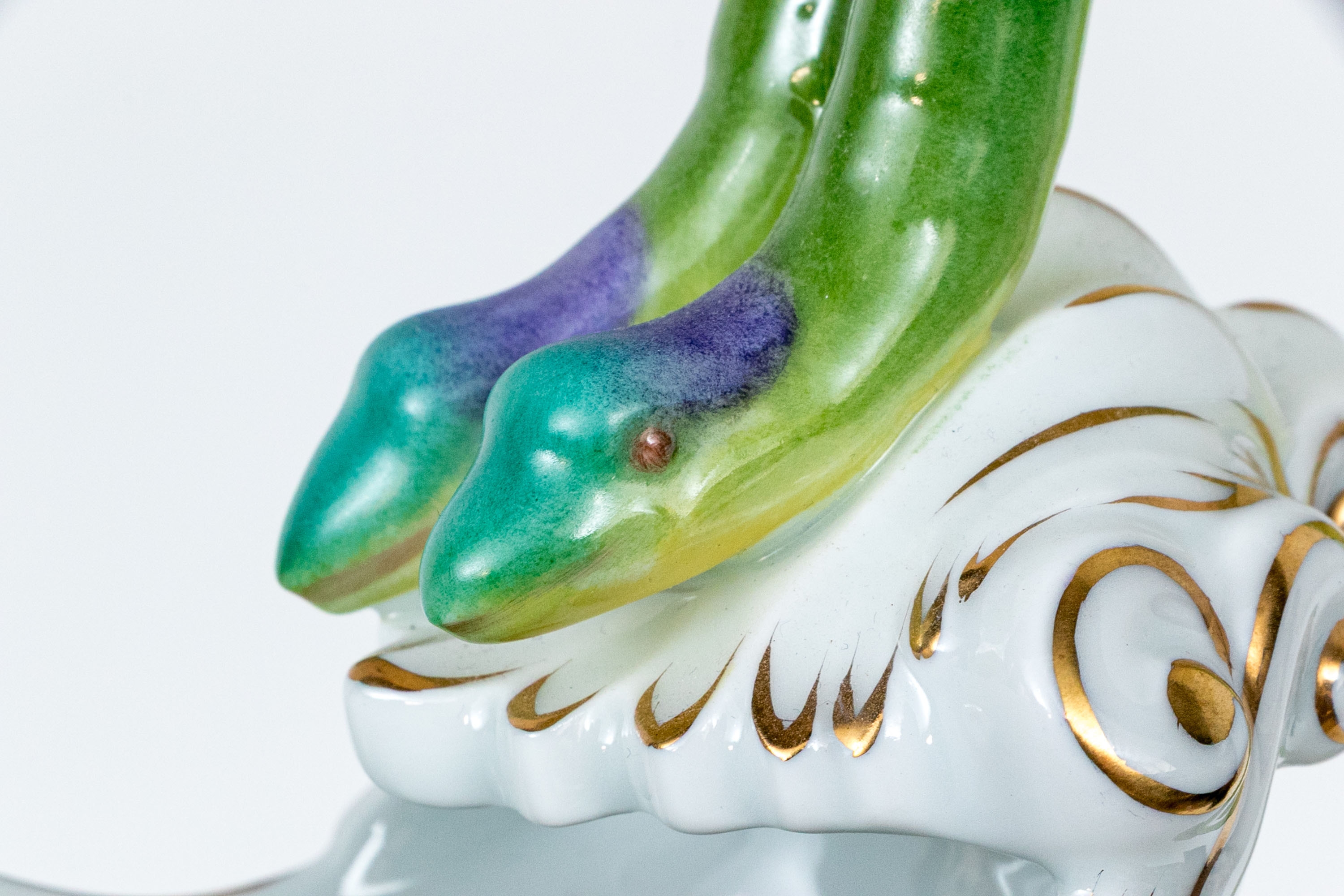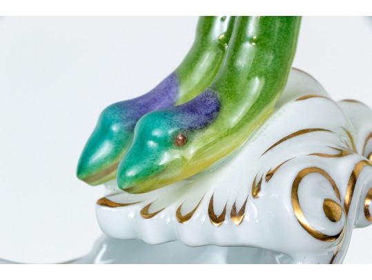 Condition: Excellent overall condition. The porcelain is clean and glossy with no chips, cracks, or restorations. The paintwork remains vivid and precise, and the gilding is bright with minimal handling wear. The intricate snake handle is structurally sound and beautifully preserved, displaying its original high-gloss glaze and coloration.
