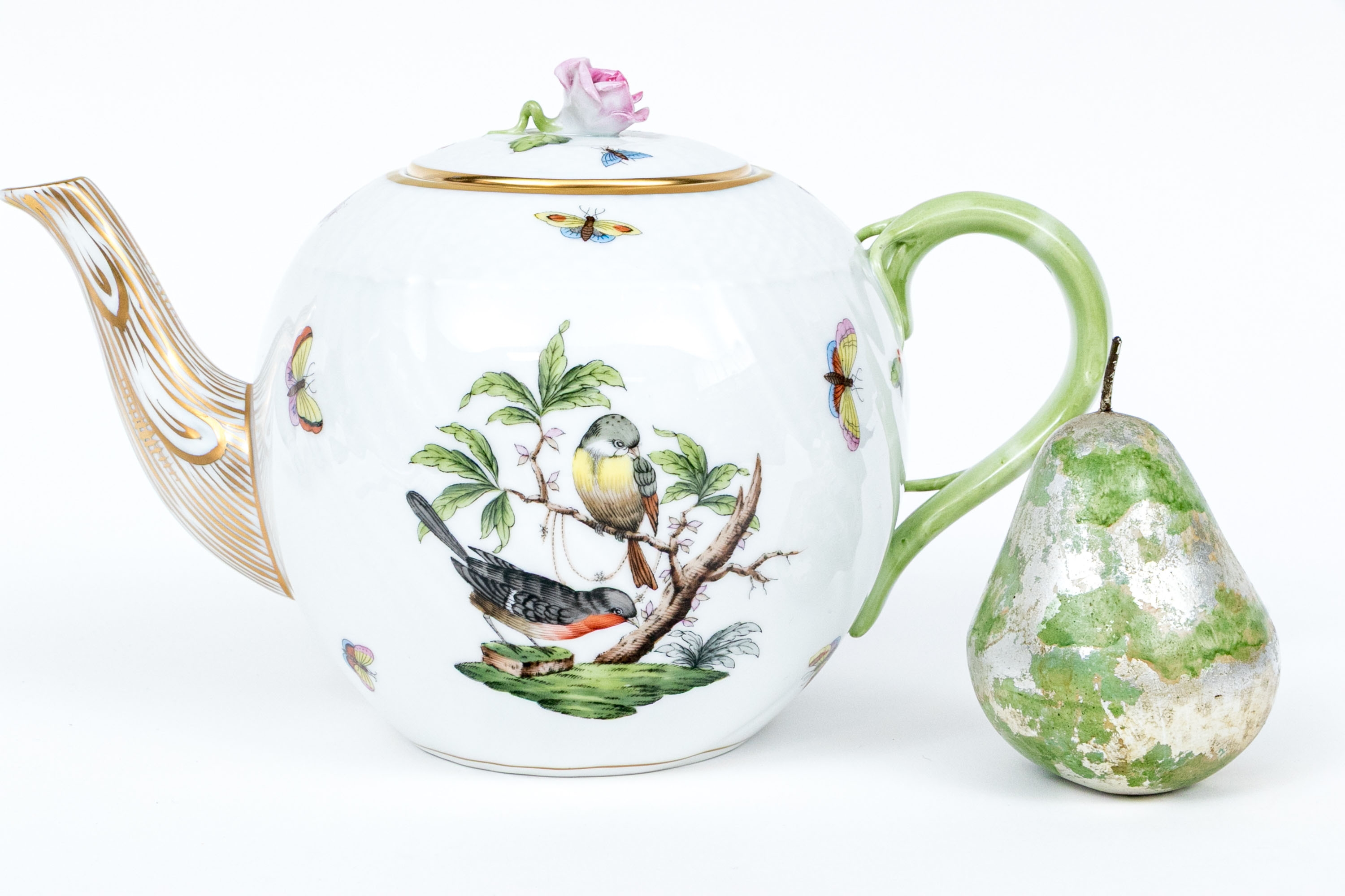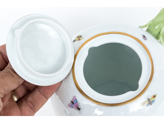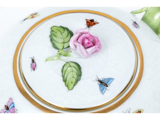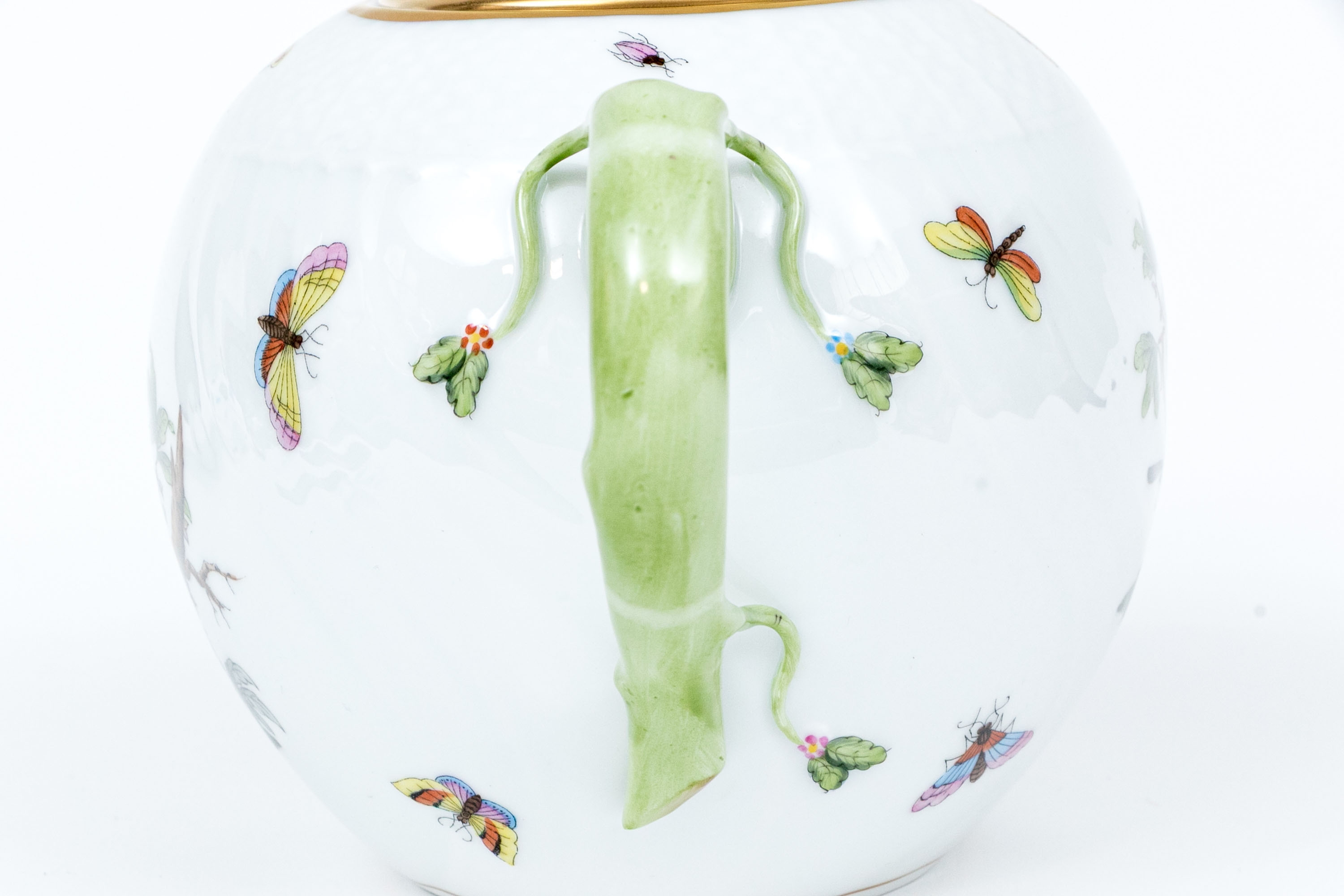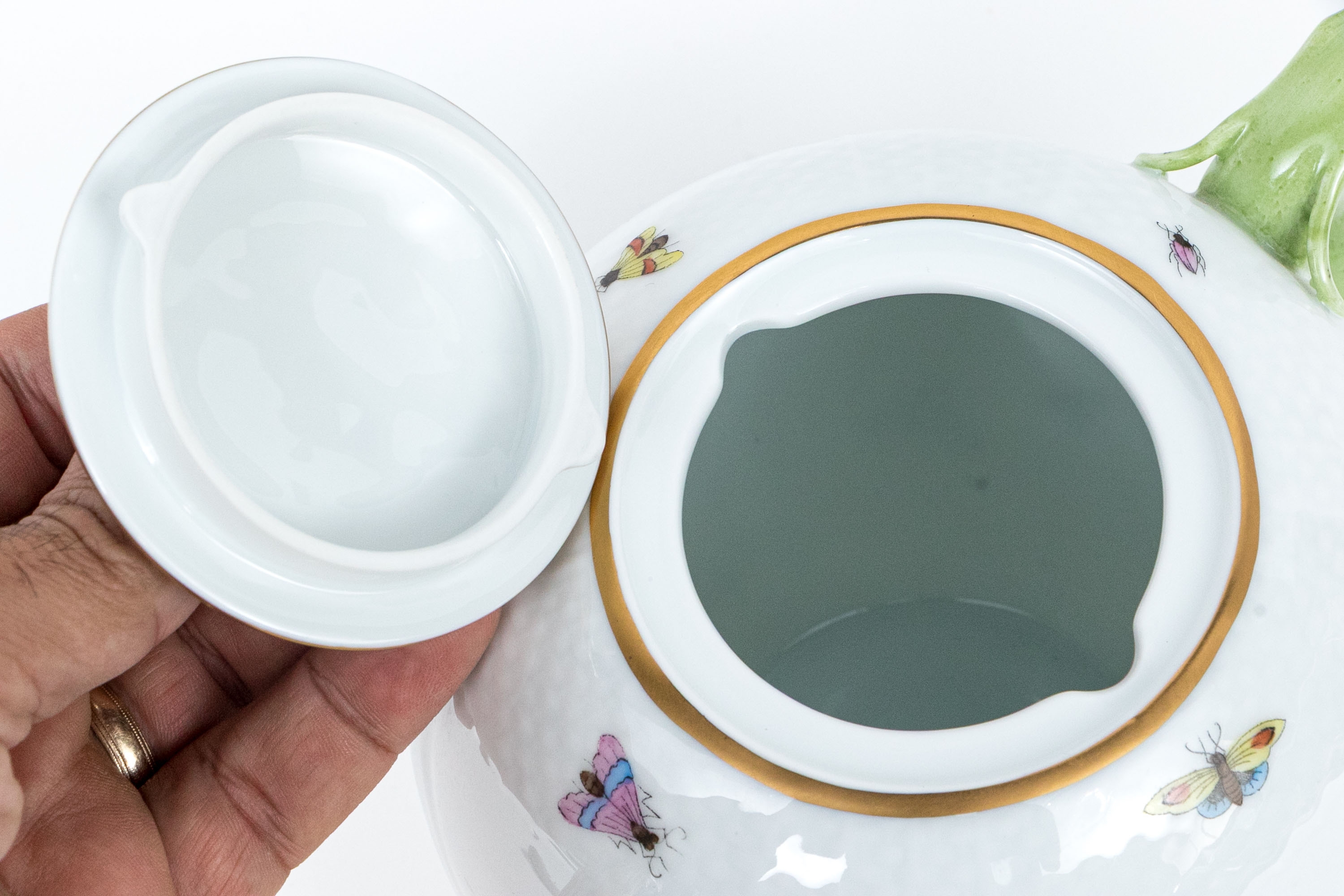 Condition: Excellent overall condition. The teapot shows no chips, cracks, or restorations. The paintwork is pristine, and the gilding remains bright and even. The delicate applied rose and leaves are complete and undamaged. Interior is clean and free of staining or residue. The underside is clean and clearly marked with the Herend hallmark, pattern, and painter’s code. Minimal shelf wear is visible along the unglazed base ring, consistent with careful shelf display