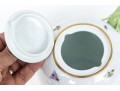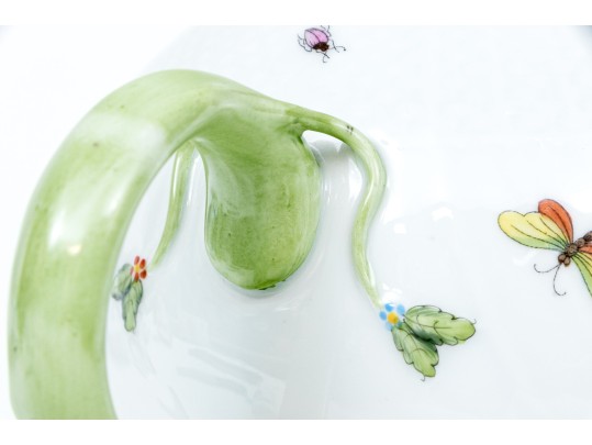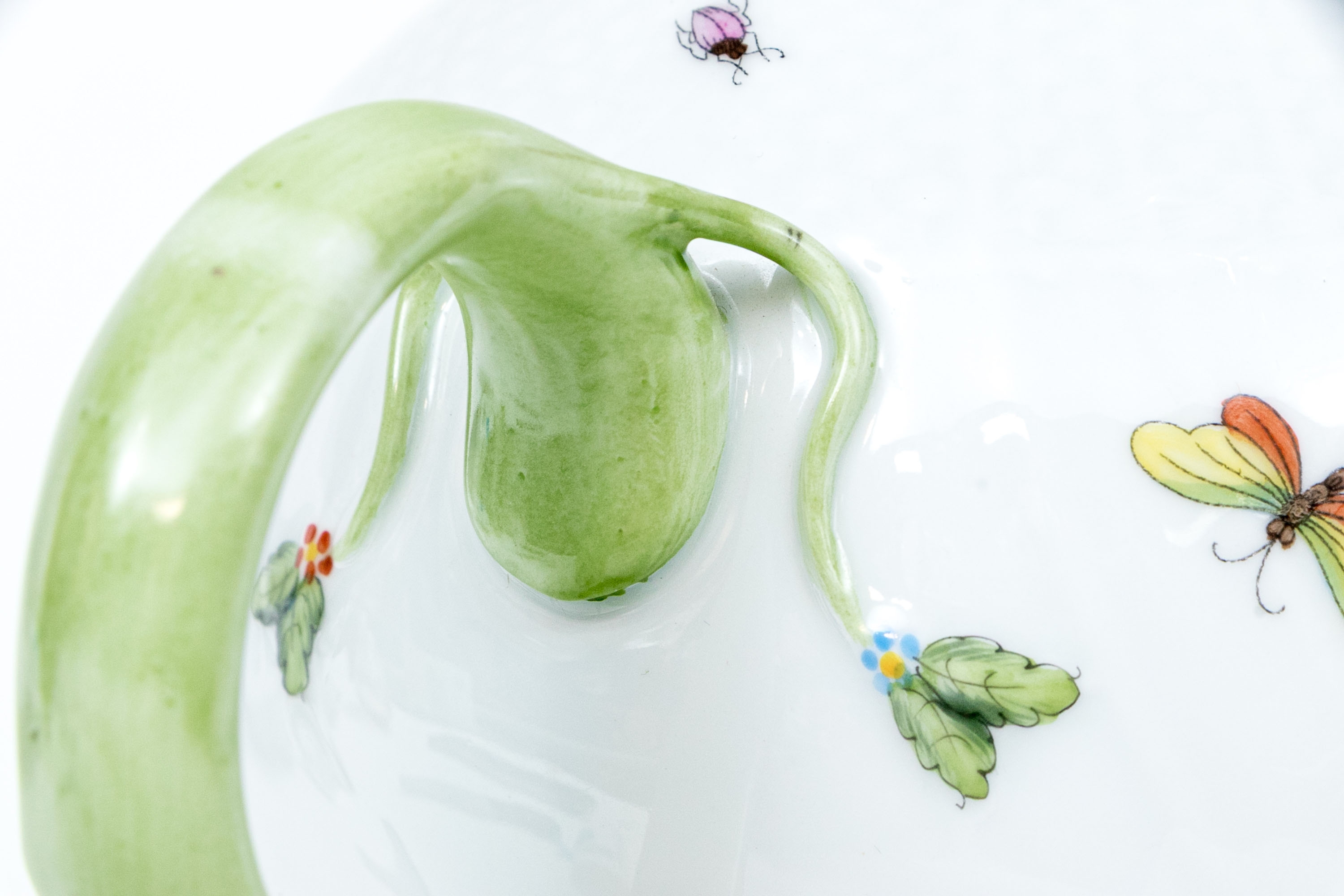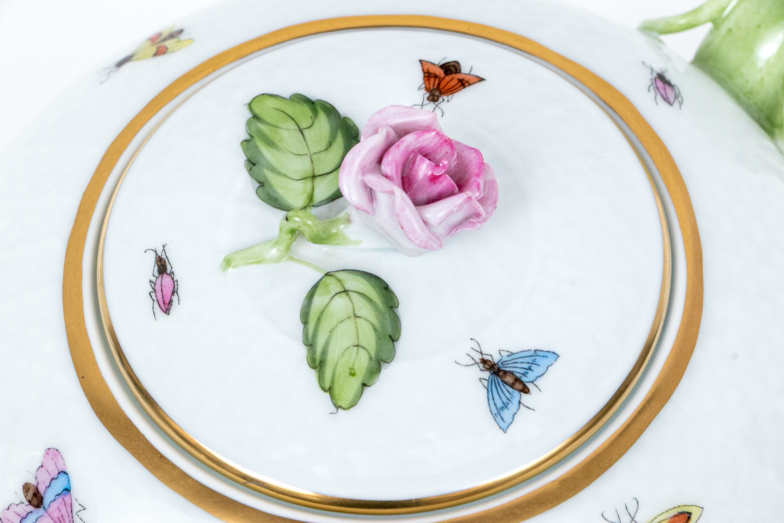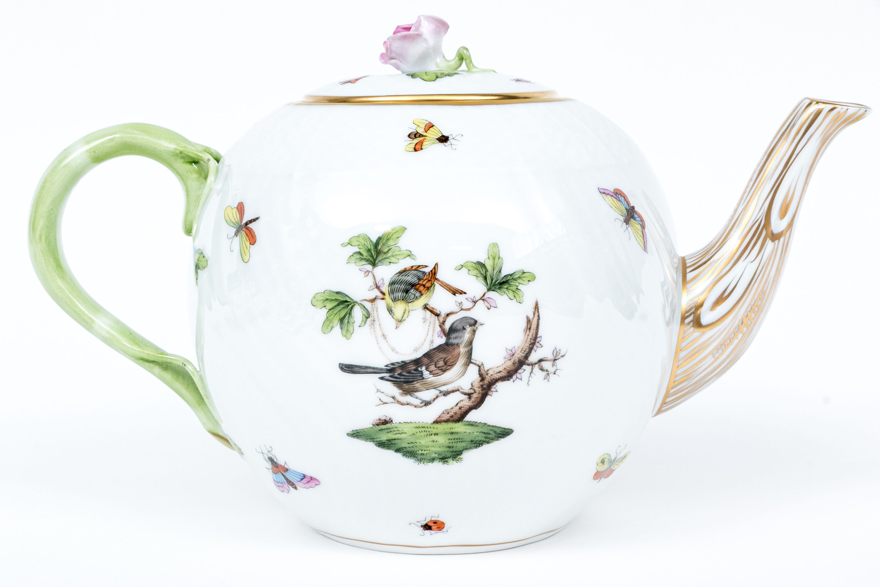 Condition: Excellent overall condition. The teapot shows no chips, cracks, or restorations. The paintwork is pristine, and the gilding remains bright and even. The delicate applied rose and leaves are complete and undamaged. Interior is clean and free of staining or residue. The underside is clean and clearly marked with the Herend hallmark, pattern, and painter’s code. Minimal shelf wear is visible along the unglazed base ring, consistent with careful shelf display