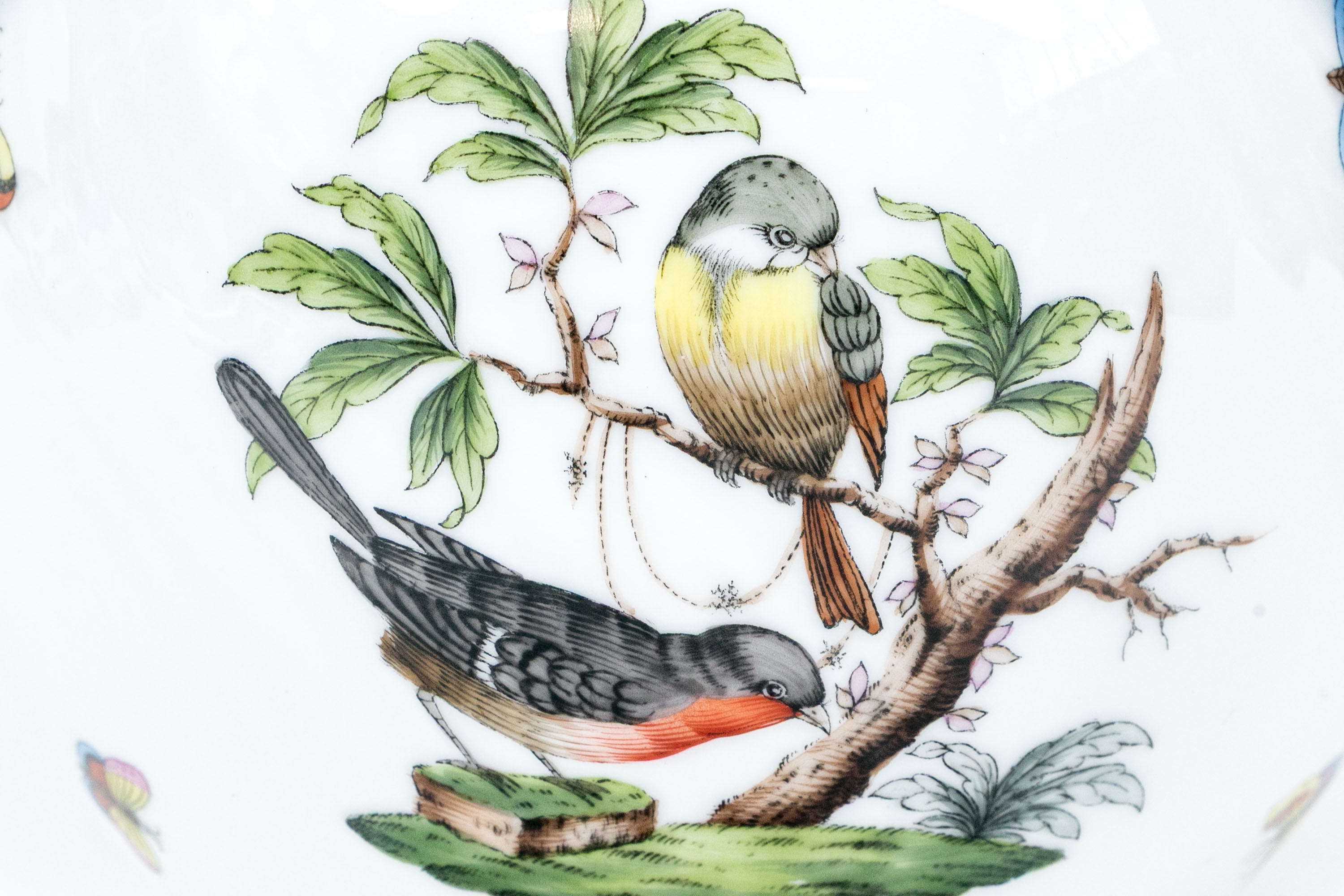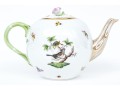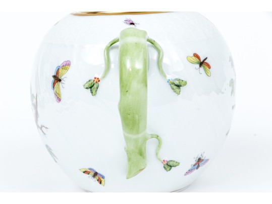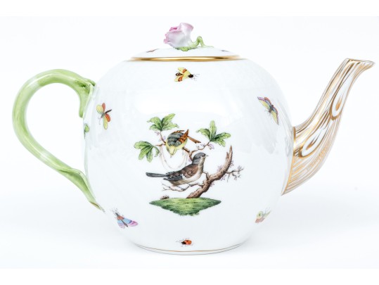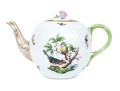 Herend Hungary hand-painted porcelain teapot in the Rothschild Bird (RO) pattern, decorated with vibrant avian and insect motifs and enriched with 24K gold accents. The bulbous white porcelain body is adorned with the famous Rothschild Bird design, depicting pairs of colorful songbirds perched on leafy branches with necklace. Surrounding them are delicate butterflies, beetles, and dragonflies, all rendered in vivid enamel hues and fine detail.