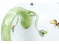 The spout is elongated and gracefully arched, decorated with a hand-painted gold bark design. The handle is sculpted in a naturalistic branch form glazed in soft green, embellished with small applied leaf and flower buds.