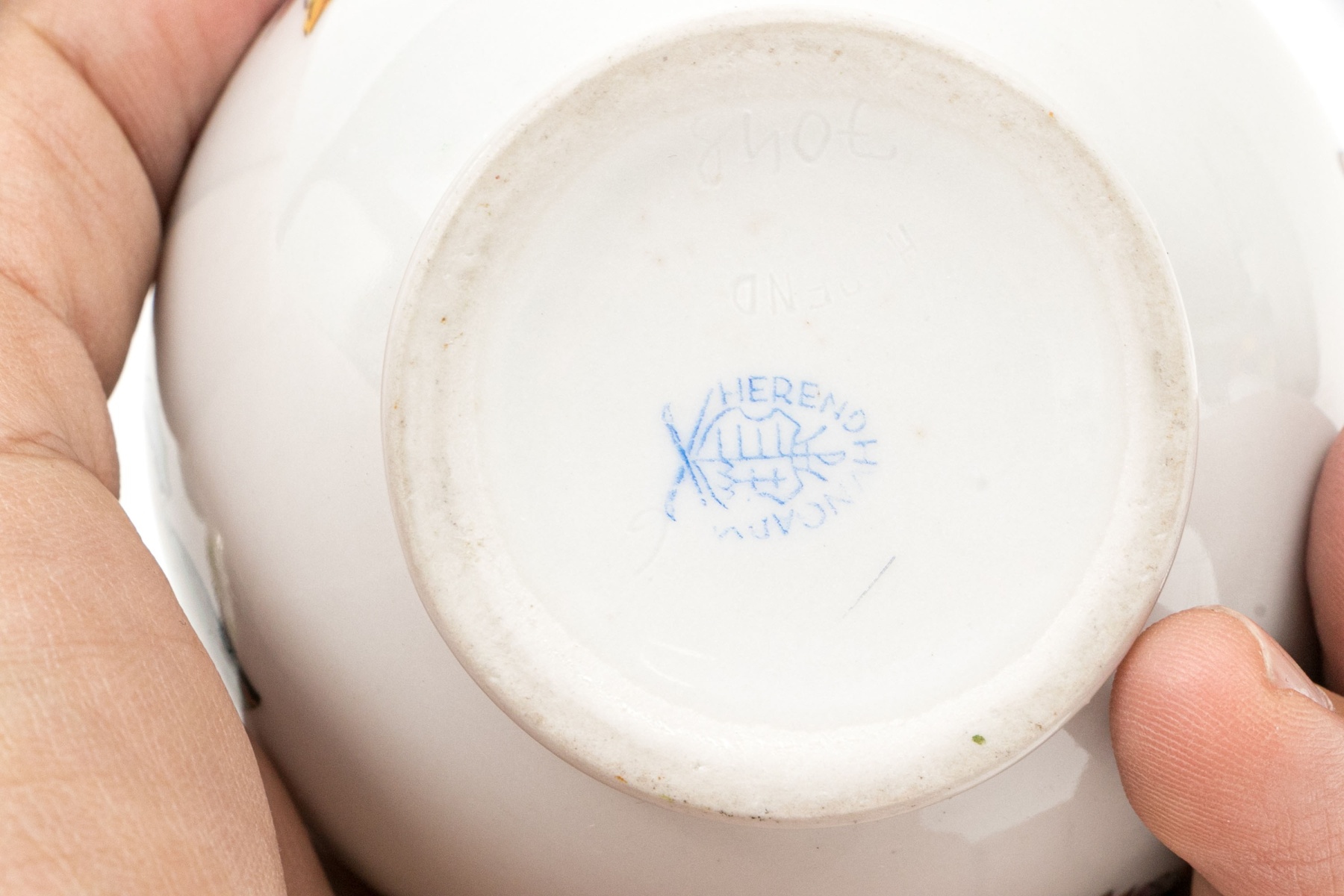 The rim is finished with a green and gold scalloped border, a hallmark of the Queen Victoria motif. The base is marked with the Herend Hungary blue shield, HANDPAINTED.