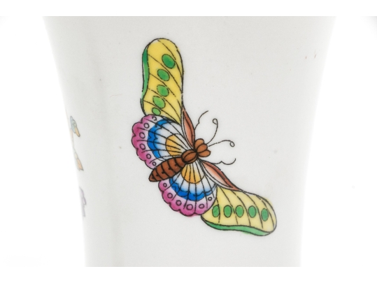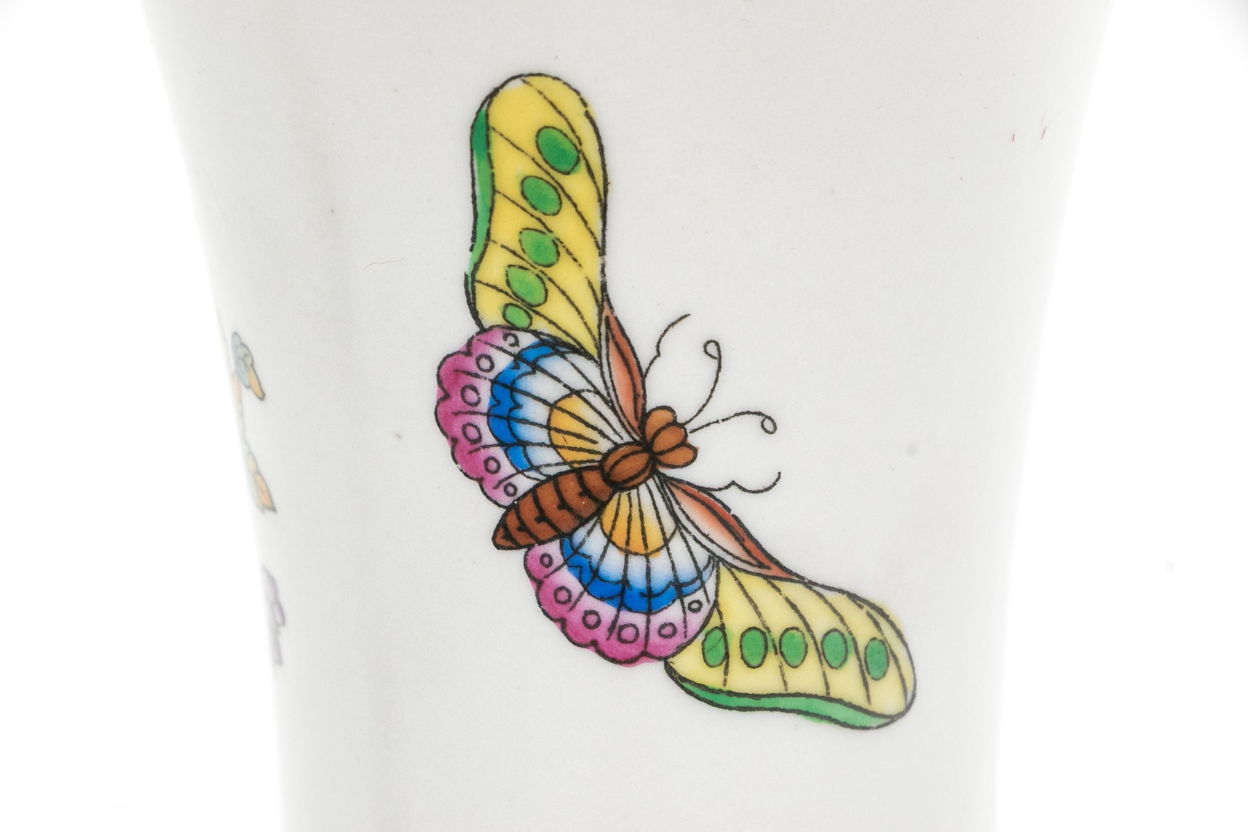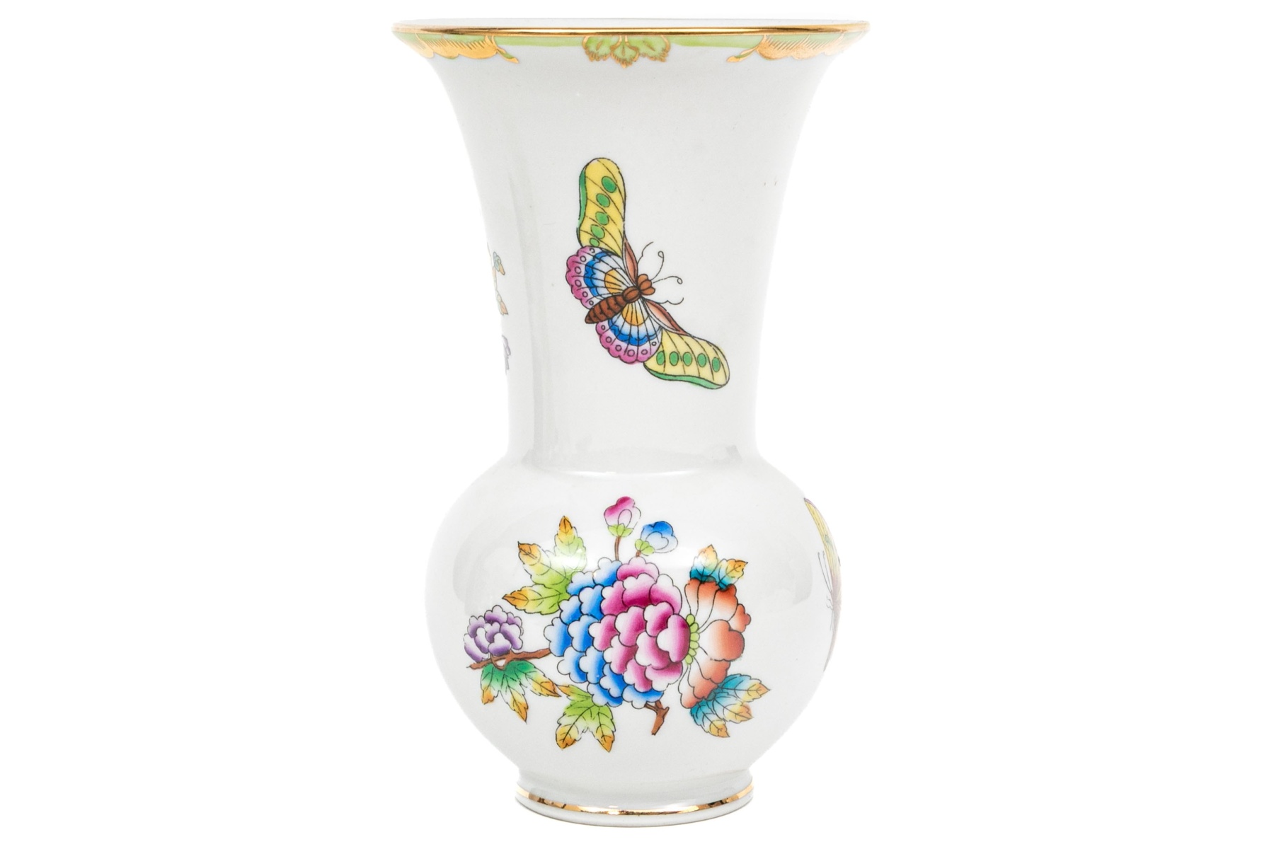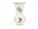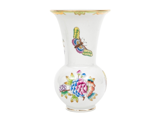 A finely crafted Herend porcelain vase of elegant baluster form with a flared rim, decorated in the Queen Victoria (VBO) pattern. The design features vivid hand-painted butterflies and multicolored peonies, executed in Herend’s signature bright palette of greens, yellows, pinks, blues, and oranges.