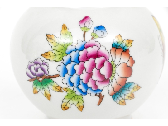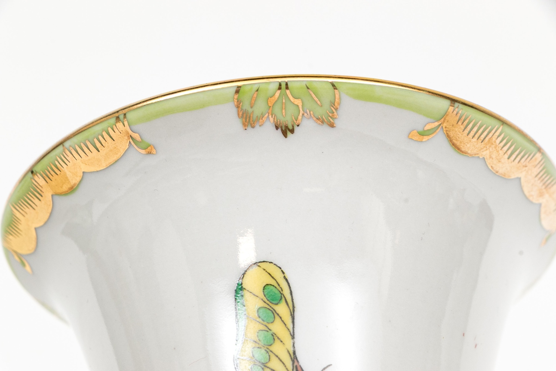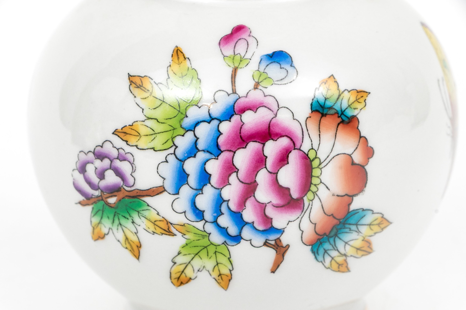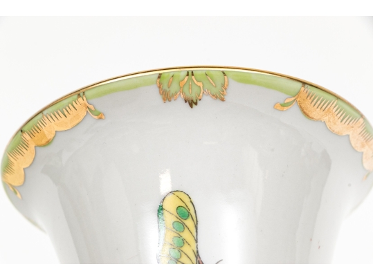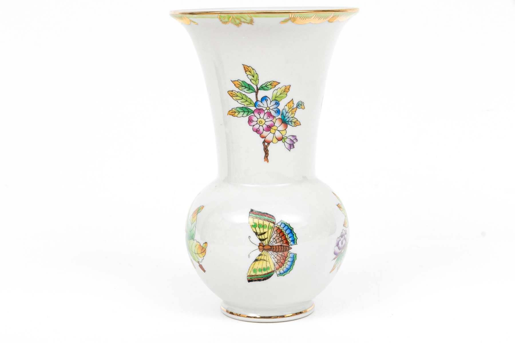 A finely crafted Herend porcelain vase of elegant baluster form with a flared rim, decorated in the Queen Victoria (VBO) pattern. The design features vivid hand-painted butterflies and multicolored peonies, executed in Herend’s signature bright palette of greens, yellows, pinks, blues, and oranges.