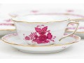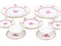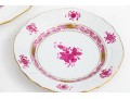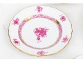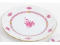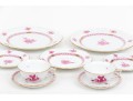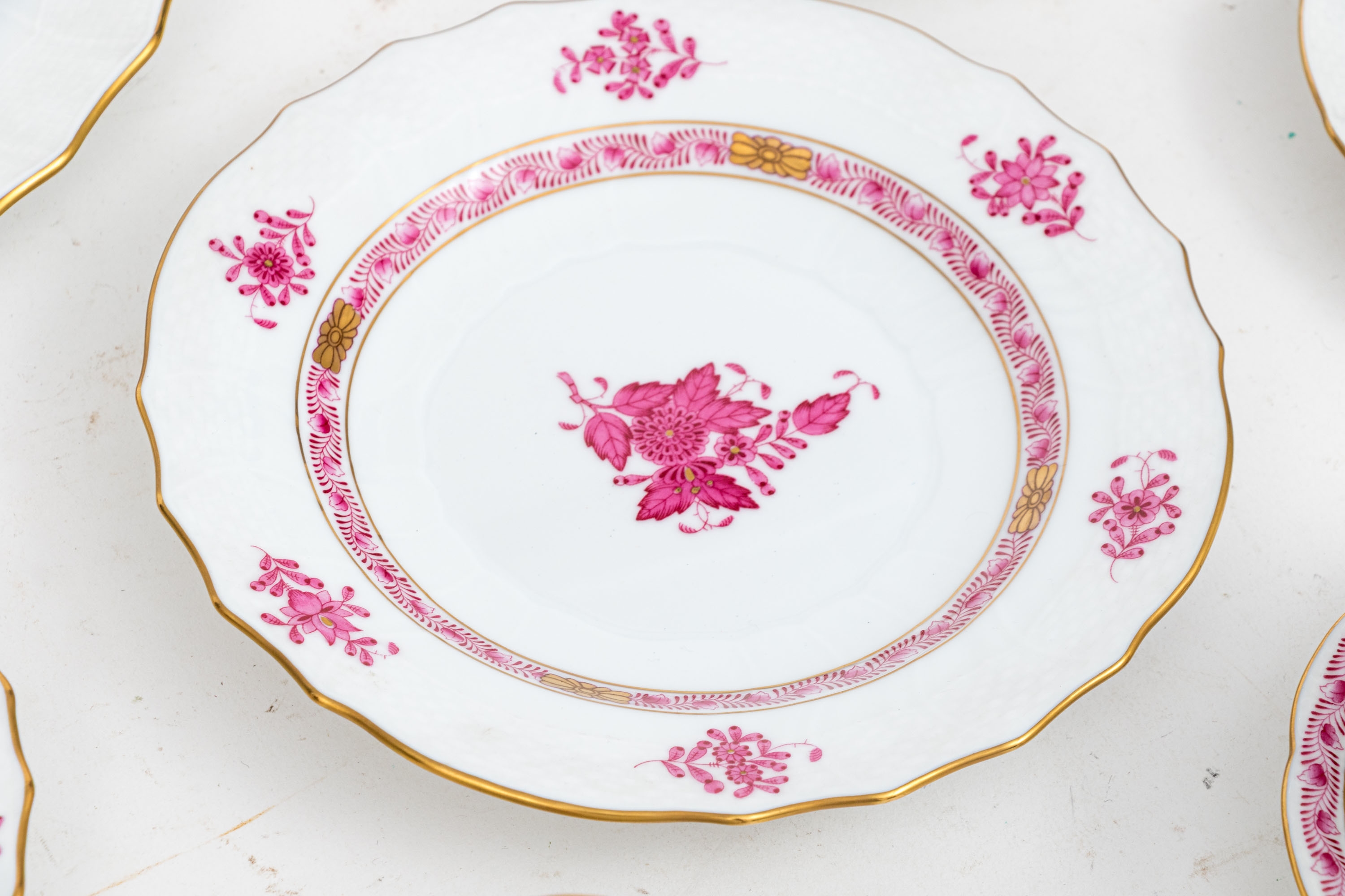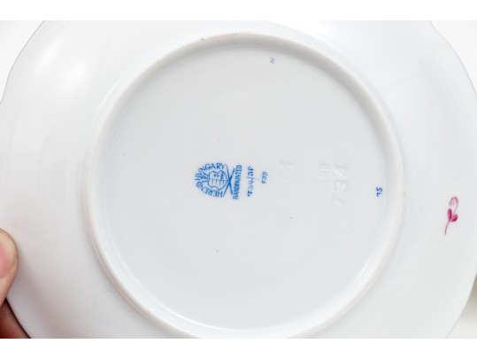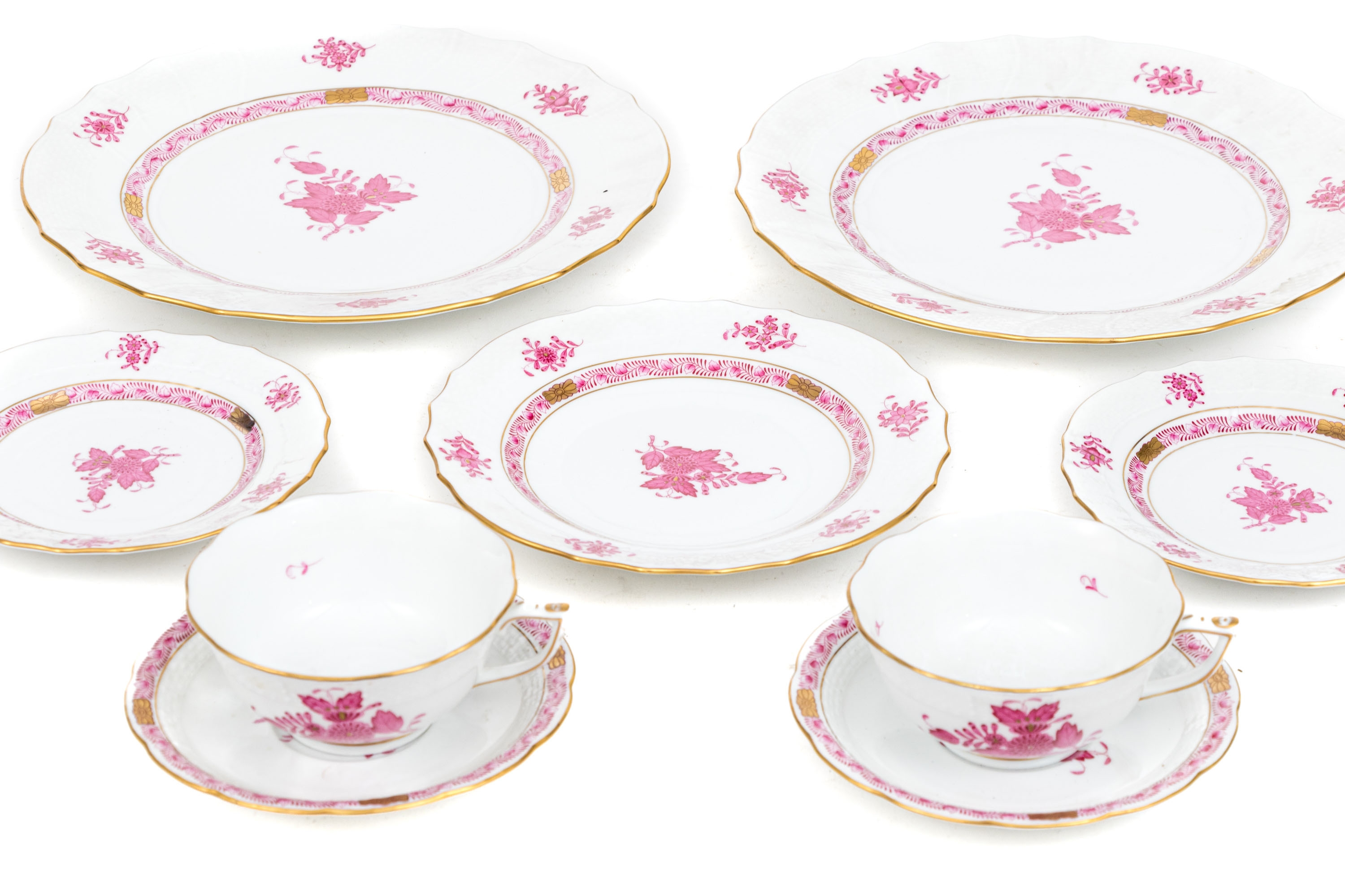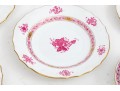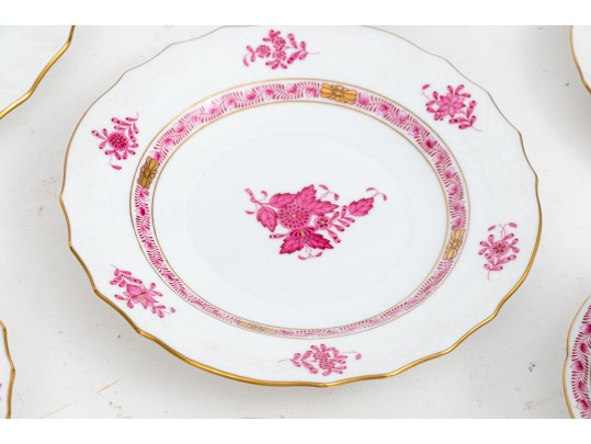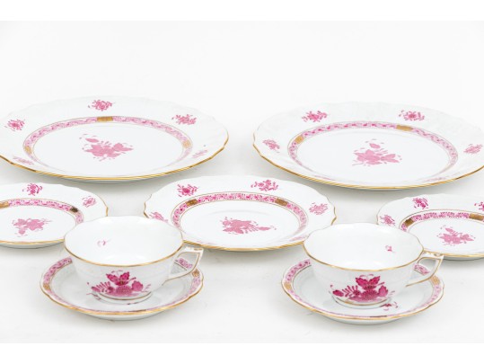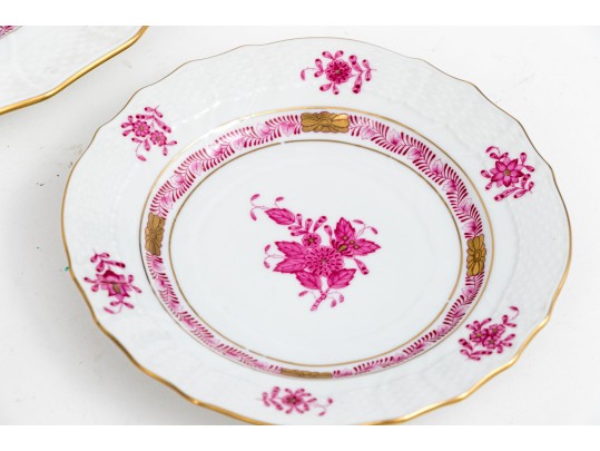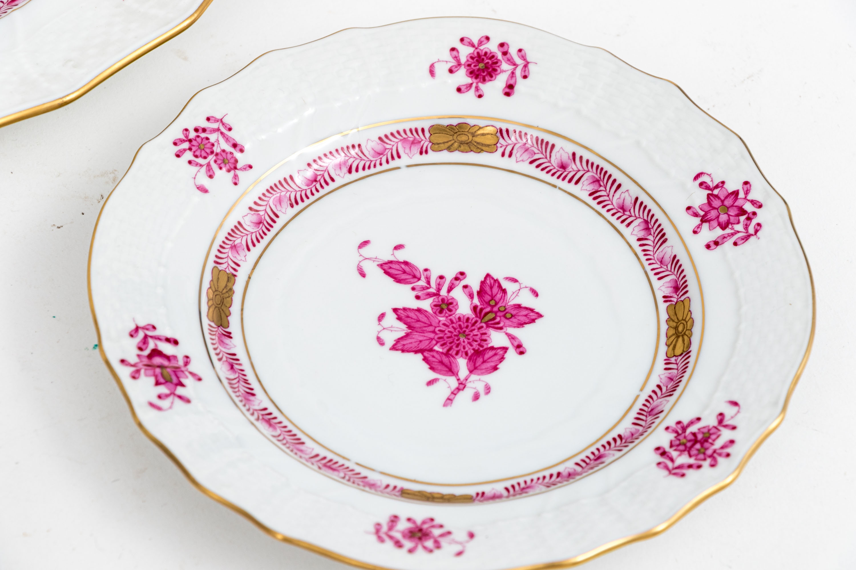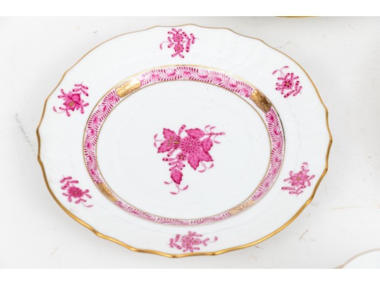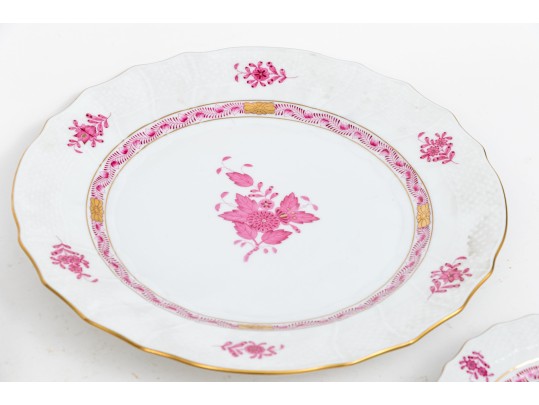 A collection of Herend "Chinese Bouquet Raspberry" porcelain designed with elegantly scalloped and gilt rims with subtle woven textures, decorated throughout with pretty monochromatic pink floral sprays with gilt floral accents. Marked underfoot.