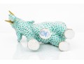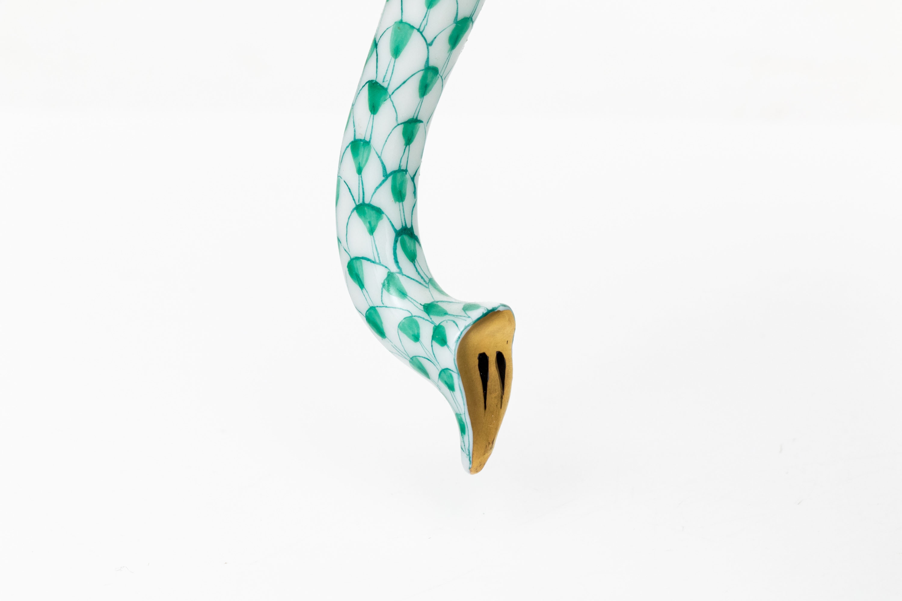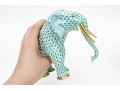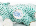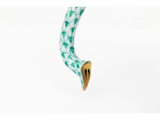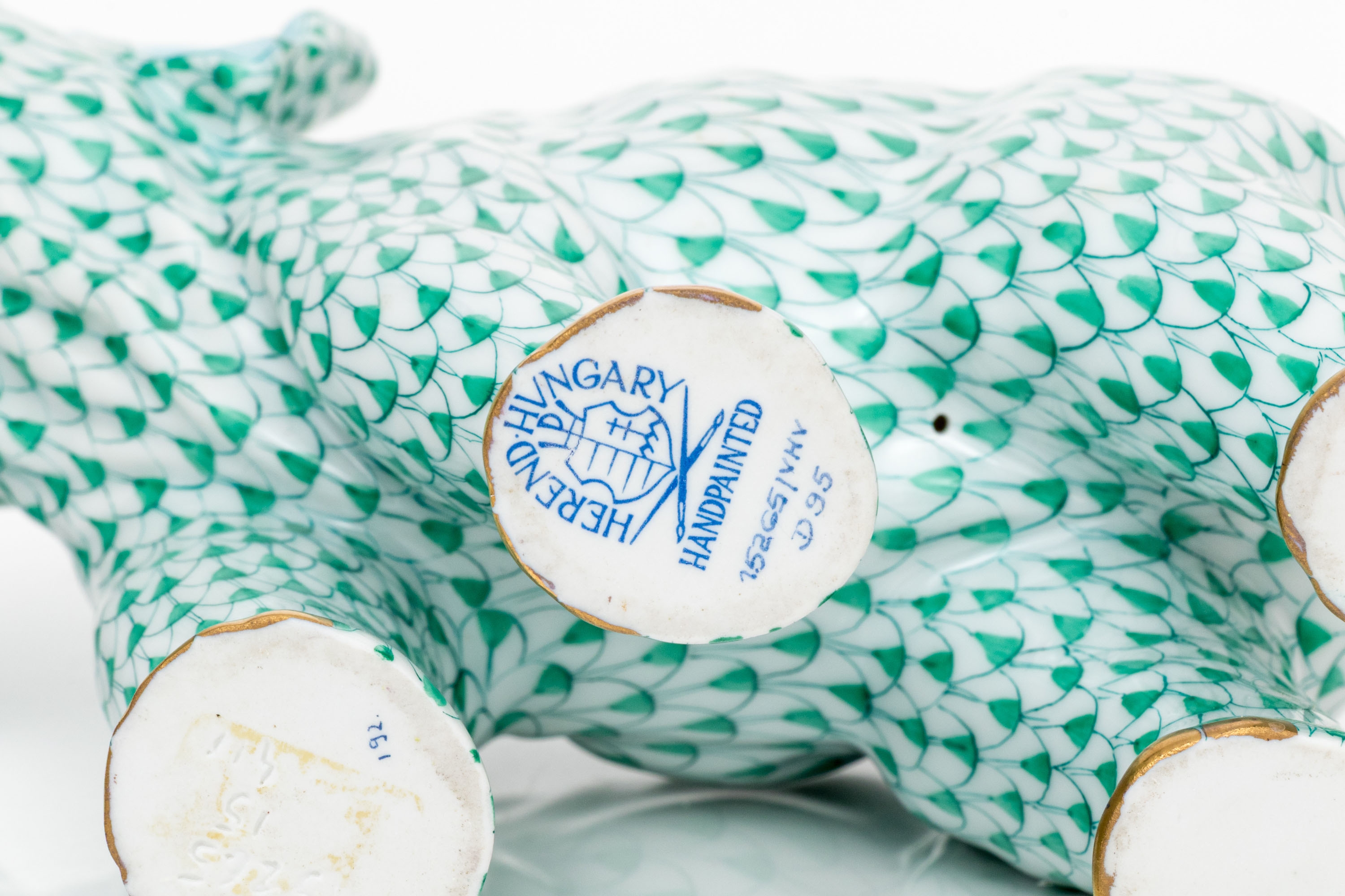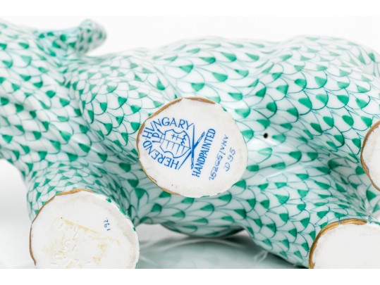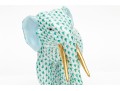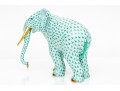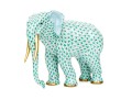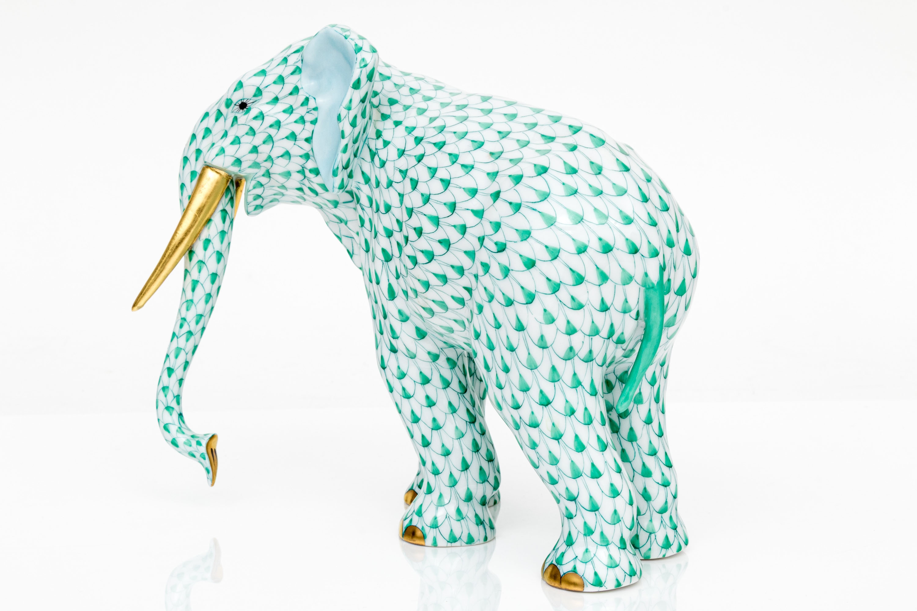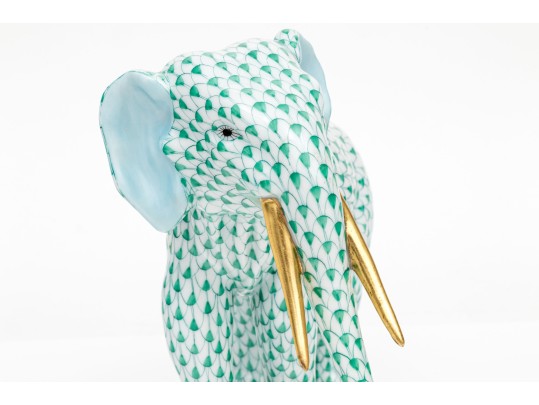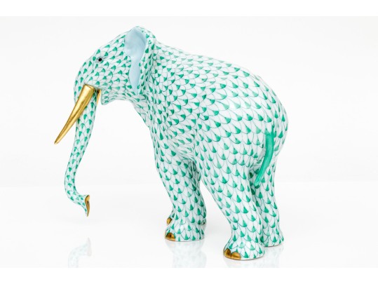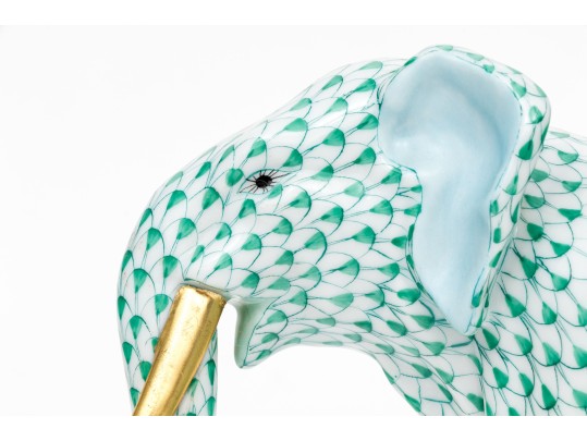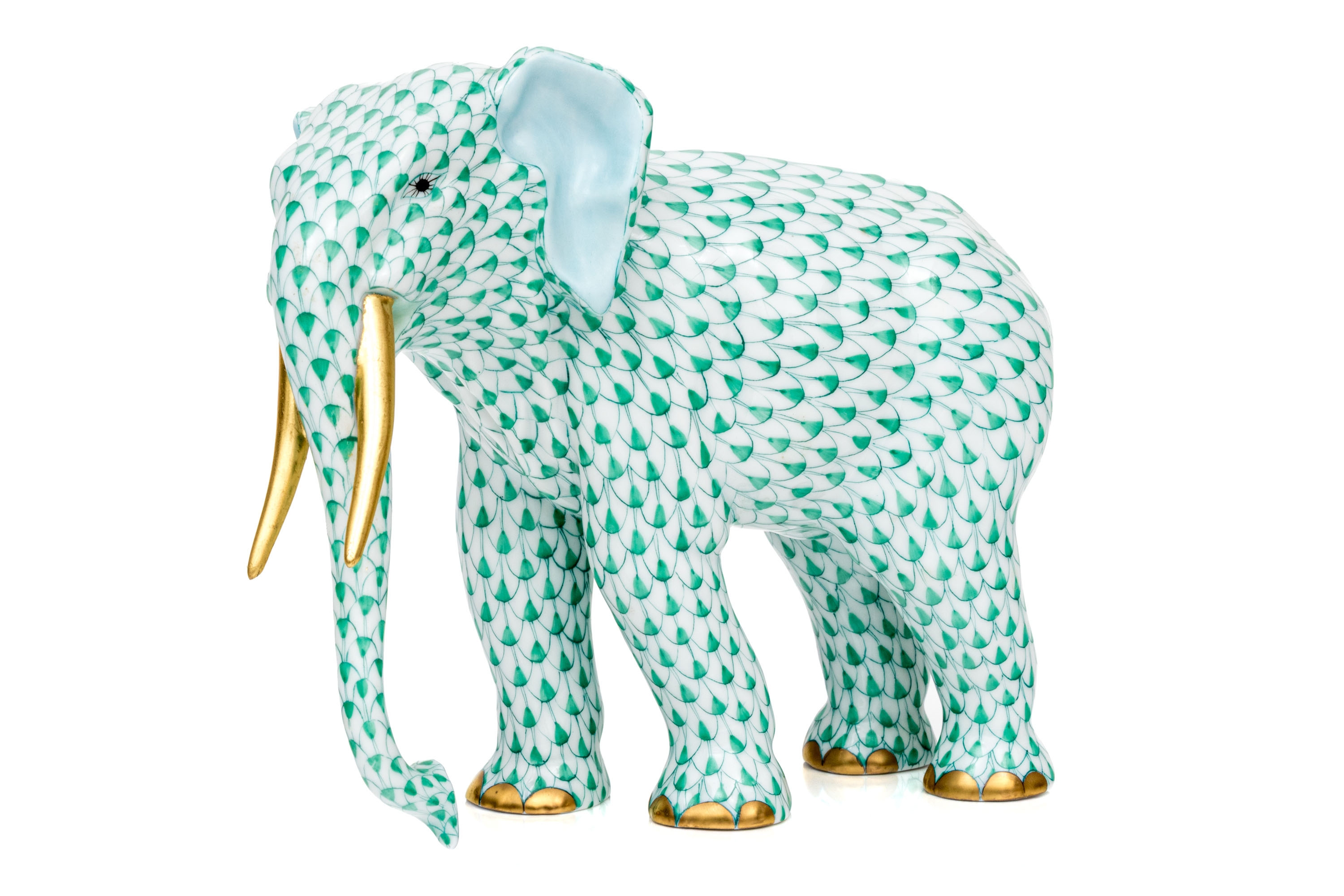 A majestic and large Herend porcelain elephant figure, hand-painted in the classic green fishnet pattern with 24K gold tusks, toes, and accents. The elephant has a gently upturned trunk, and pale blue interior ears that soften the bold geometric pattern. His head tilts slightly to the left. Underside with Herend Hungary blue shield stamp, “HANDPAINTED” mark, and painted model number 15265/VHV.