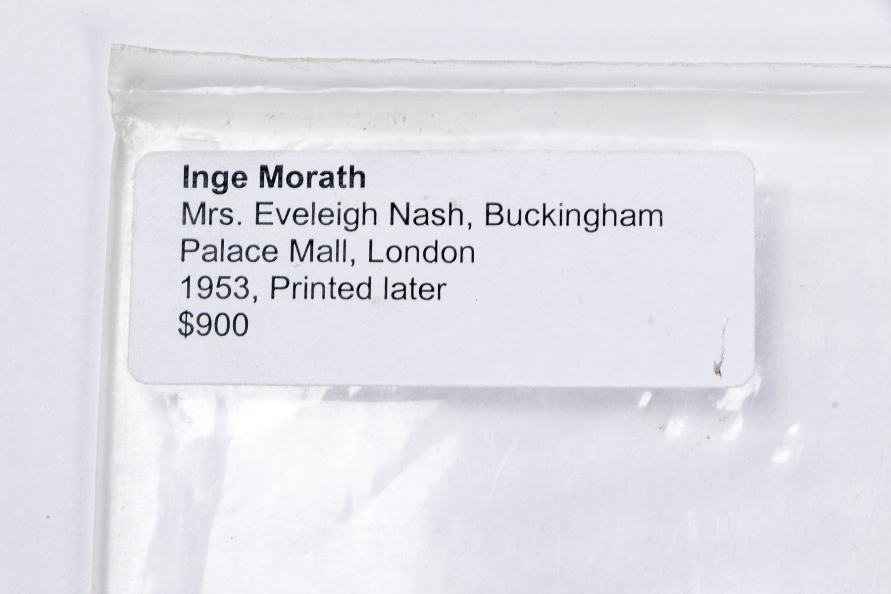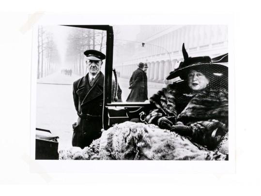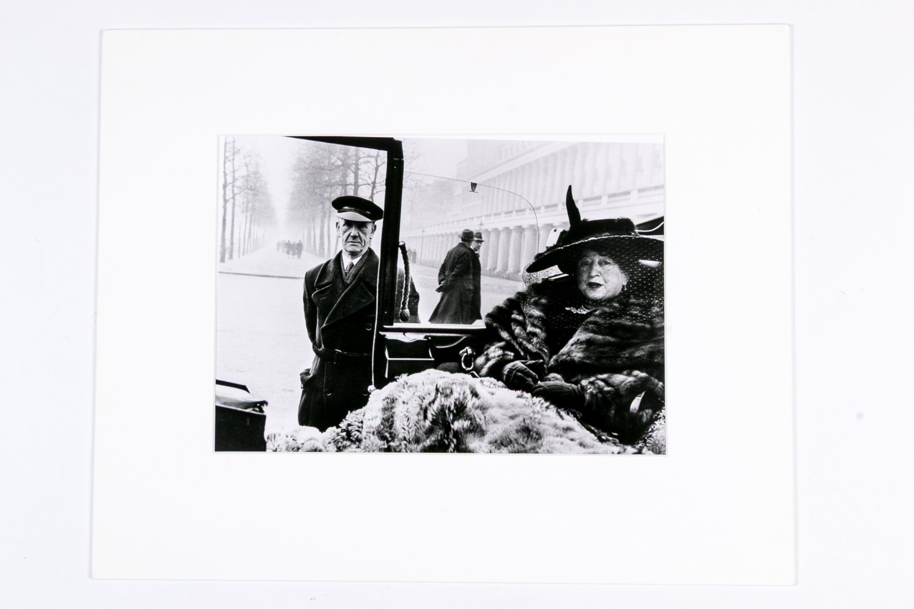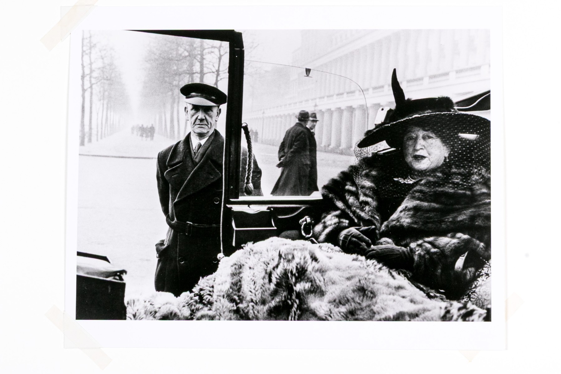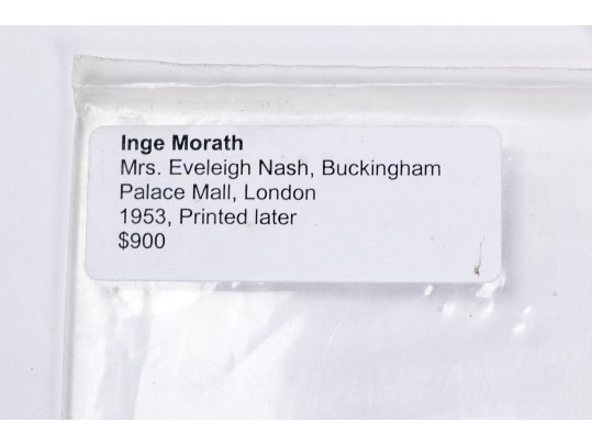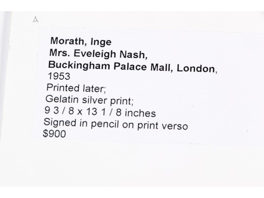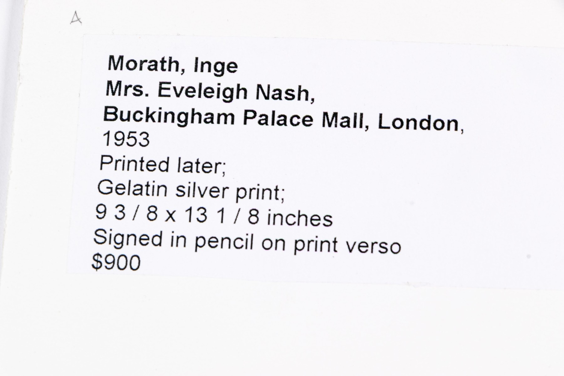 "Mrs. Eveleigh Nash, Buckingham Palace Mall, London, 1953" gelatin silver print depicting a woman in ornate fur and a feathered hat sitting in a car while men walk by urban architecture and a tree-lined path in the background. Pencil signed and bearing a label denoting the piece as being printed later and a original gallery price of $900. Unframed.