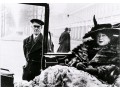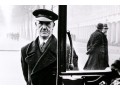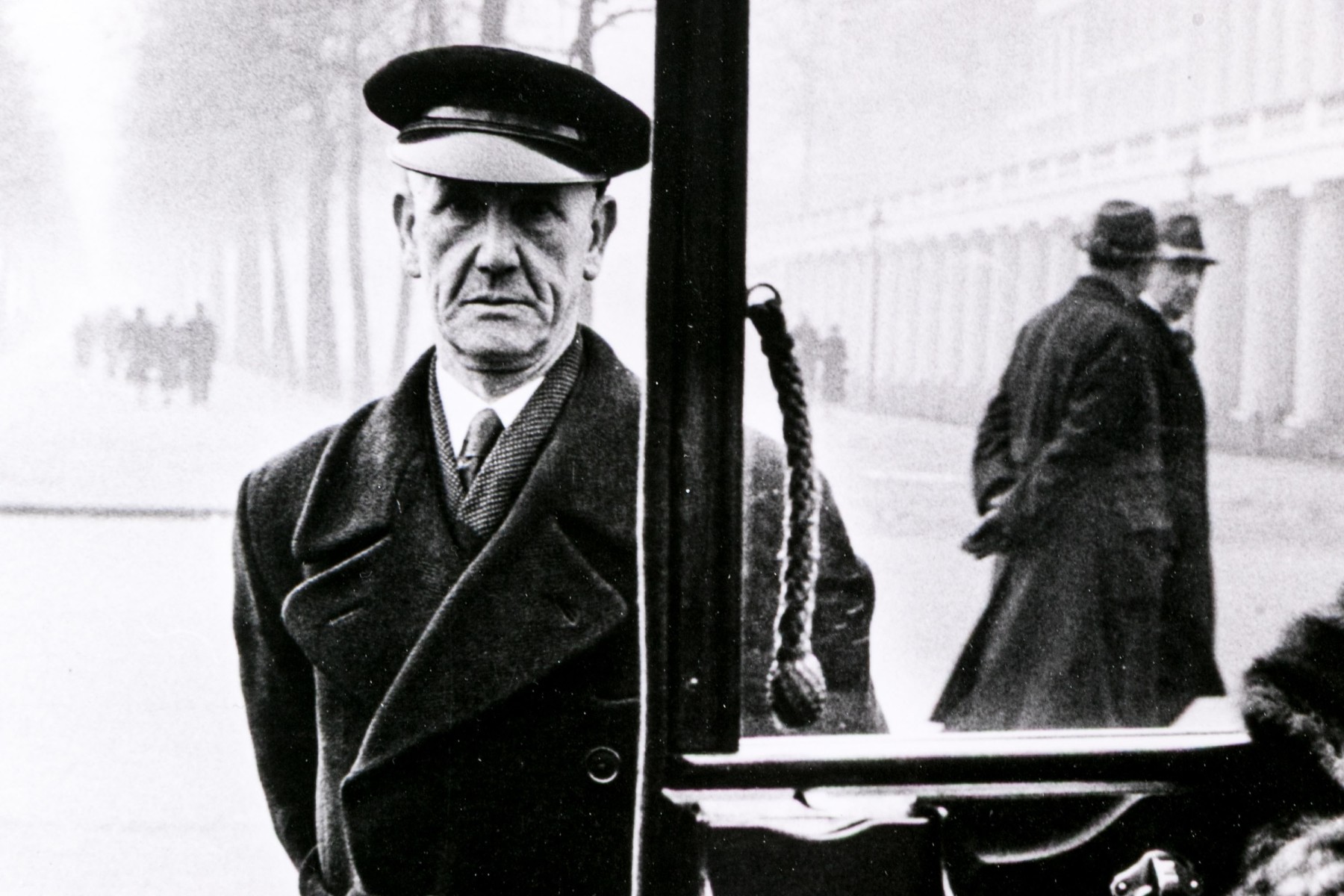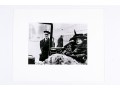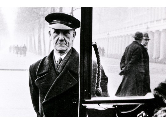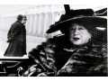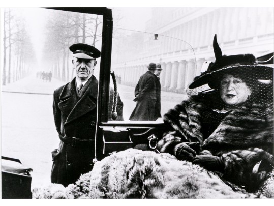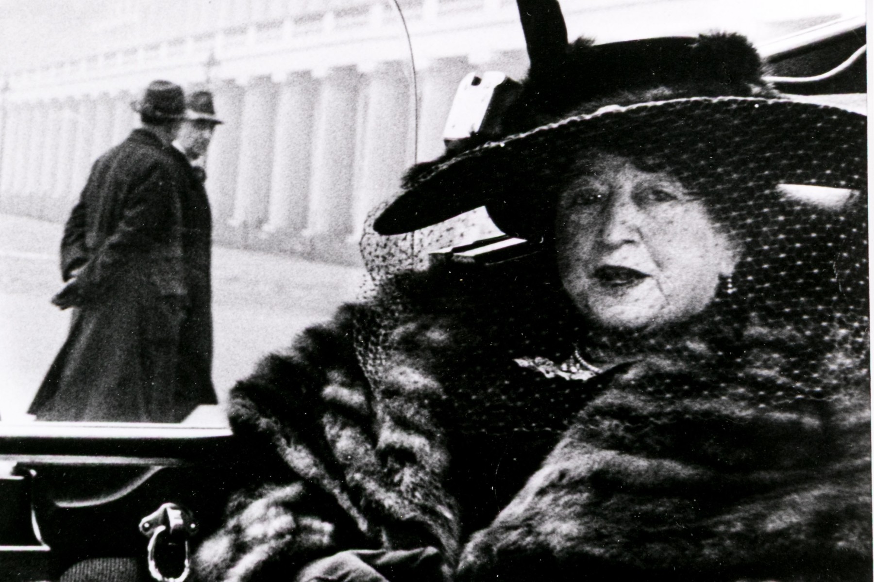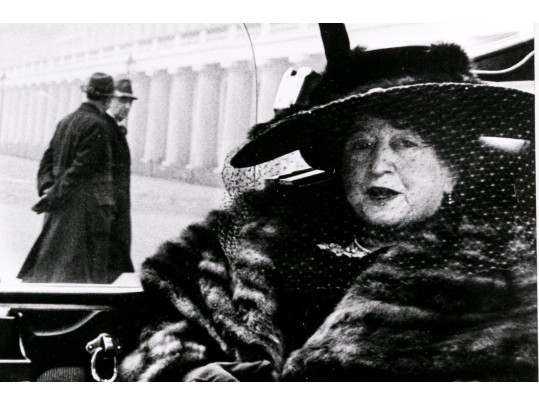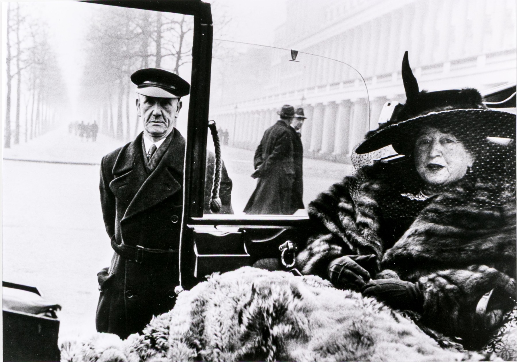 "Mrs. Eveleigh Nash, Buckingham Palace Mall, London, 1953" gelatin silver print depicting a woman in ornate fur and a feathered hat sitting in a car while men walk by urban architecture and a tree-lined path in the background. Pencil signed and bearing a label denoting the piece as being printed later and a original gallery price of $900. Unframed.
