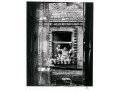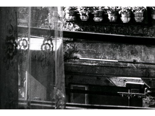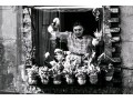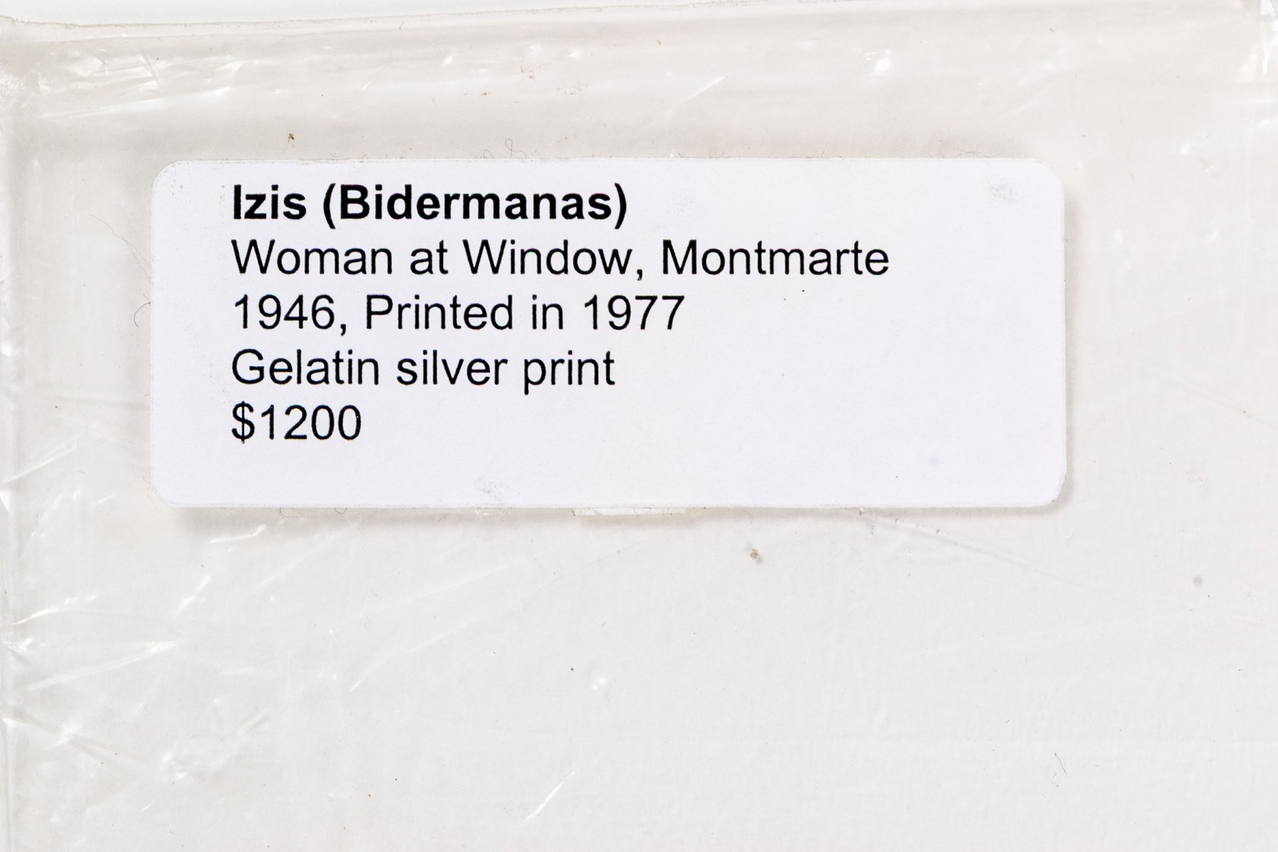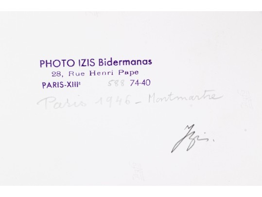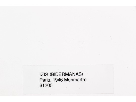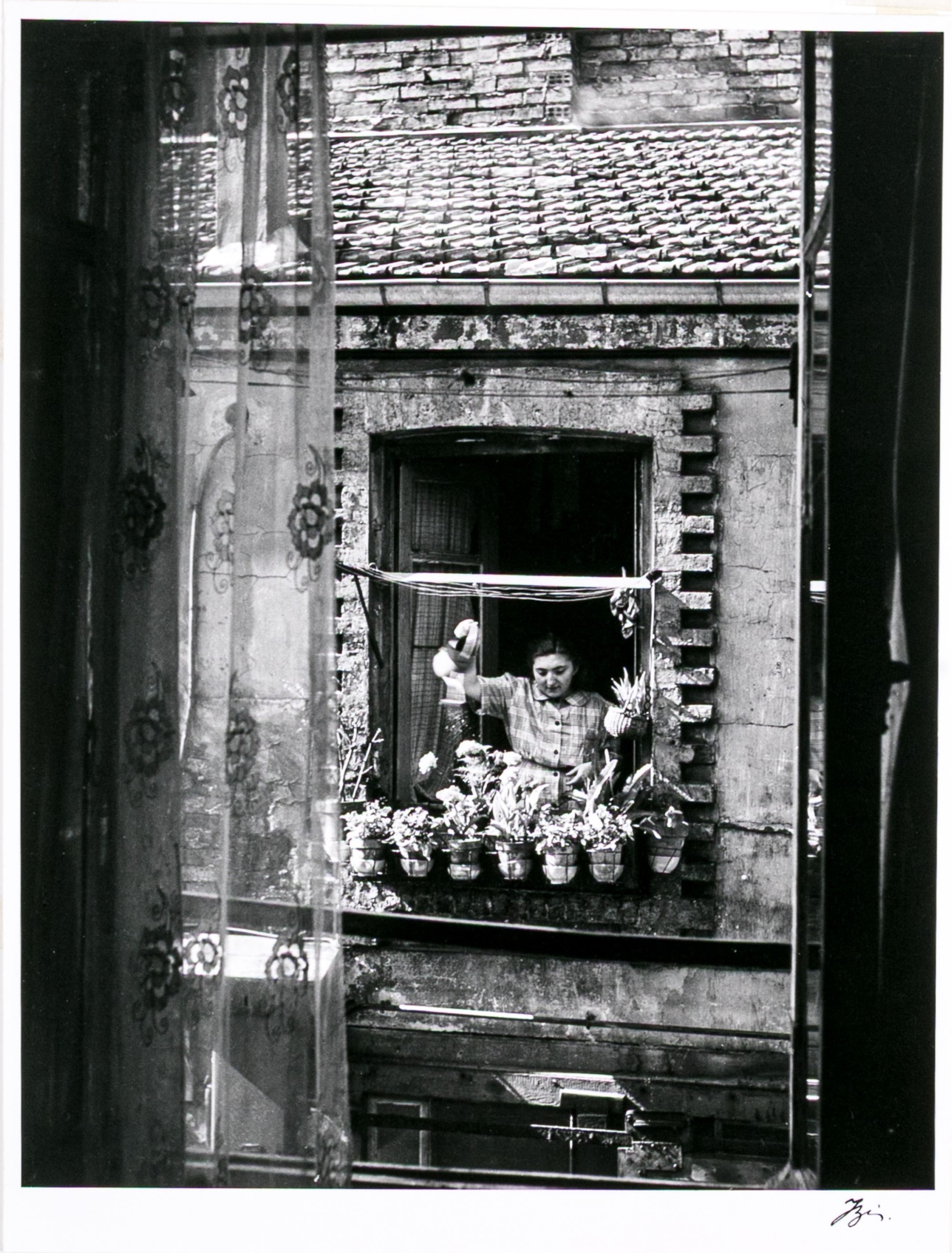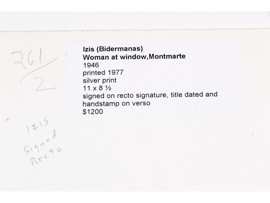 Izis Bidermanas (Lithuanian-French, 1911-1980) "Woman at Window, Montmartre" gelatin silver print depicting a woman watering flowers hanging from her window as seen across the street from a window with a sheer floral curtain. Signed lower right. Handwritten labels on the verso and bearing a printed label denoting the original listing price of $1,200. Unframed.