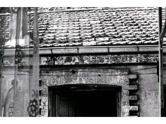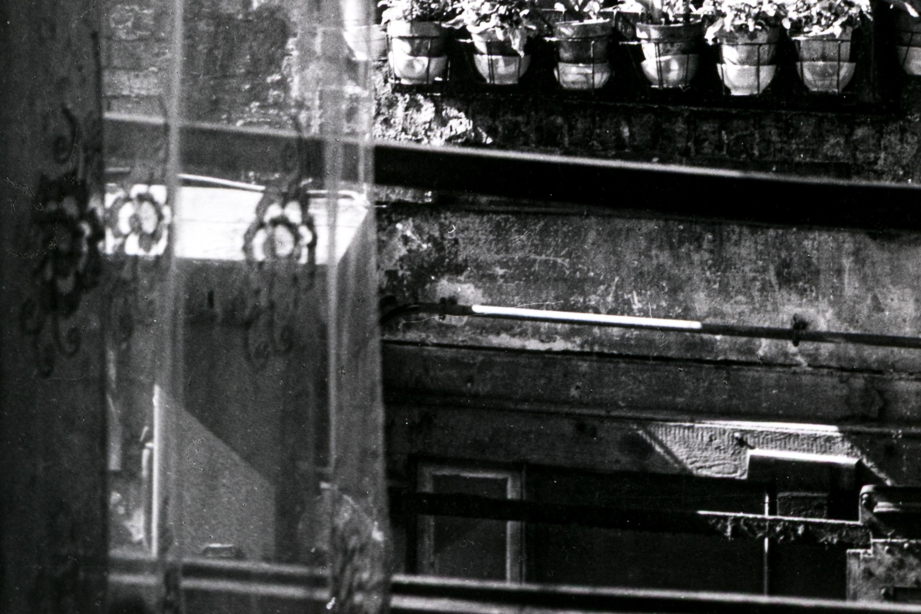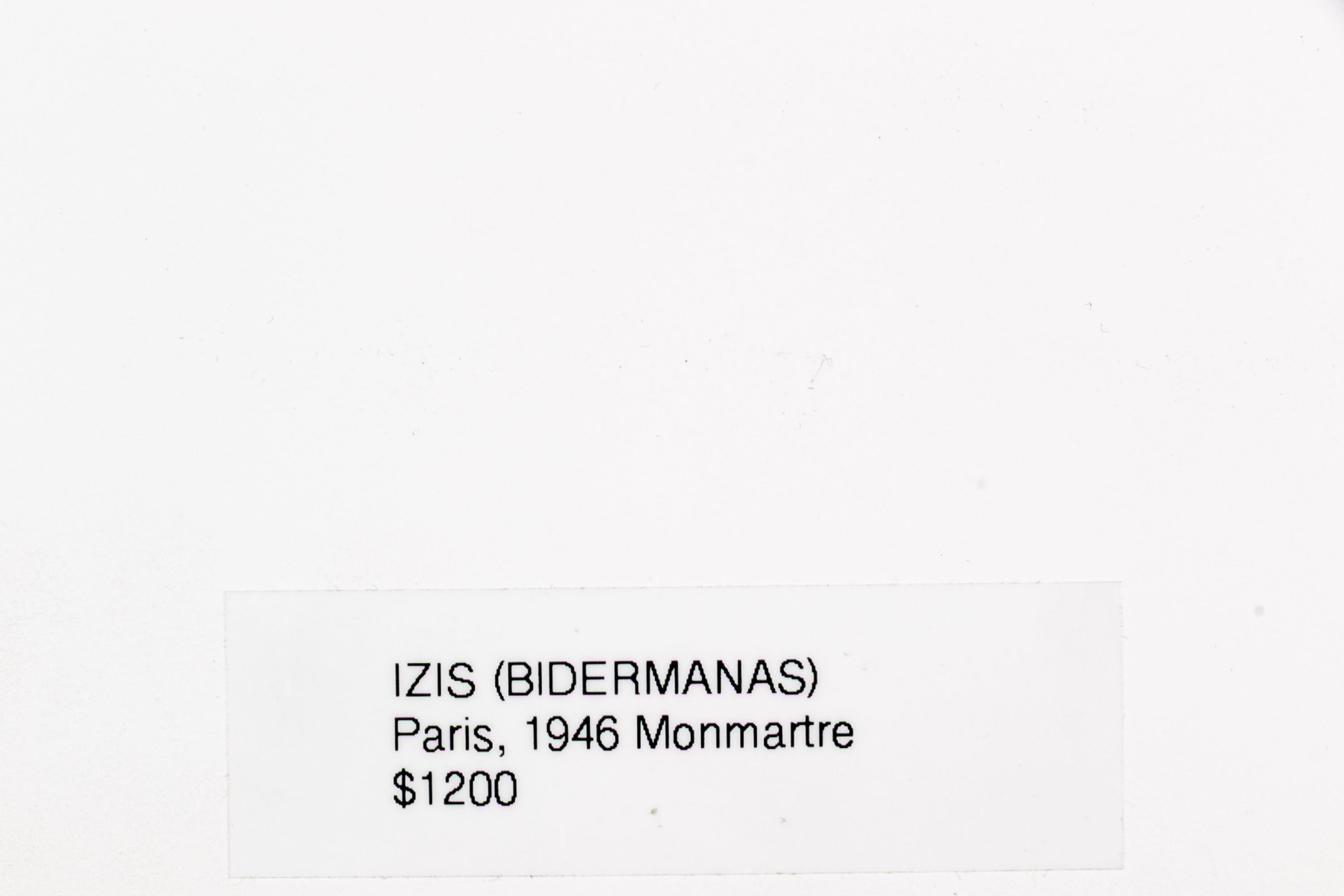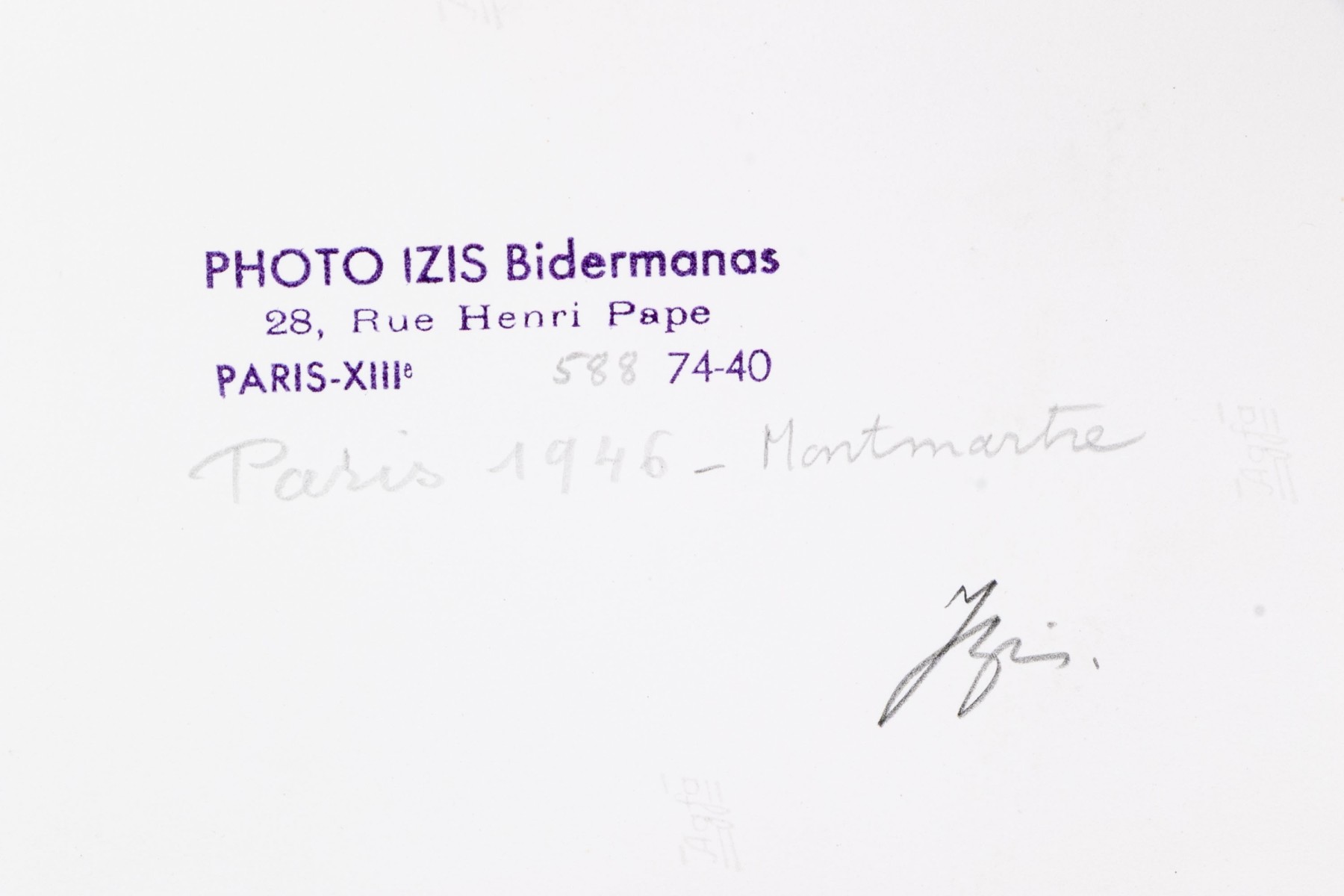 Izis Bidermanas (Lithuanian-French, 1911-1980) "Woman at Window, Montmartre" gelatin silver print depicting a woman watering flowers hanging from her window as seen across the street from a window with a sheer floral curtain. Signed lower right. Handwritten labels on the verso and bearing a printed label denoting the original listing price of $1,200. Unframed.
