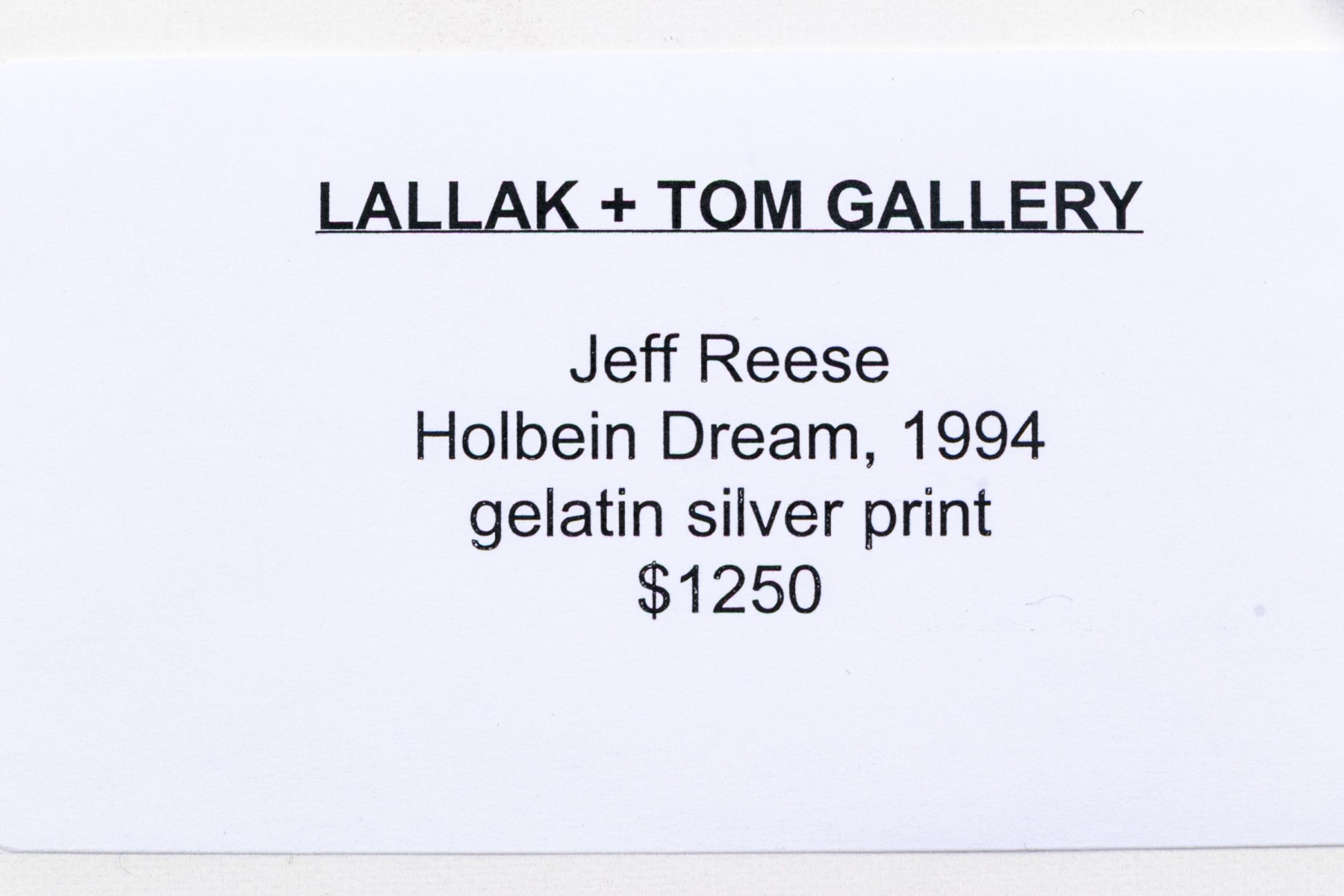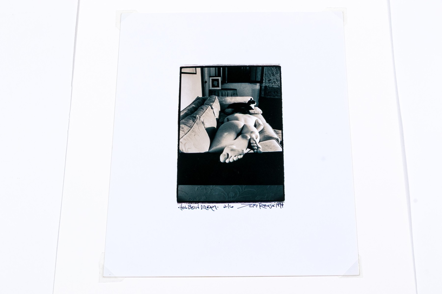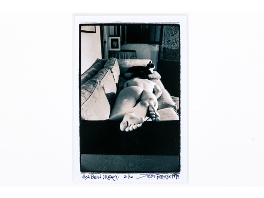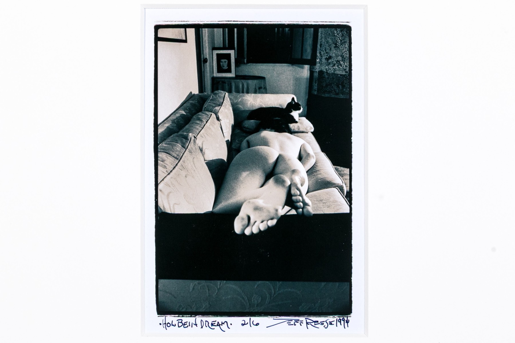 Jeff Reese (American, D. 2008) "Holbein Dream" gelatin silver print depicting a female nude lying face-down on a couch with a black and white cat on a pillow at her head. Ink signed and dated 1994, titled and numbered 2/6 lower left. Bearing a label from Lallak + Tom Gallery denoting the original gallery price of $1,250. In a mount wrapped in plastic, unframed.