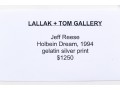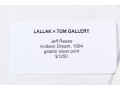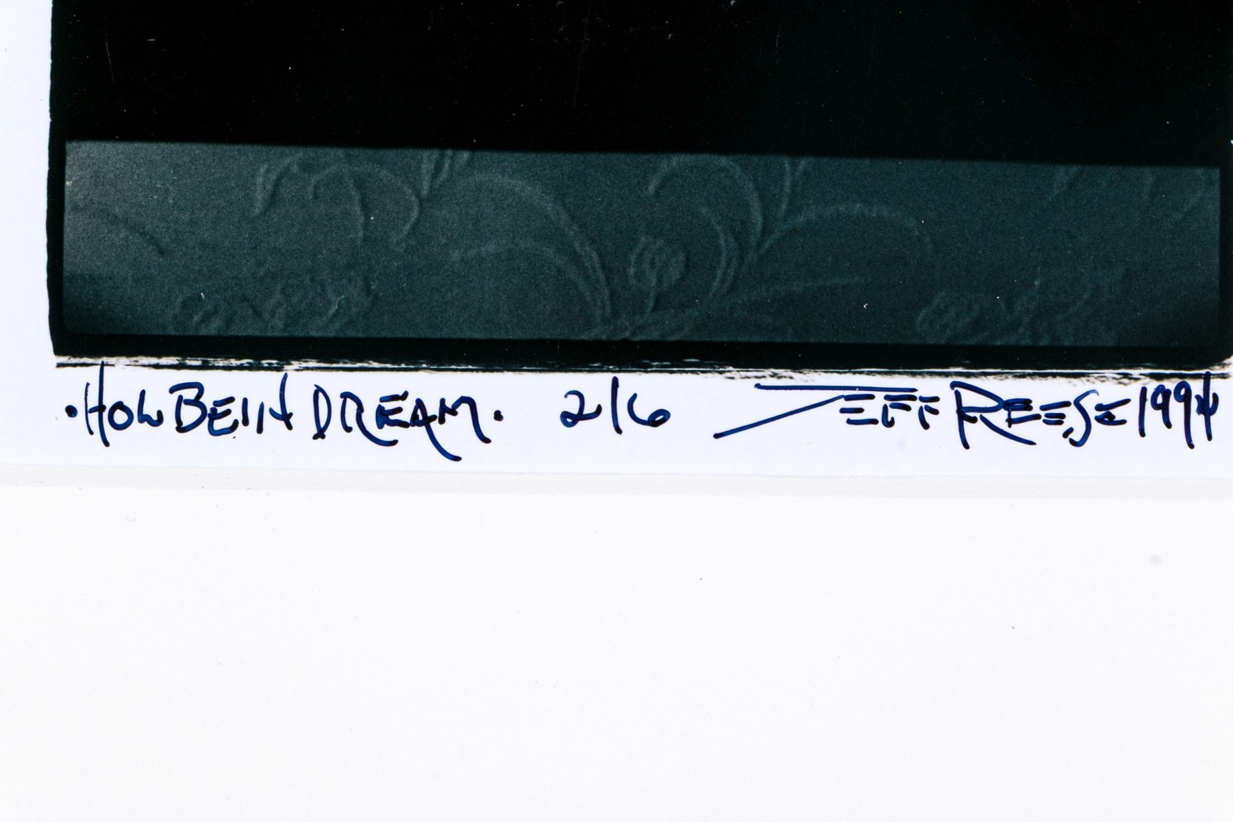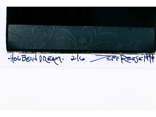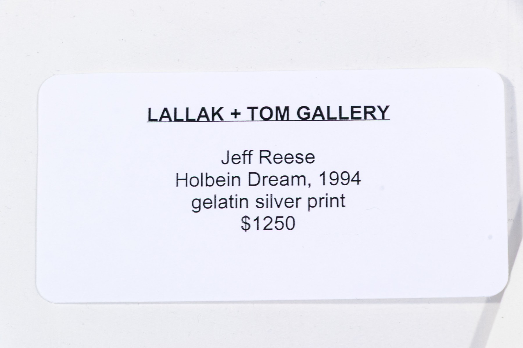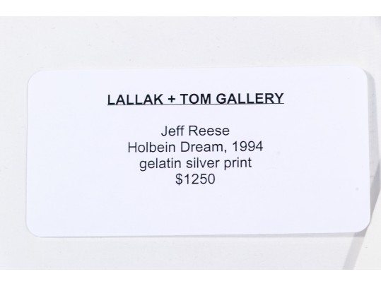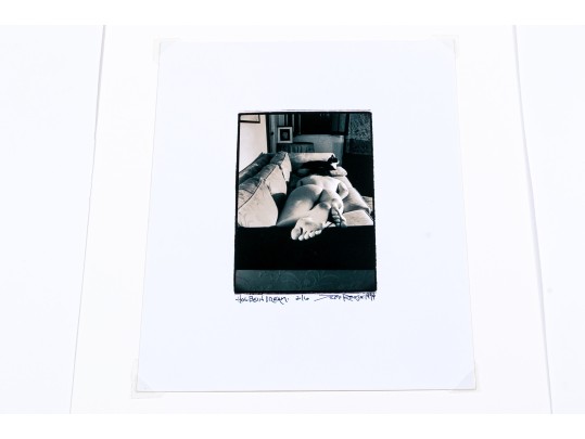 Jeff Reese (American, D. 2008) "Holbein Dream" gelatin silver print depicting a female nude lying face-down on a couch with a black and white cat on a pillow at her head. Ink signed and dated 1994, titled and numbered 2/6 lower left. Bearing a label from Lallak + Tom Gallery denoting the original gallery price of $1,250. In a mount wrapped in plastic, unframed.