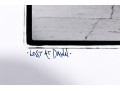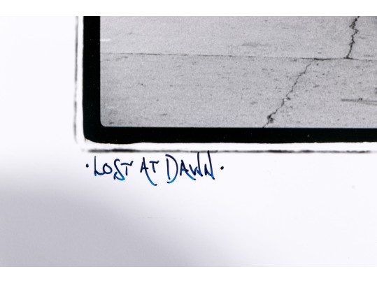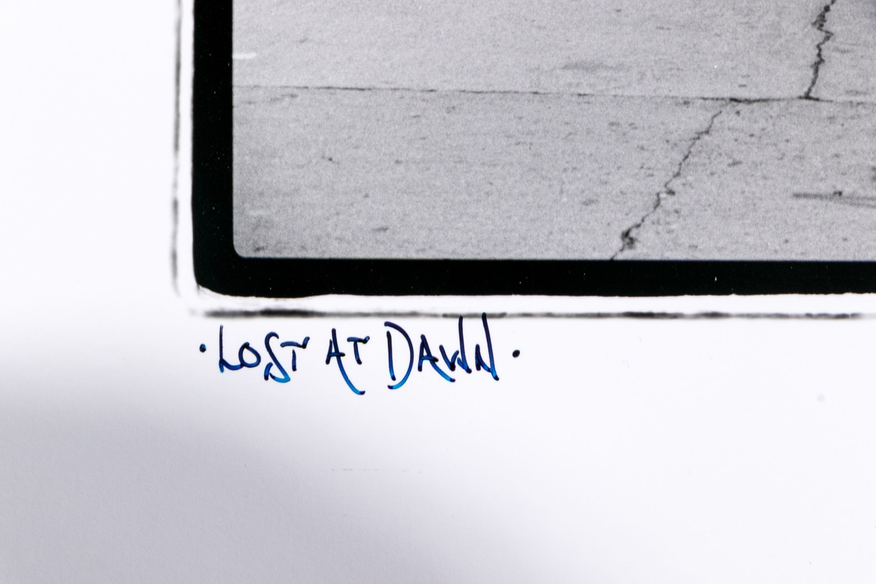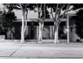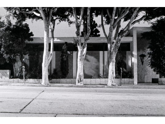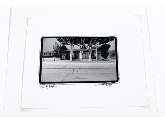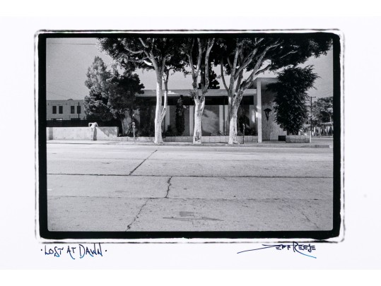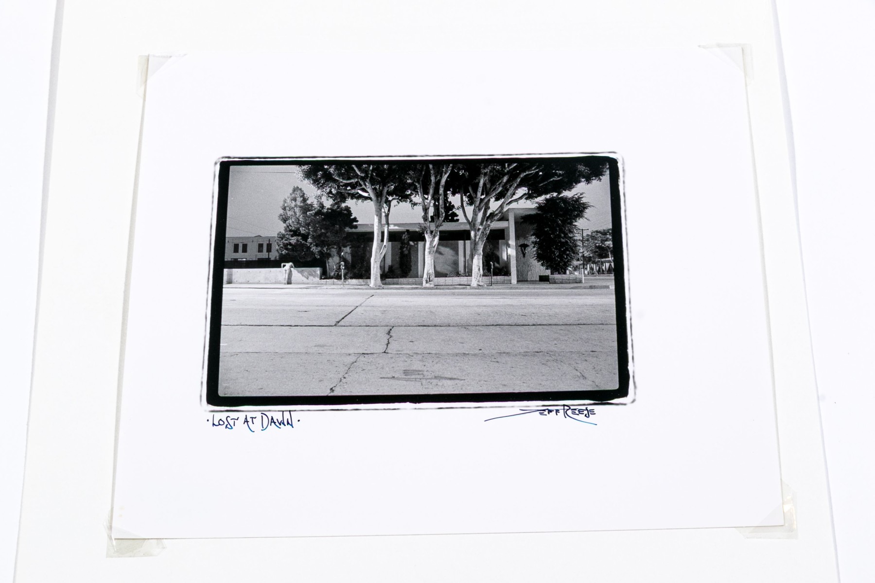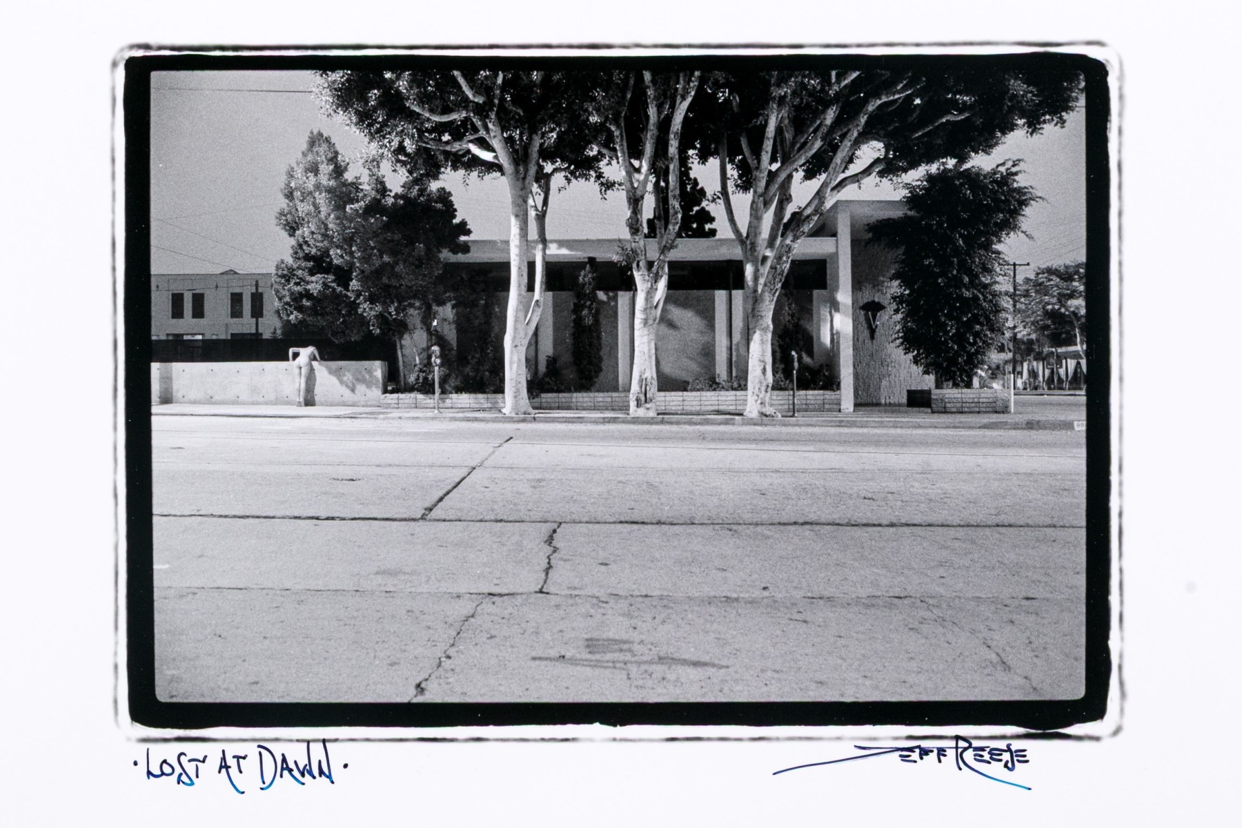 Jeff Reese (American, D. 2008) "Lost at Dawn" gelatin silver print depicting a streetside view of three trees in front of a building with mid-century modernist architecture. Ink signed lower right, titled lower left. Bearing a label from Lallak + Tom Gallery denoting the original gallery price of $1,250. In a mount wrapped in plastic, unframed.