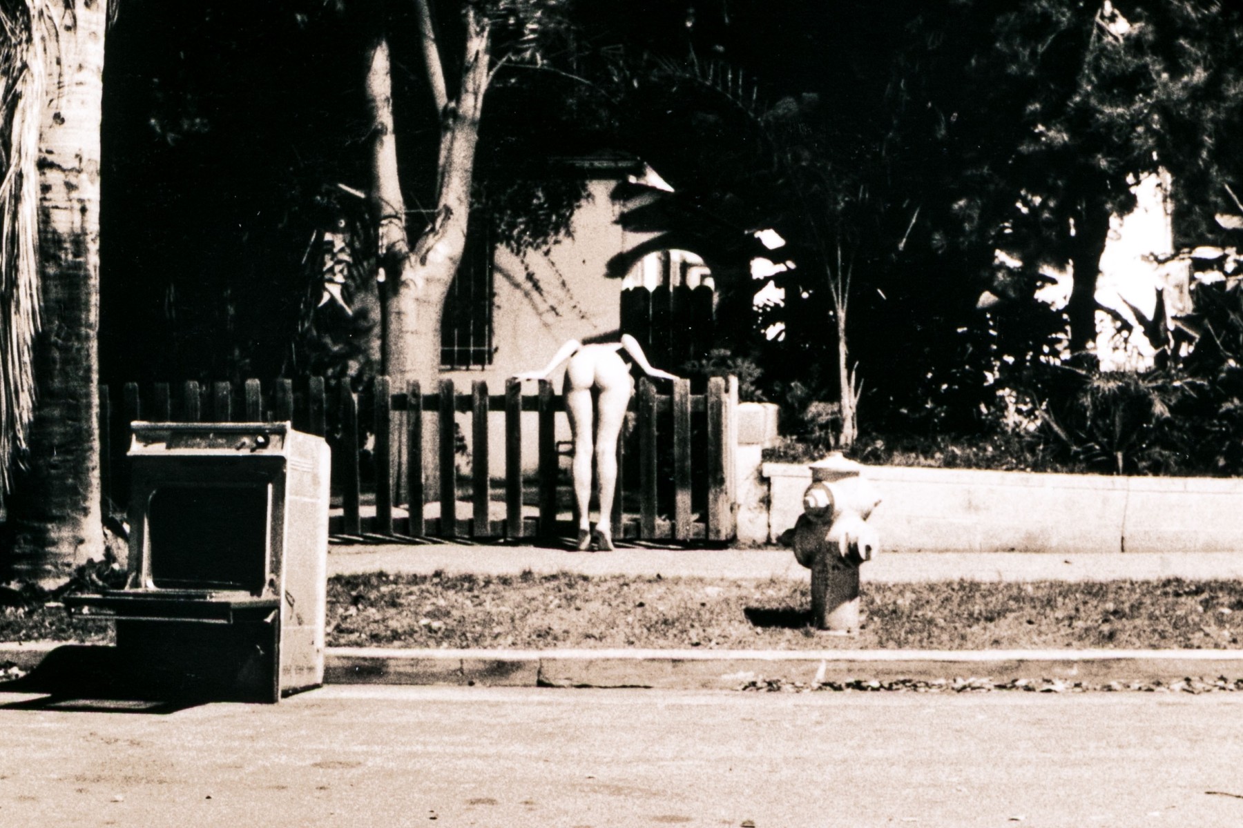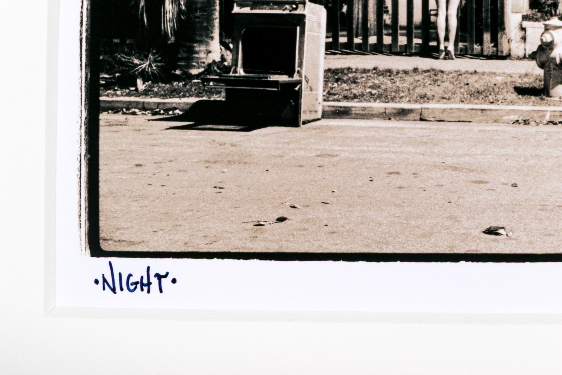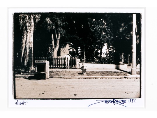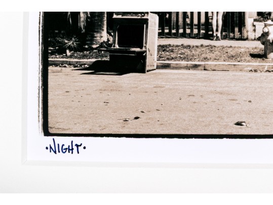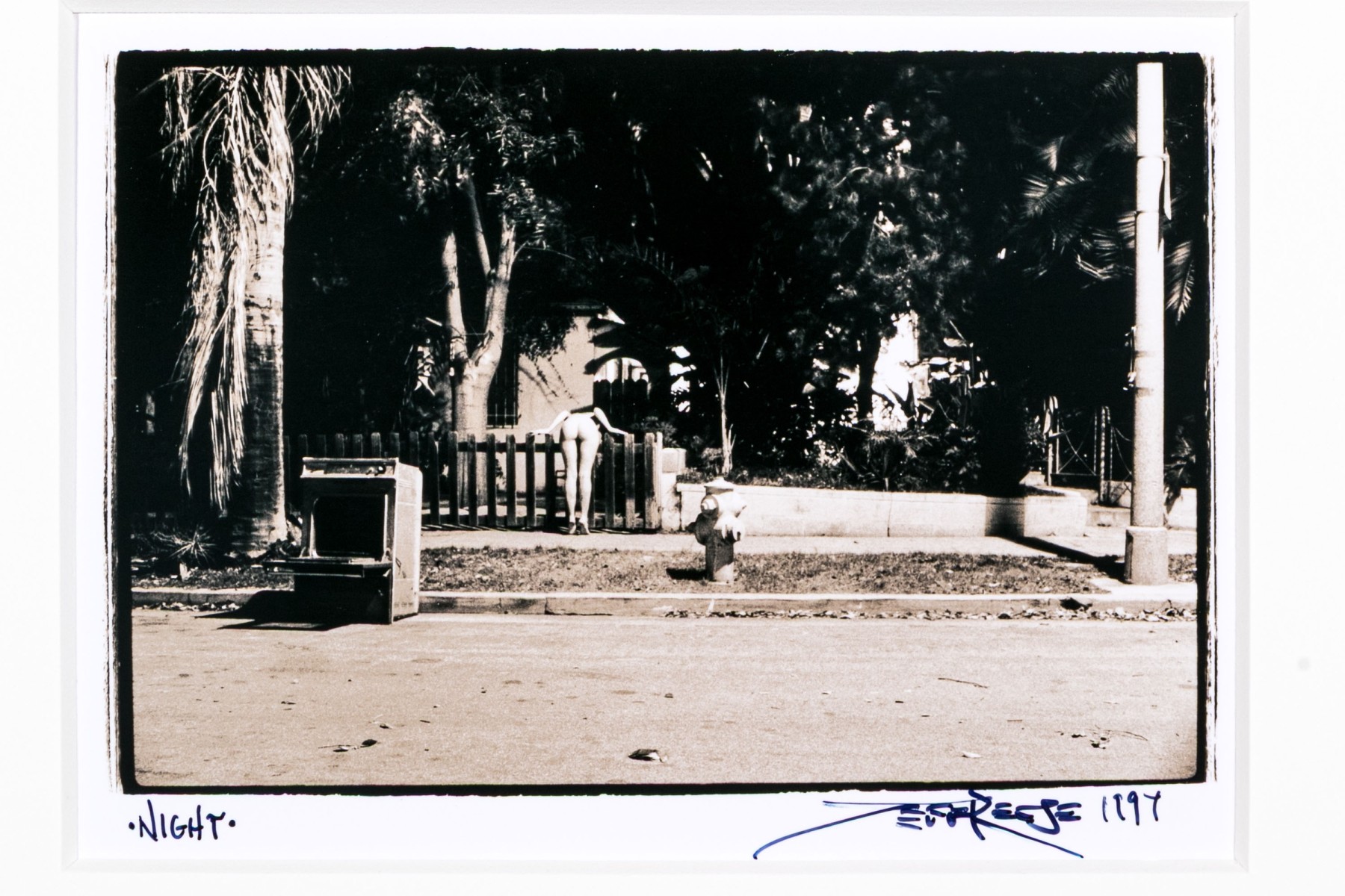 Jeff Reese (American, D. 2008) "Lost at Dawn" gelatin silver print depicting a nude figure of a woman leaning over a wood fence along a suburban street shadowed in lush tree canopies. An arcade machine sits at the curb to the left. Ink signed and dated 1997 lower right, titled lower left. In a mount wrapped in plastic, unframed.