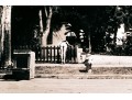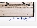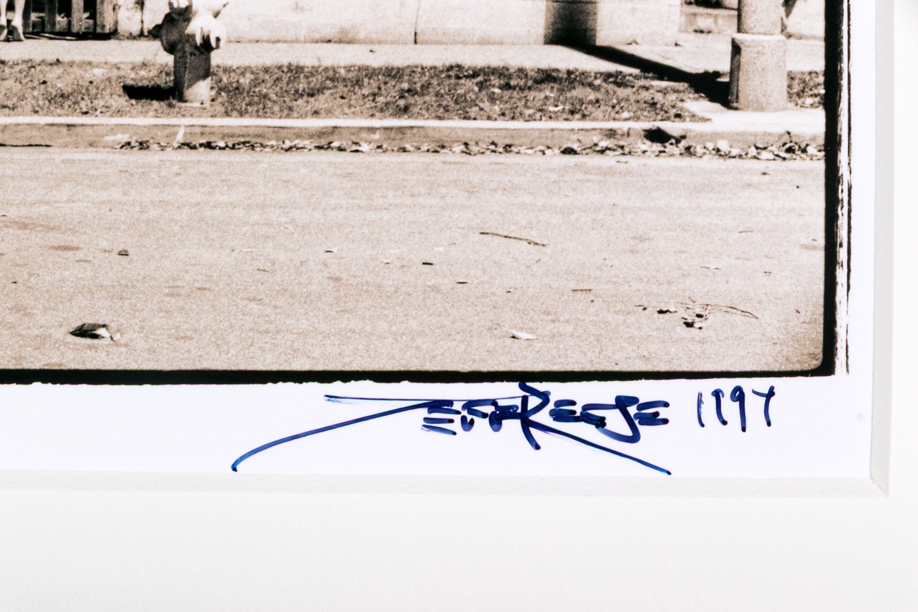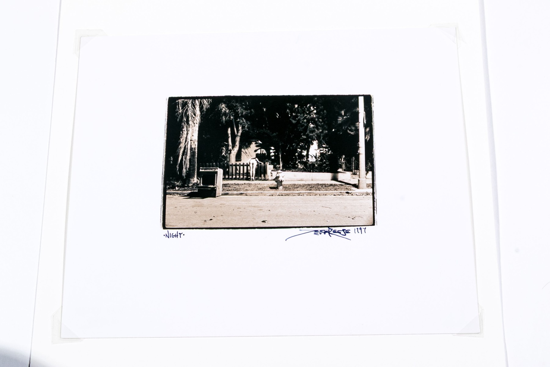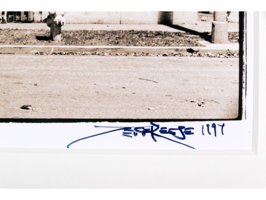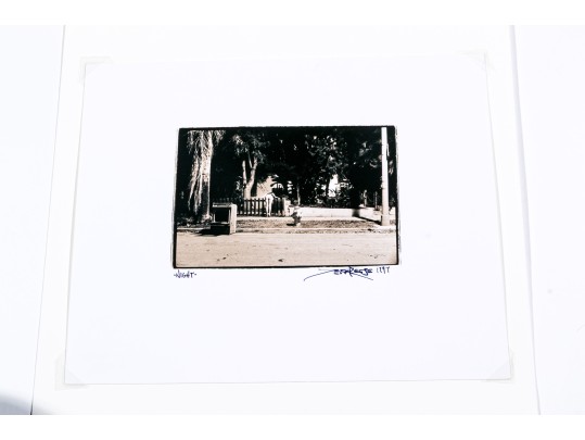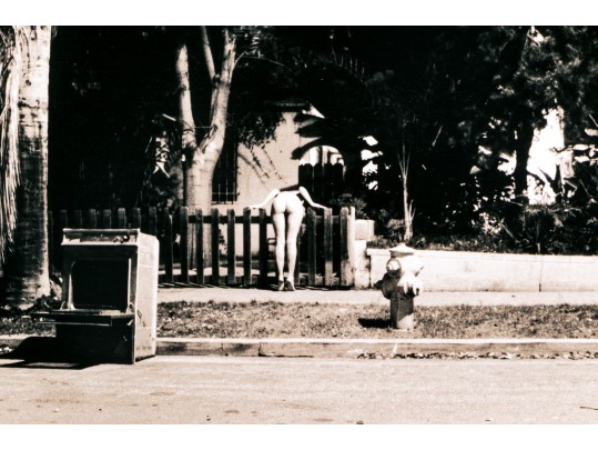Jeff Reese (American, D. 2008) "Lost at Dawn" gelatin silver print depicting a nude figure of a woman leaning over a wood fence along a suburban street shadowed in lush tree canopies. An arcade machine sits at the curb to the left. Ink signed and dated 1997 lower right, titled lower left. In a mount wrapped in plastic, unframed.