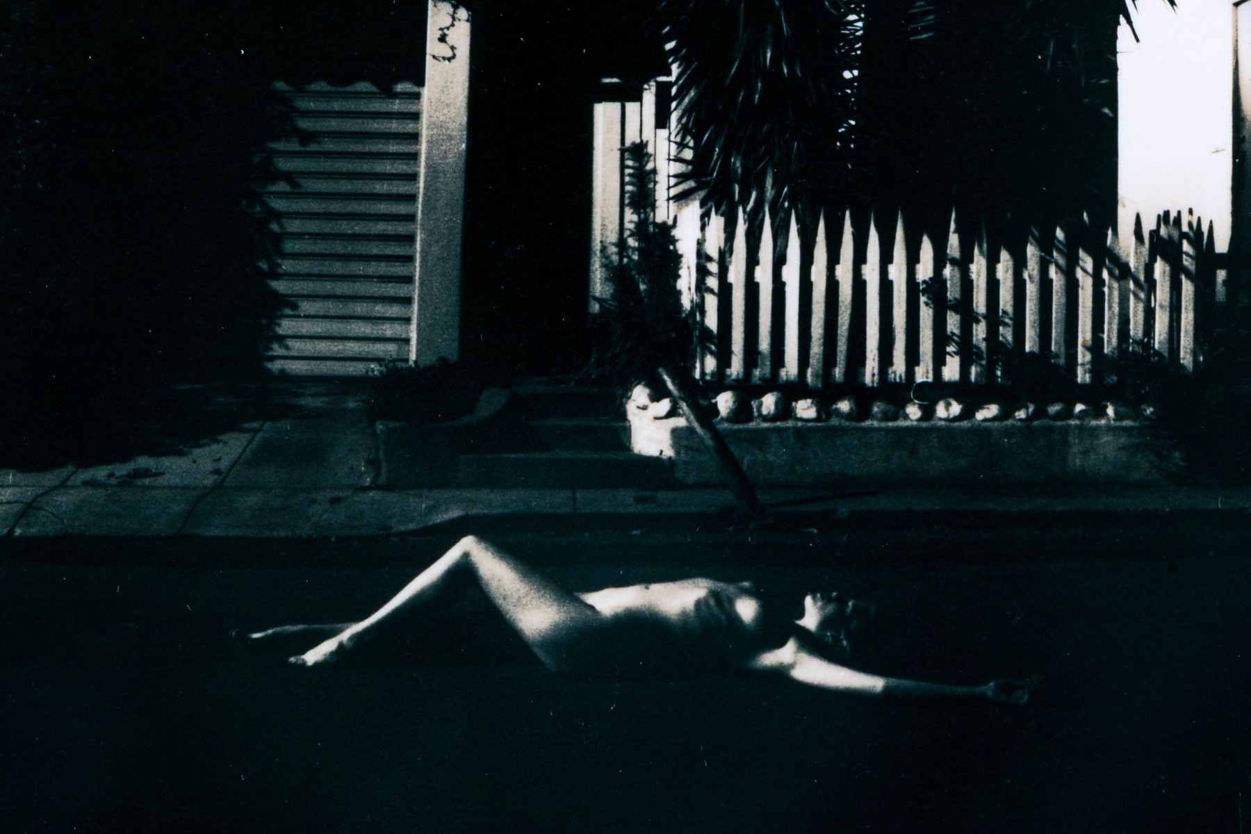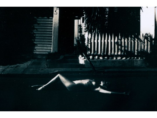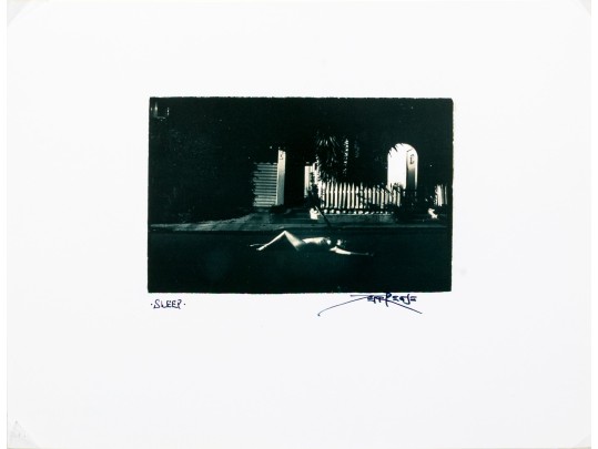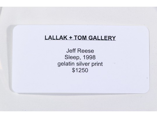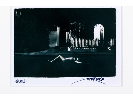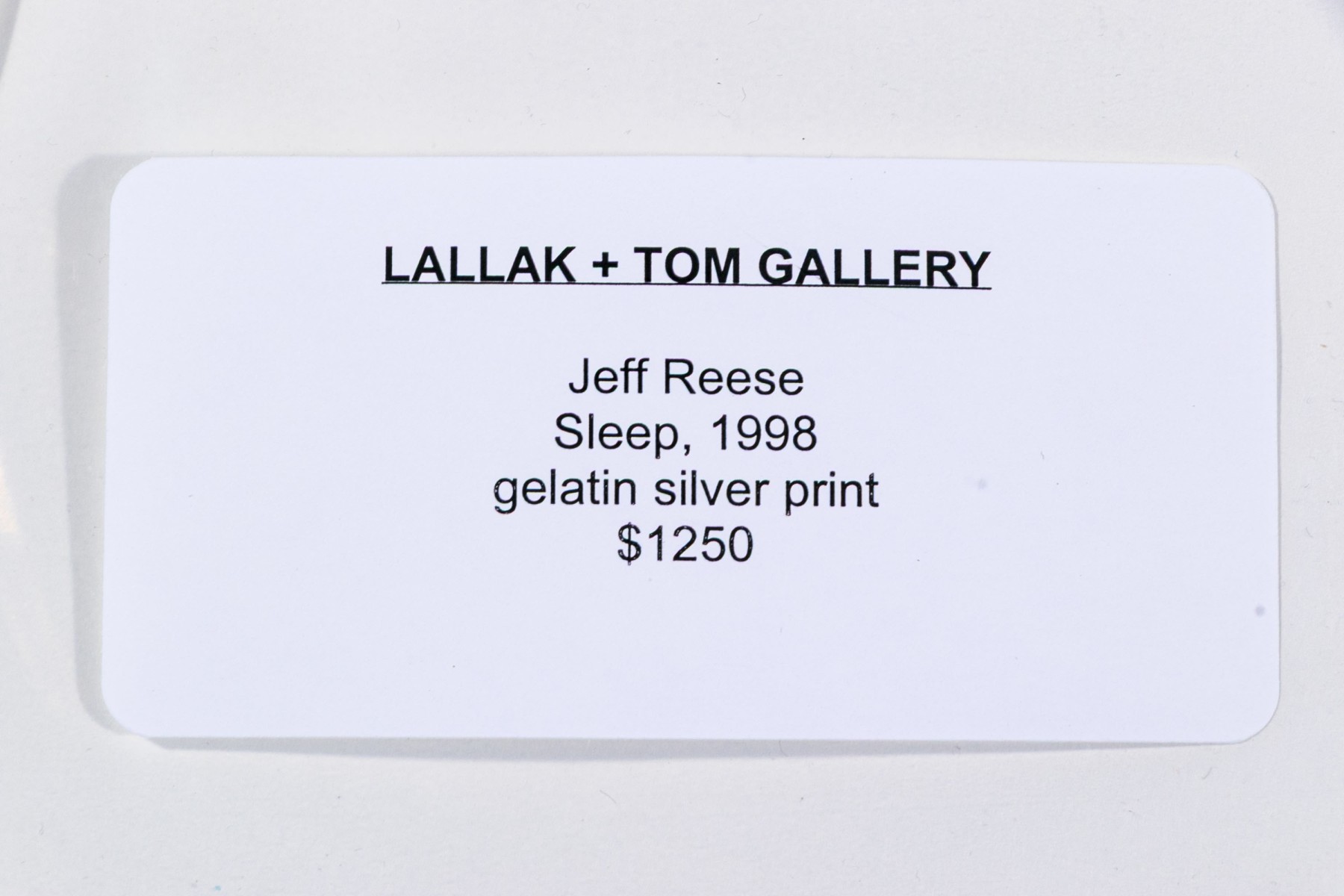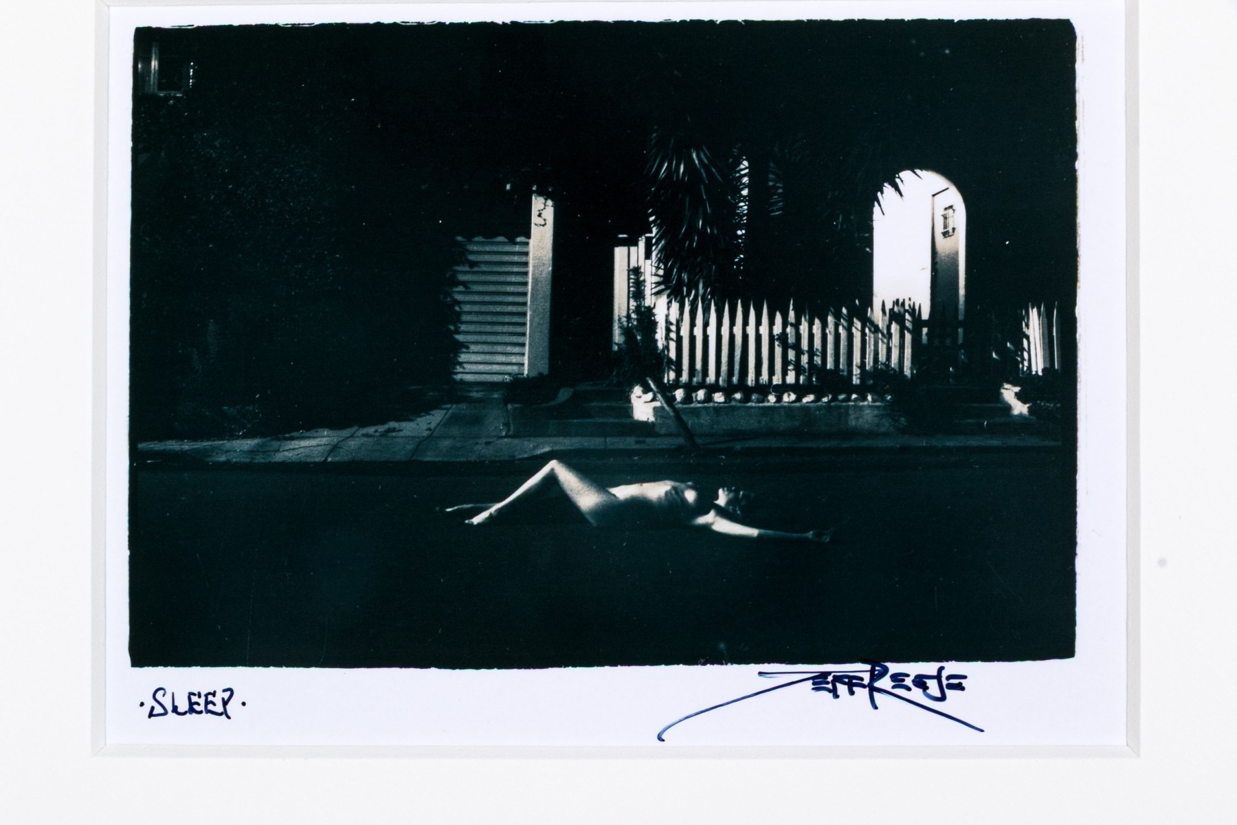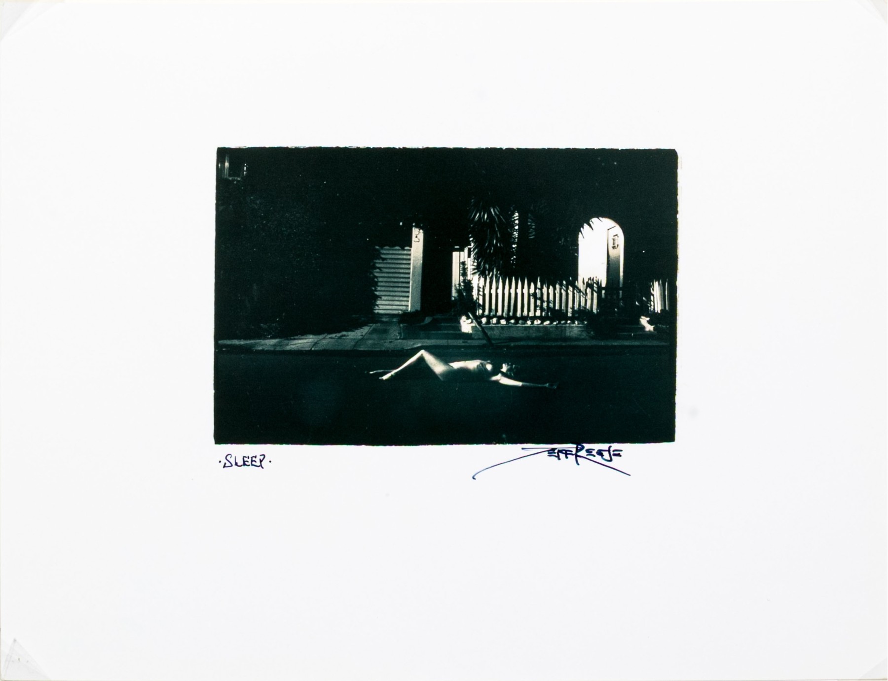 Jeff Reese (American, D.2008) "Sleep" gelatin silver print depicting a female nude reclining in a street at night along a view of a fence and staircase in the background. Ink signed lower right, titled lower left. Bearing a label from Lallak + Tom Gallery denoting the original gallery price of $1,250. In a mount wrapped in plastic, unframed.