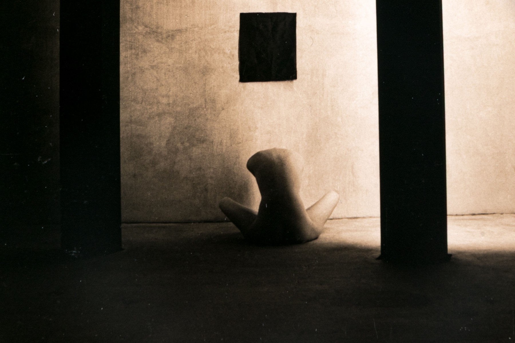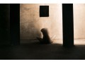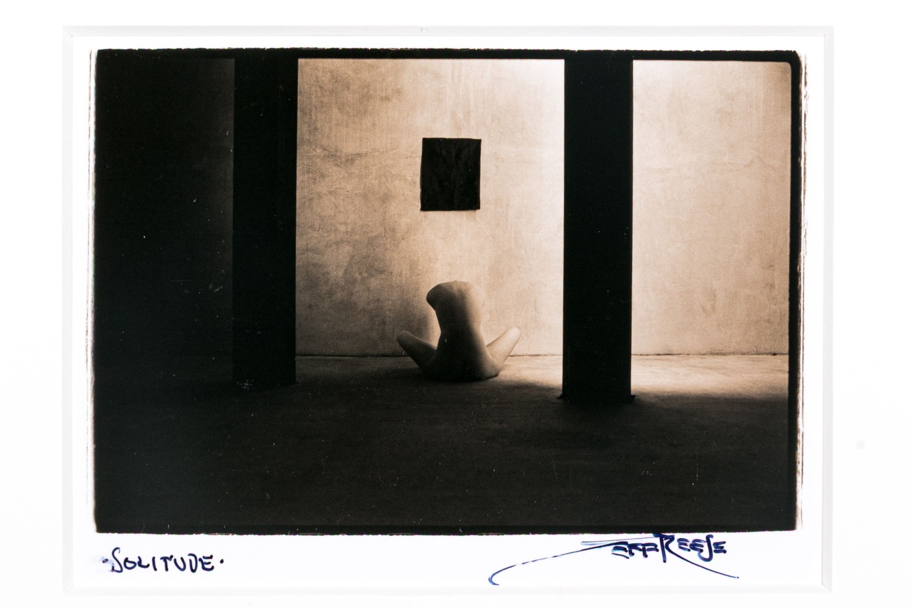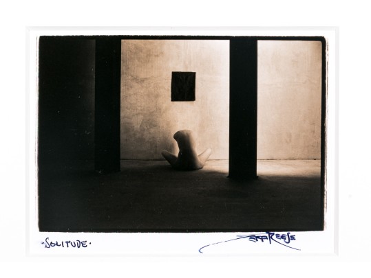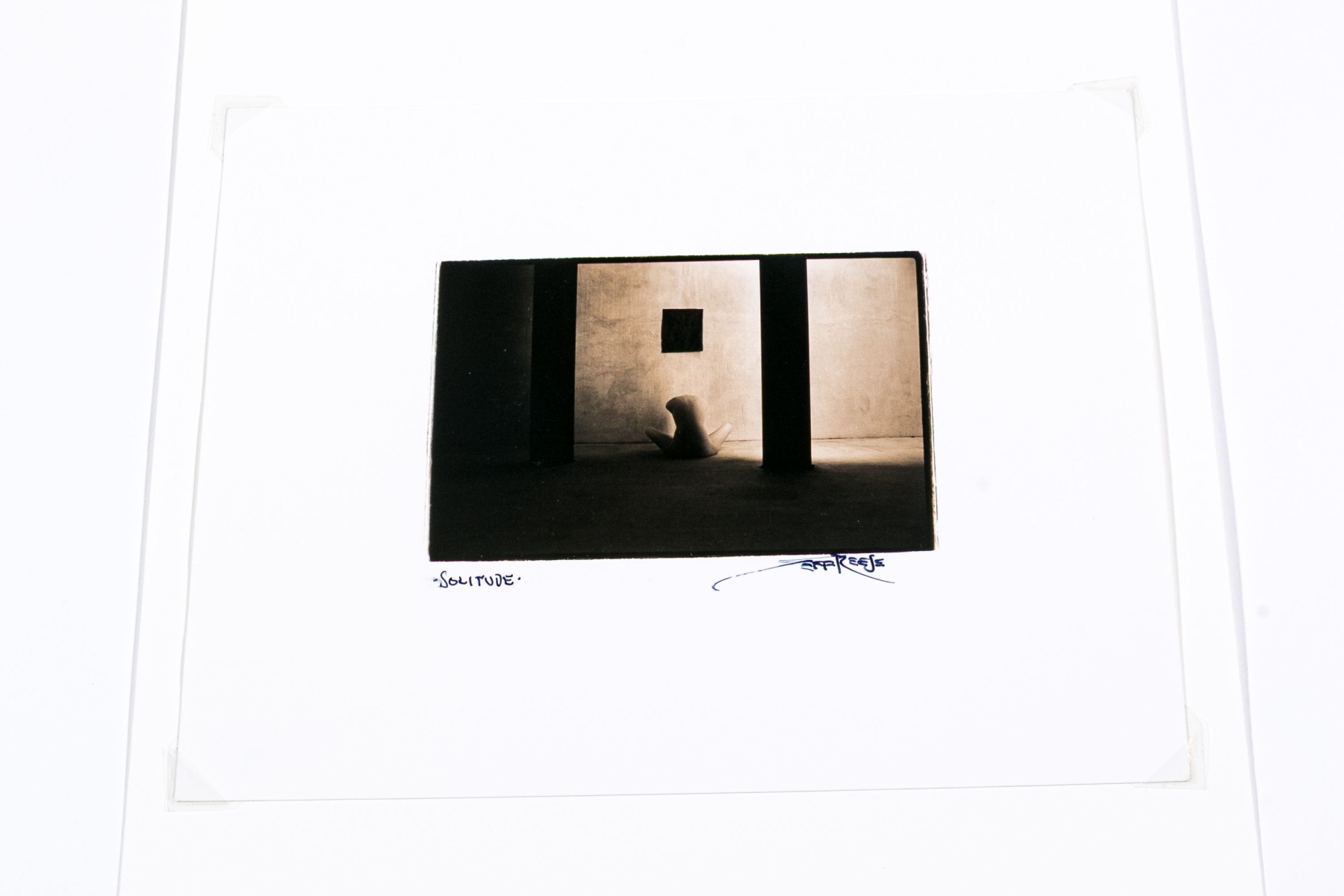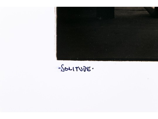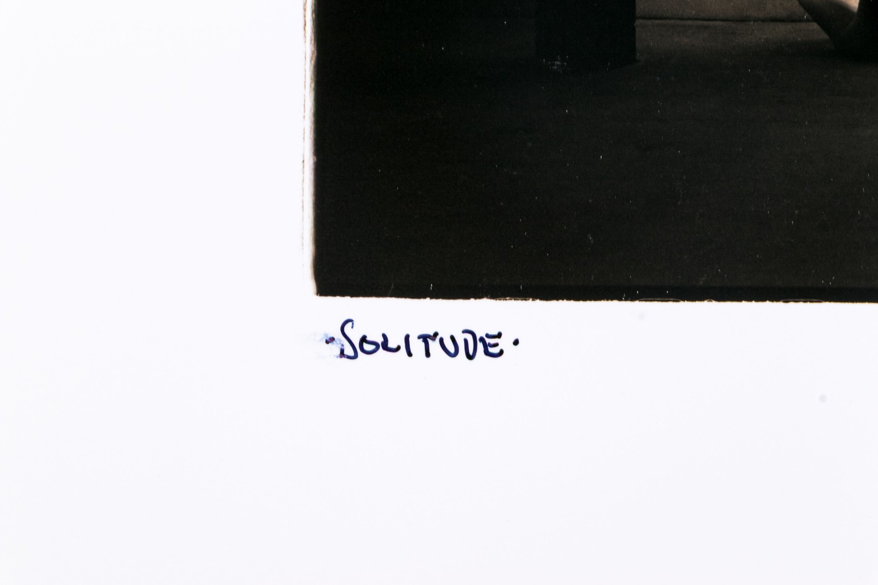 Jeff Reese (American, D. 2008) "Solitude" gelatin silver print depicting a lone female nude posed seated with head lowered, facing away from the viewer in a stark interior. Ink signed lower right, titled lower left. In a mount, unframed.