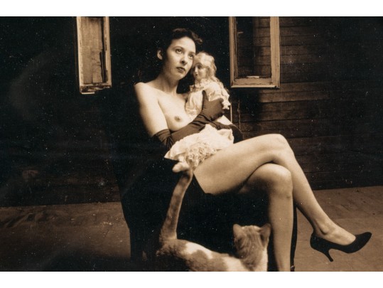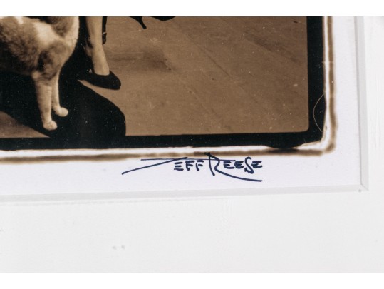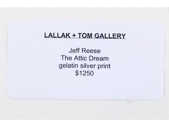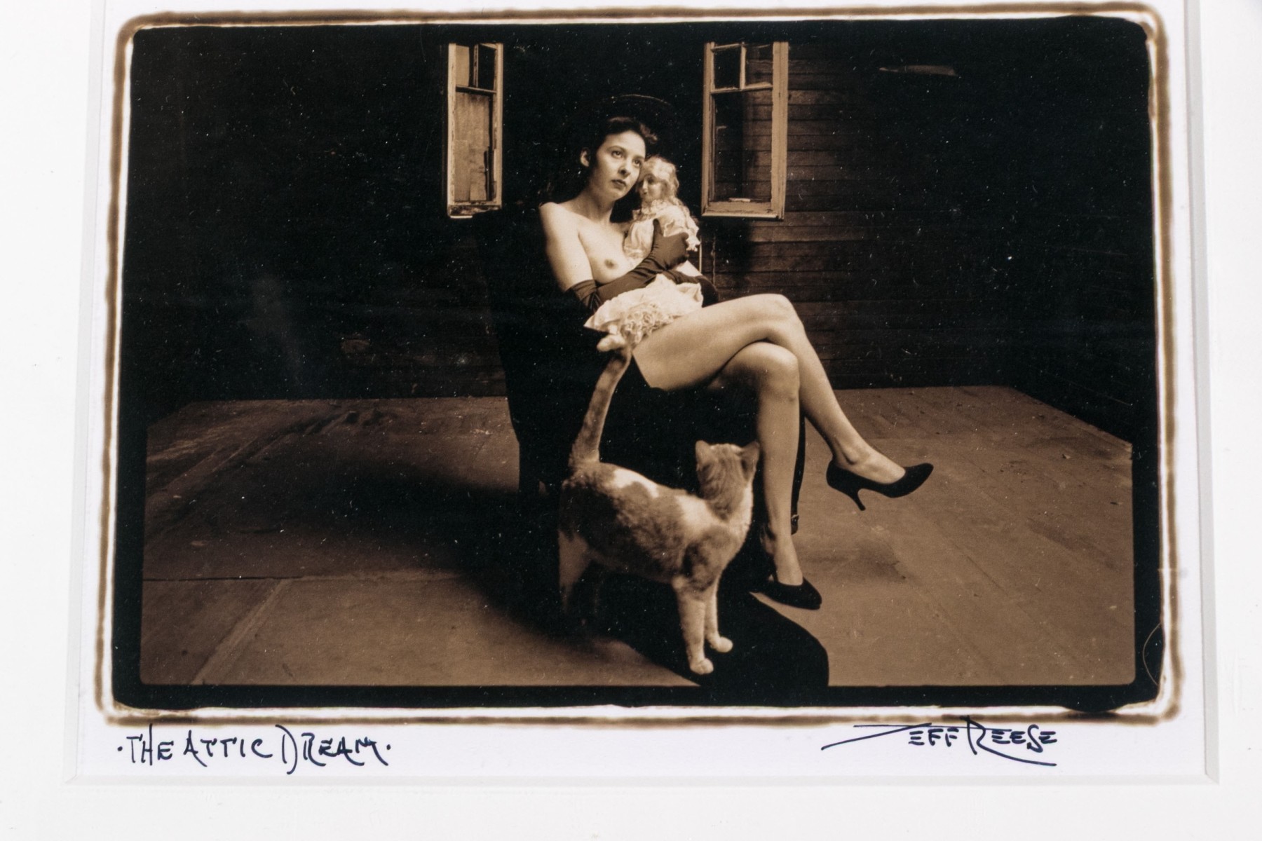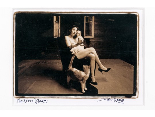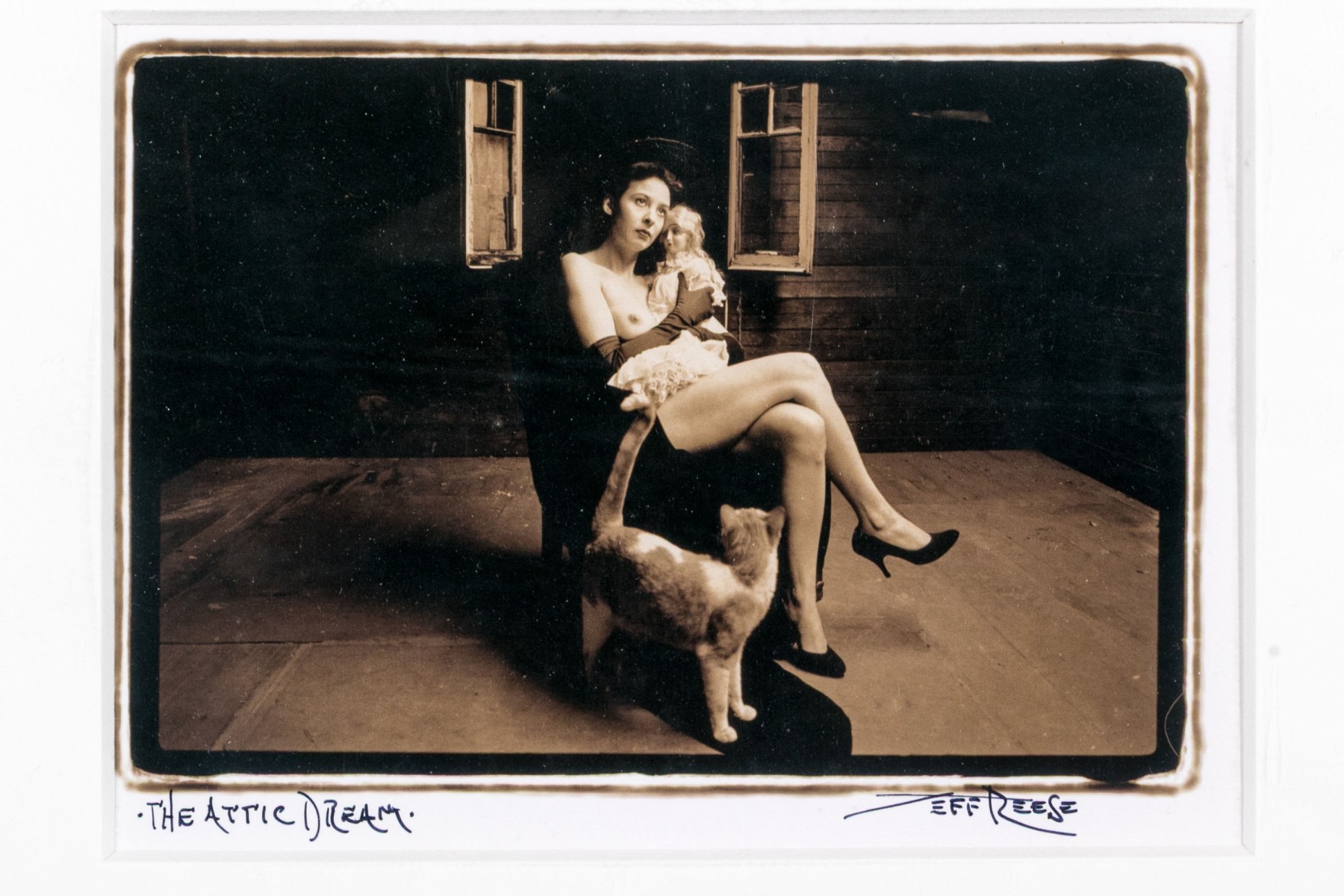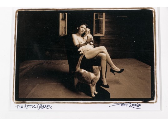 Jeff Reese (American, D. 2008) "The Attic Dream" gelatin silver print depicting a female nude wearing gloves and heels seated in a dark armchair holding a doll with a far-off expression, legs crossed while a cat looks up at her in a sparse interior. Ink signed lower right, titled lower left. Bearing a label from Lallak + Tom Gallery denoting the original gallery price of $1,250. In a mount wrapped in plastic, unframed.