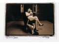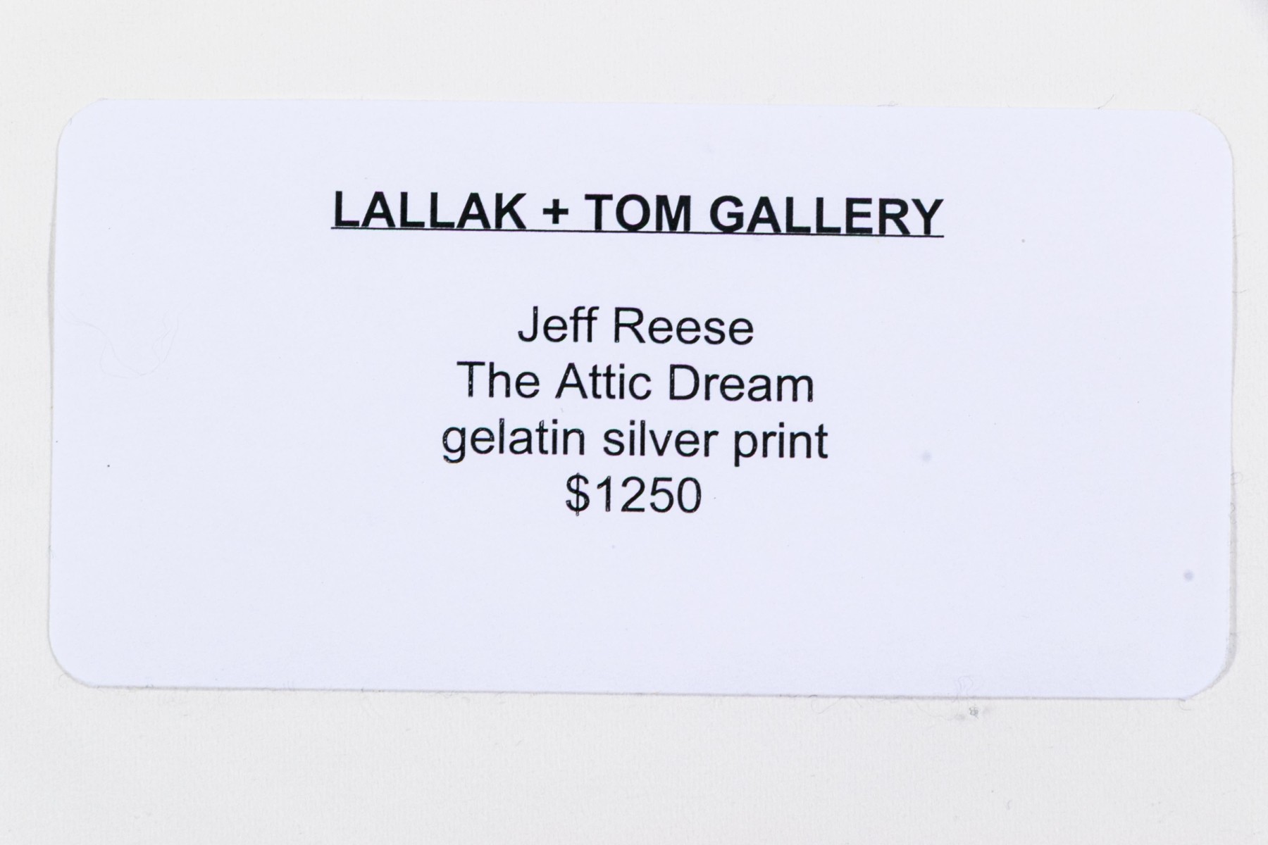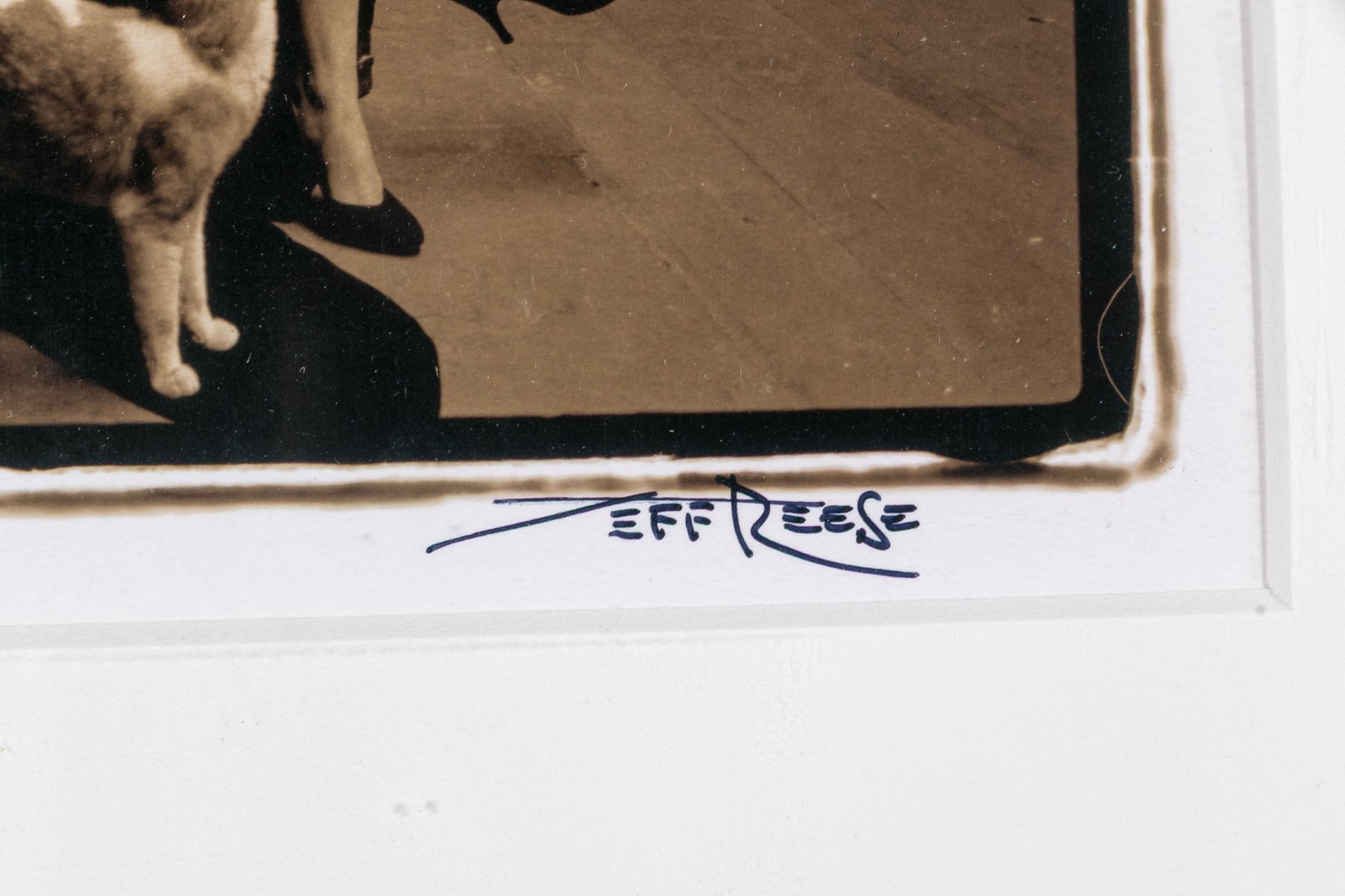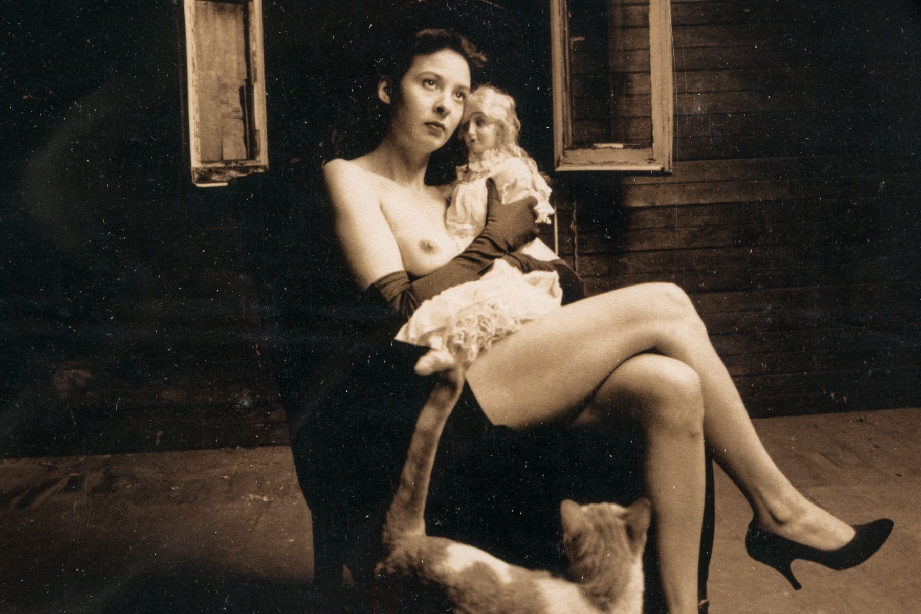 Jeff Reese (American, D. 2008) "The Attic Dream" gelatin silver print depicting a female nude wearing gloves and heels seated in a dark armchair holding a doll with a far-off expression, legs crossed while a cat looks up at her in a sparse interior. Ink signed lower right, titled lower left. Bearing a label from Lallak + Tom Gallery denoting the original gallery price of $1,250. In a mount wrapped in plastic, unframed.