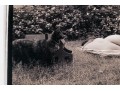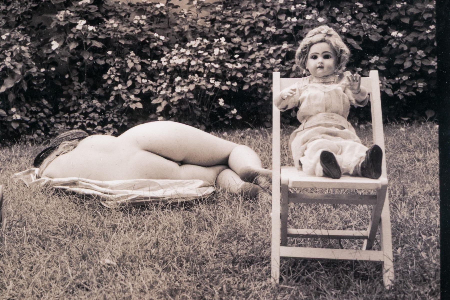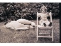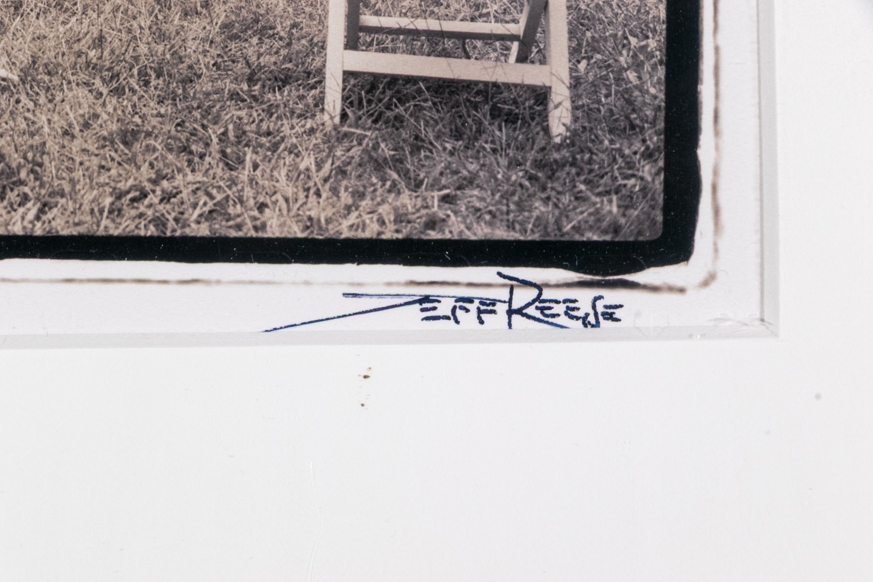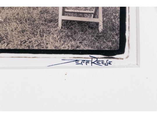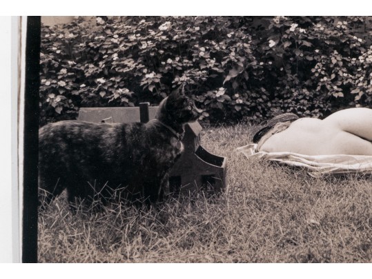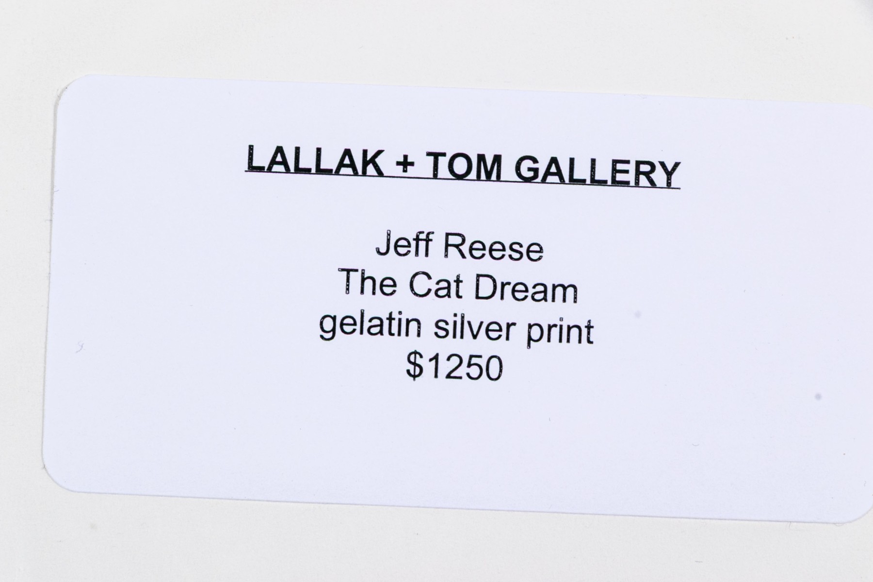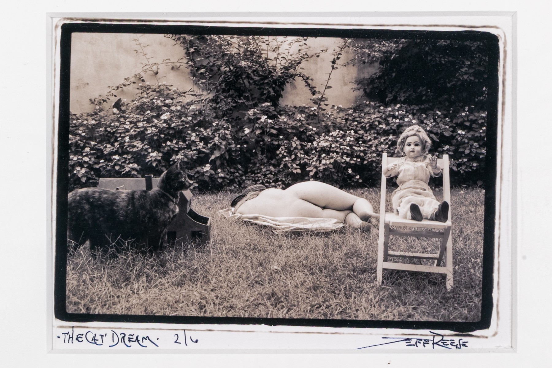 Jeff Reese (American, D. 2008) "The Cat Dream" Signed gelatin silver print depicting a female nude napping in a garden along a hedge of flowering bushes while a cat in profile looks towards a doll seated in a chair. Ink signed lower right, titled and numbered 2/6 lower left. Bearing a label from Lallak + Tom Gallery denoting the original gallery price of $1,250. Mounted, unframed.