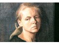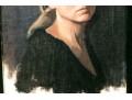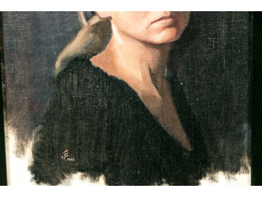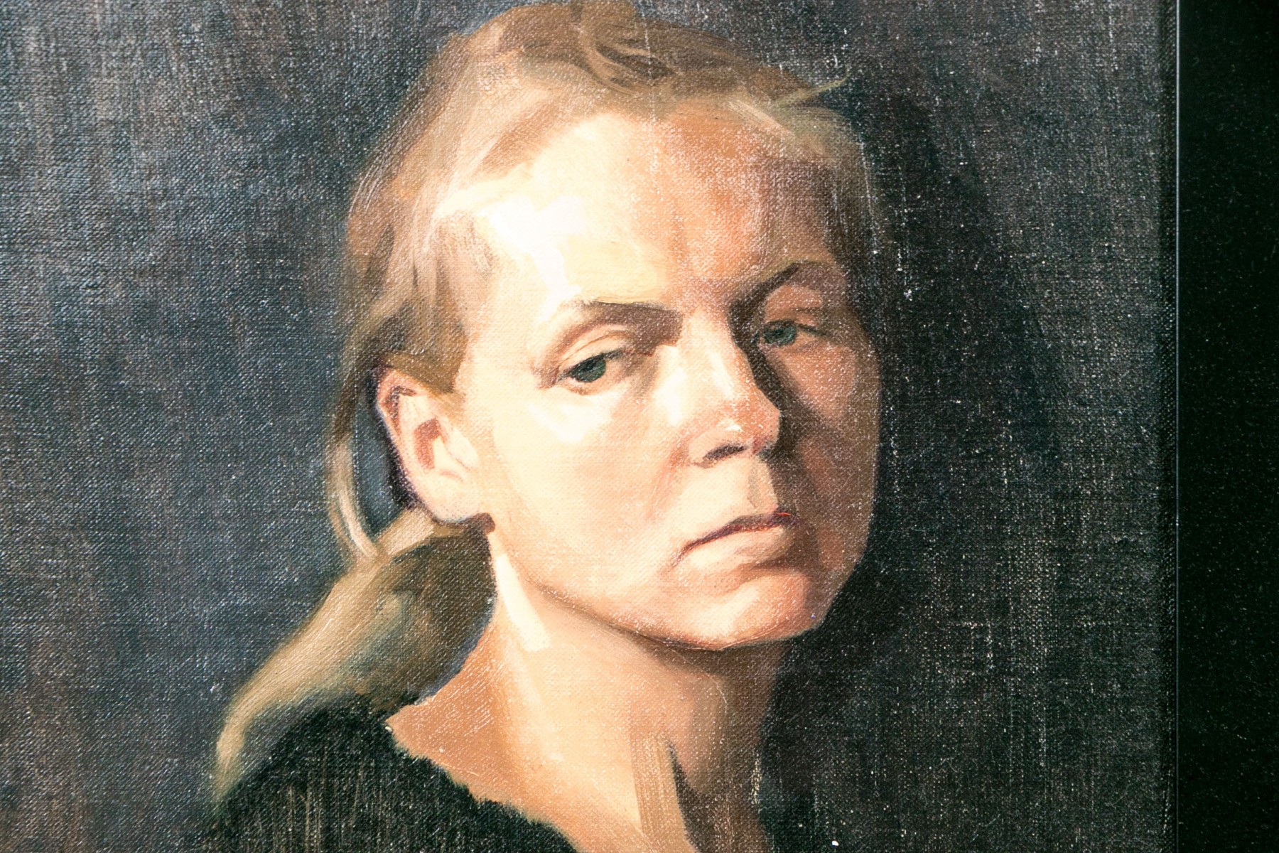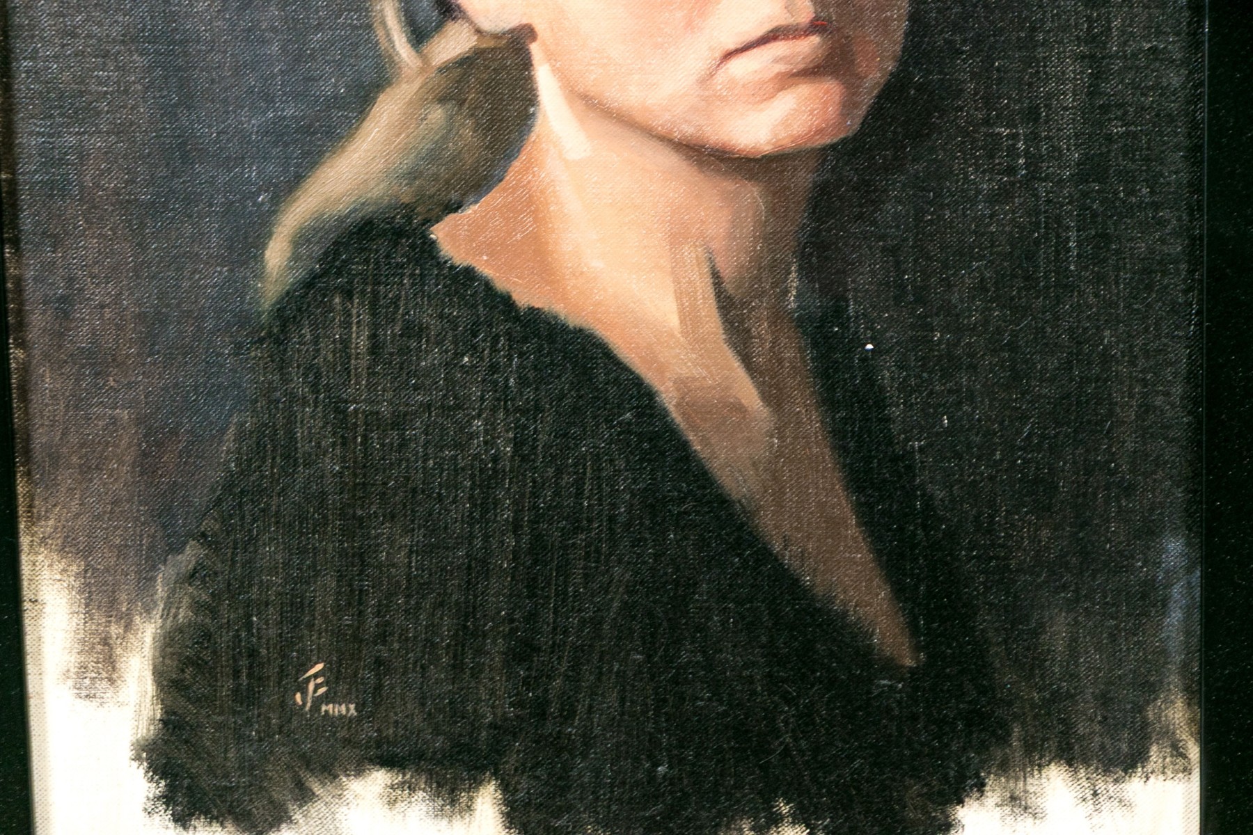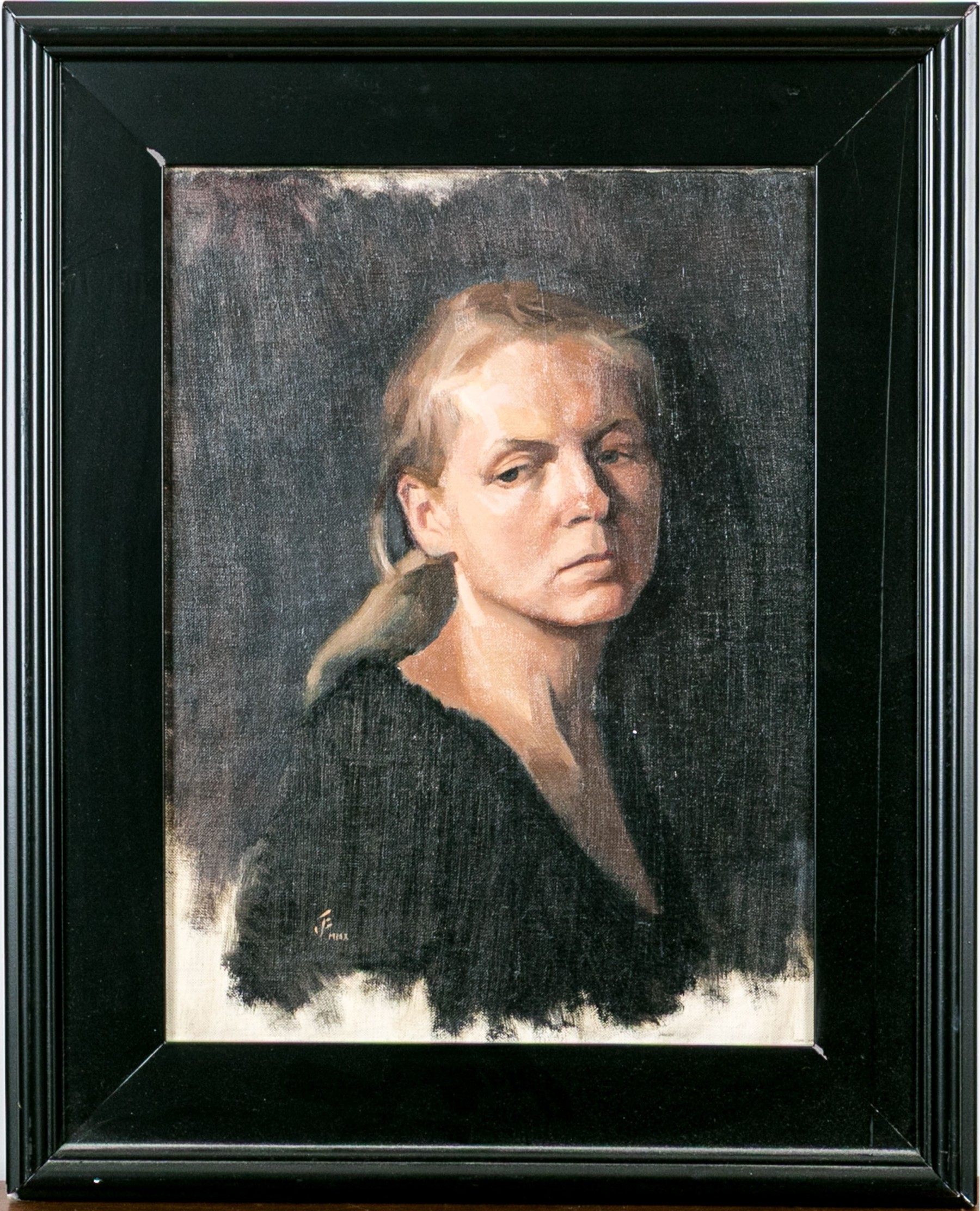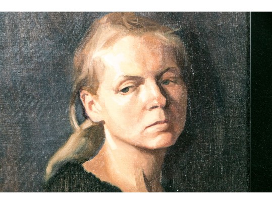 Jesús Emmanuel Villarreal (Venezuelan-American, b. 1984) oil painting on canvas depicting a portrait of a woman in three quarter profile with blonde hair tied into a low ponytail wearing a black scoop-neck shirt with a slightly downcast expression looking to the left against a blue-black ground. Signed lower left.