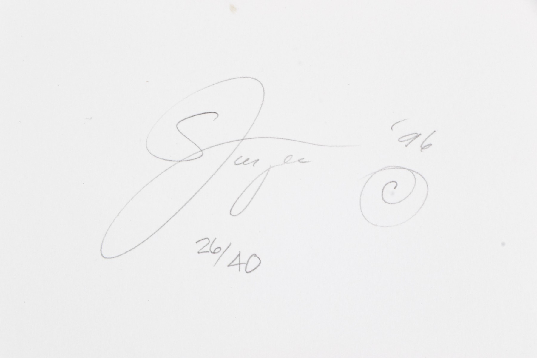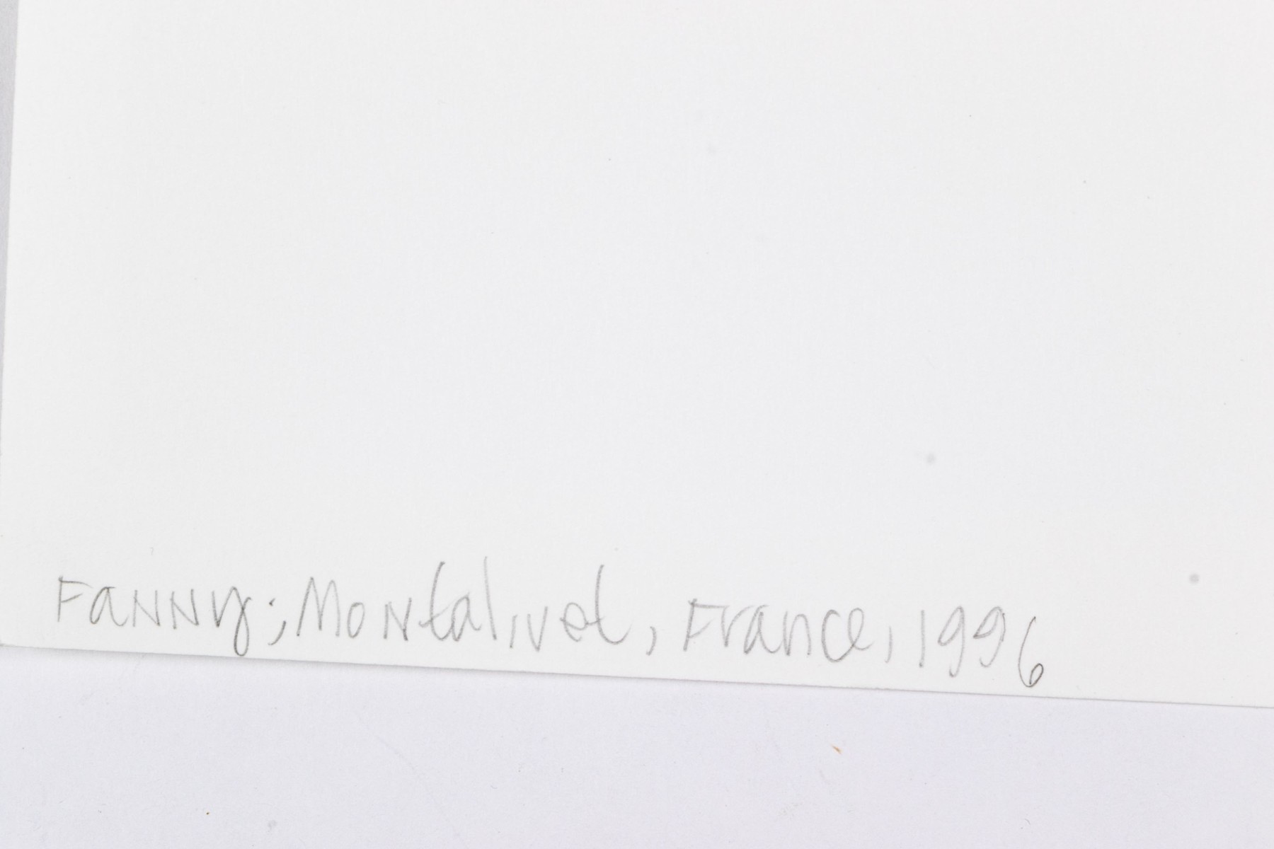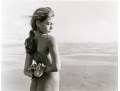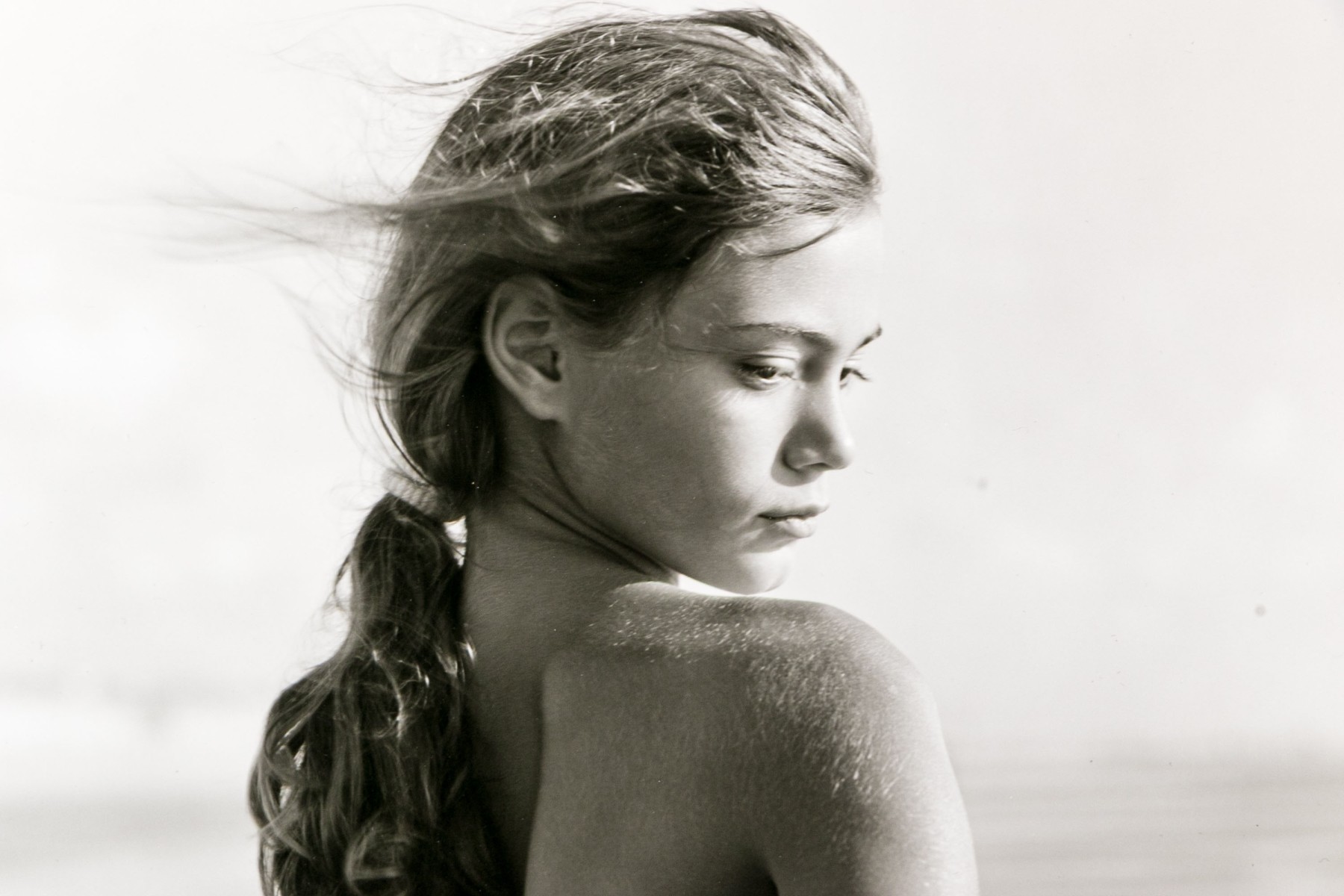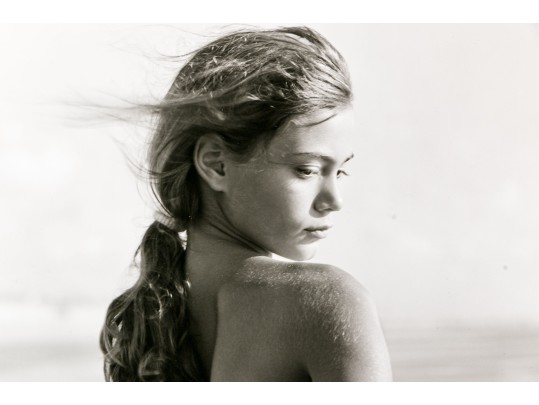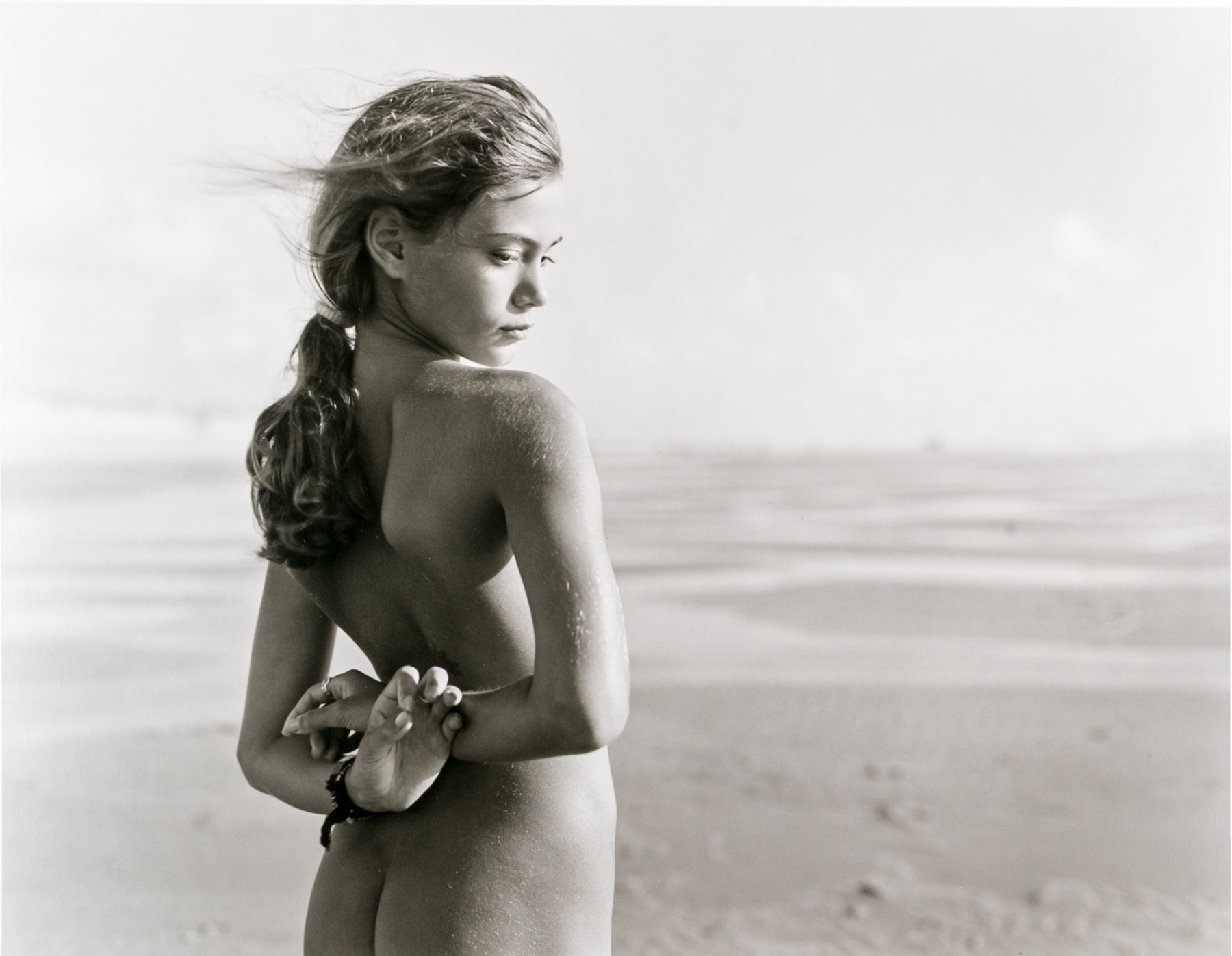 Jock Sturges (American, b. 1947) "Fanny, Montalivet, France" gelatin silver print depicting a nude brunette girl with hair in a ponytail posing looking over her shoulder while facing out towards the shore. Pencil signed, dated '96, and numbered 26/40. Unframed.