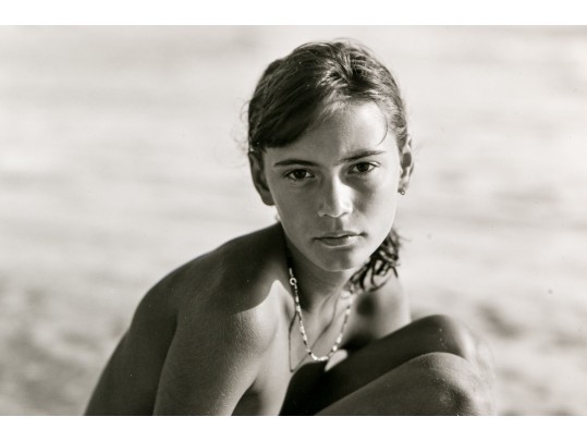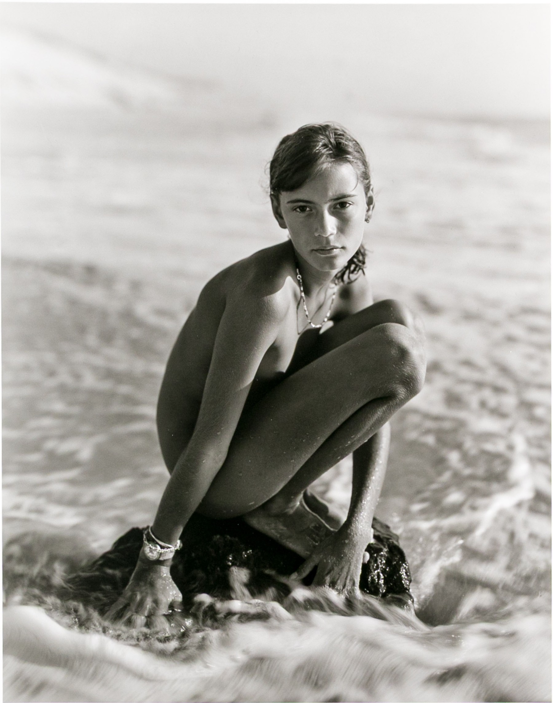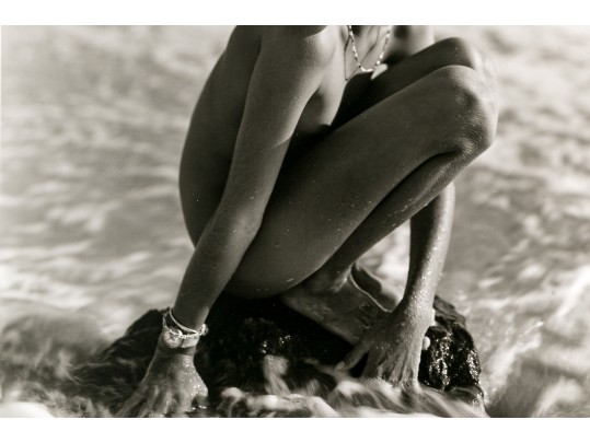 Jock Sturges (American, B. 1947) "Fanny, Montalivet, France" Gelatin silver print depicting a nude girl posed sitting with knees, perched on a rock surrounded by gently frothing waves. Signed, dated '97, and numbered 22/40. Unframed.