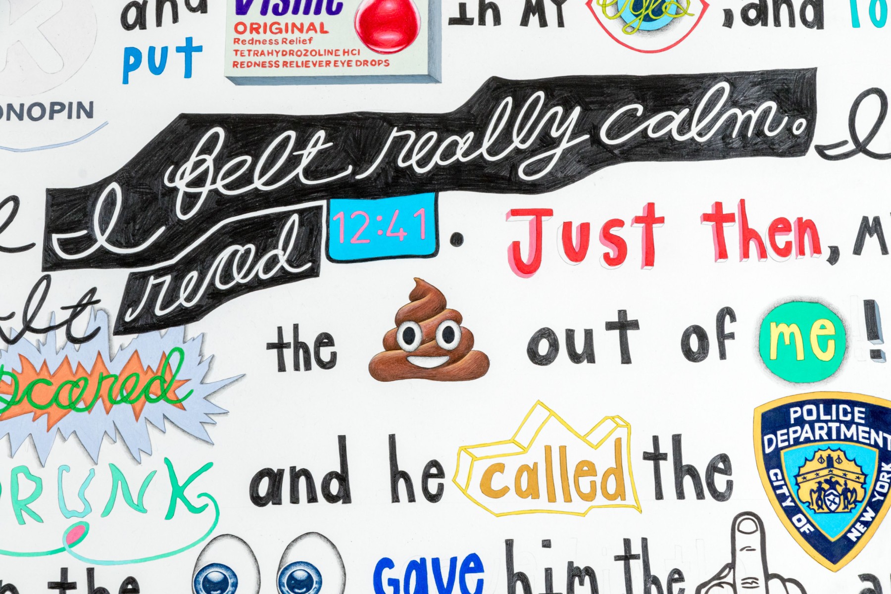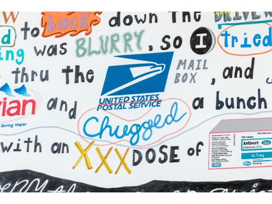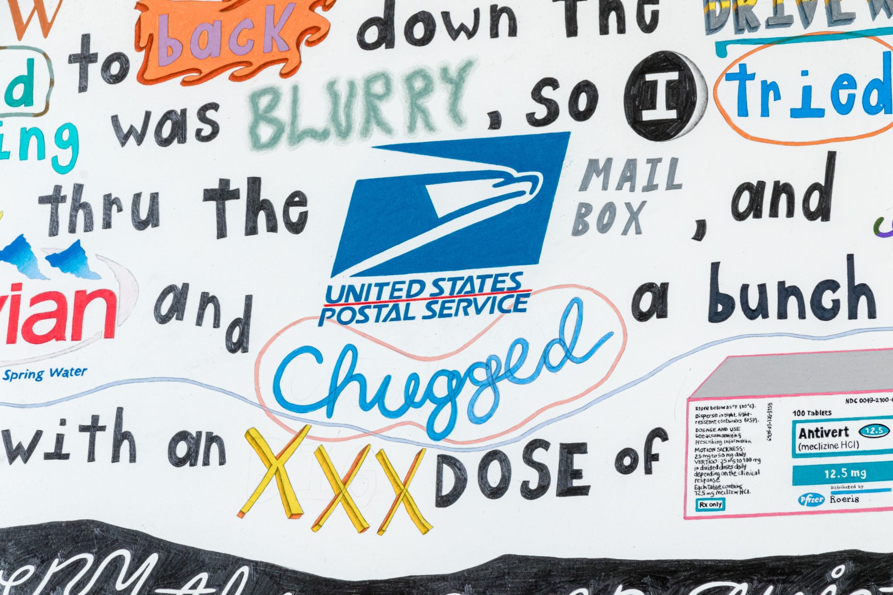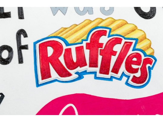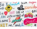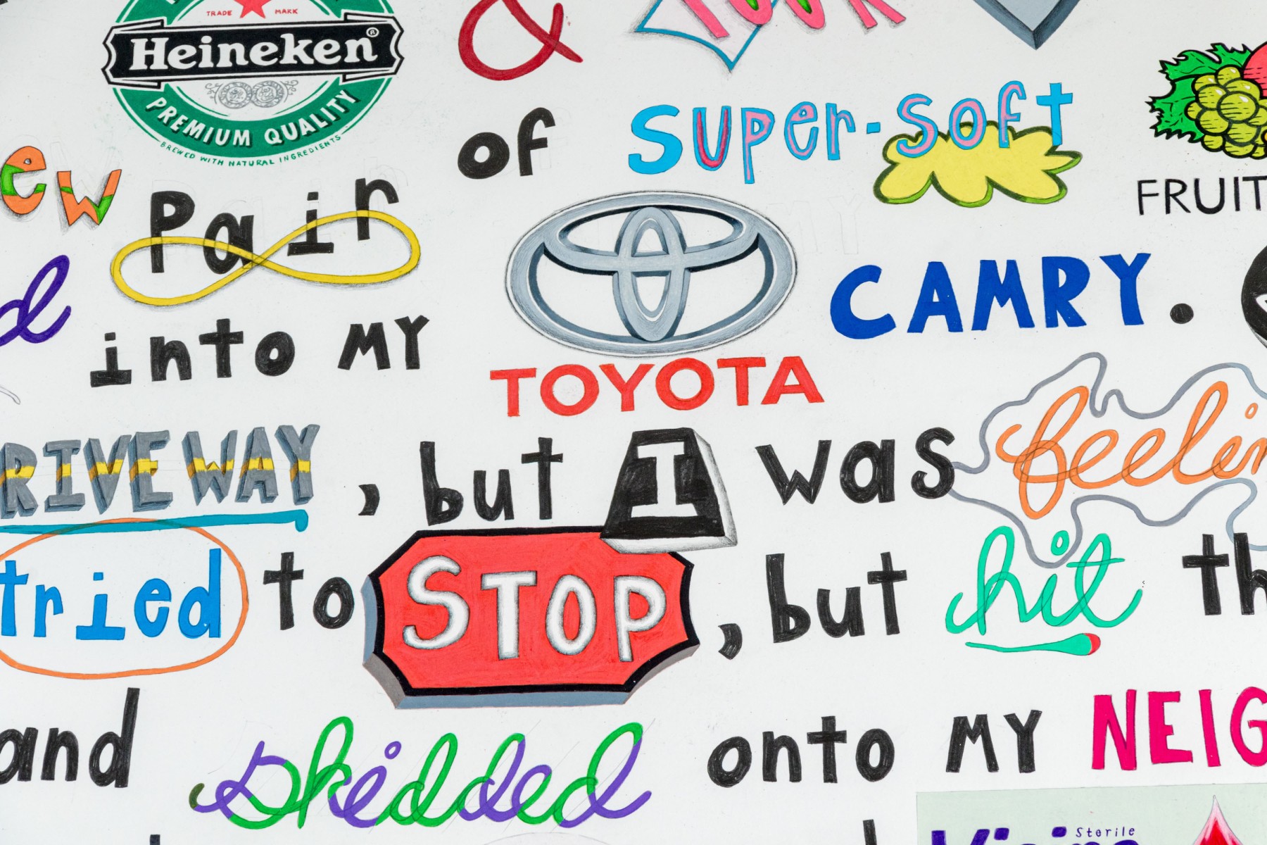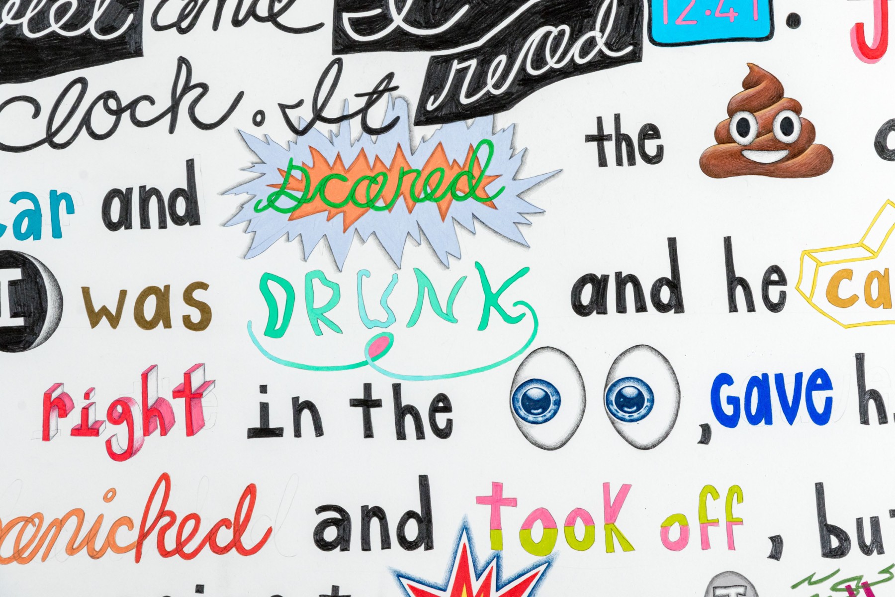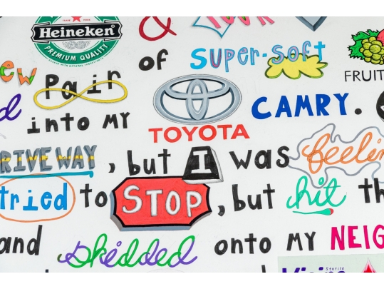 John Jerome O'Connor (American, born 1972) "Alfa" large scale mixed media graphite and colored pencil on paper. Features a vibrant pop style word art story incorporating brand logos and pictorial elements.