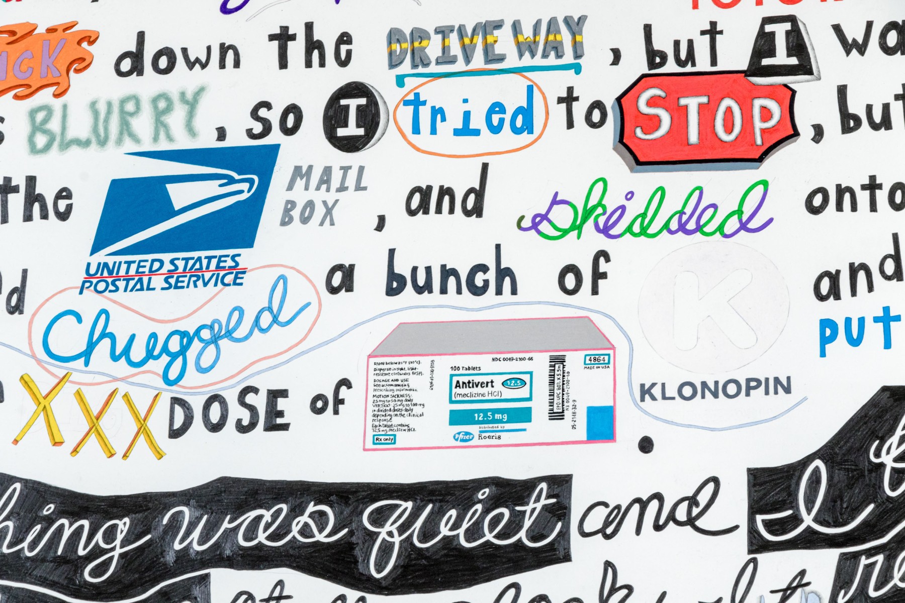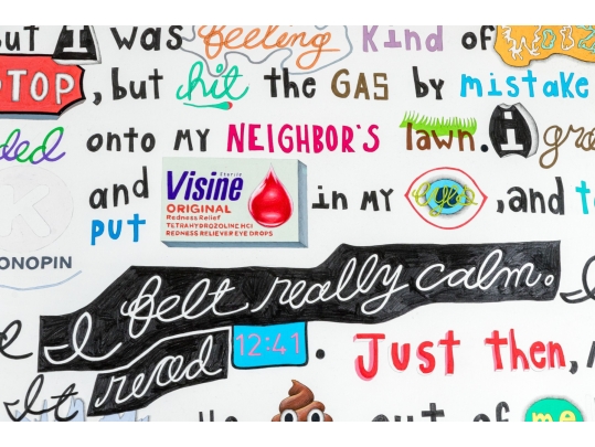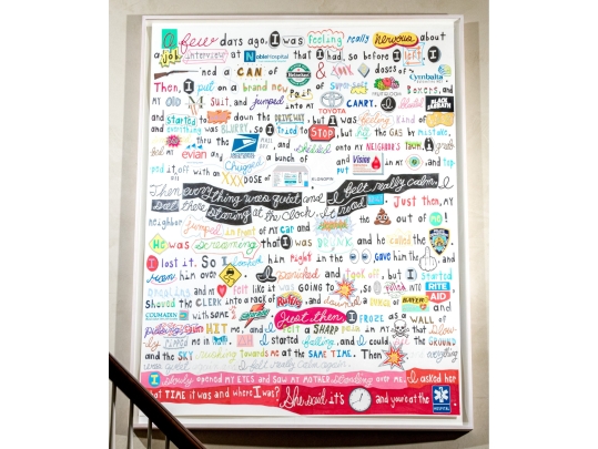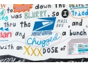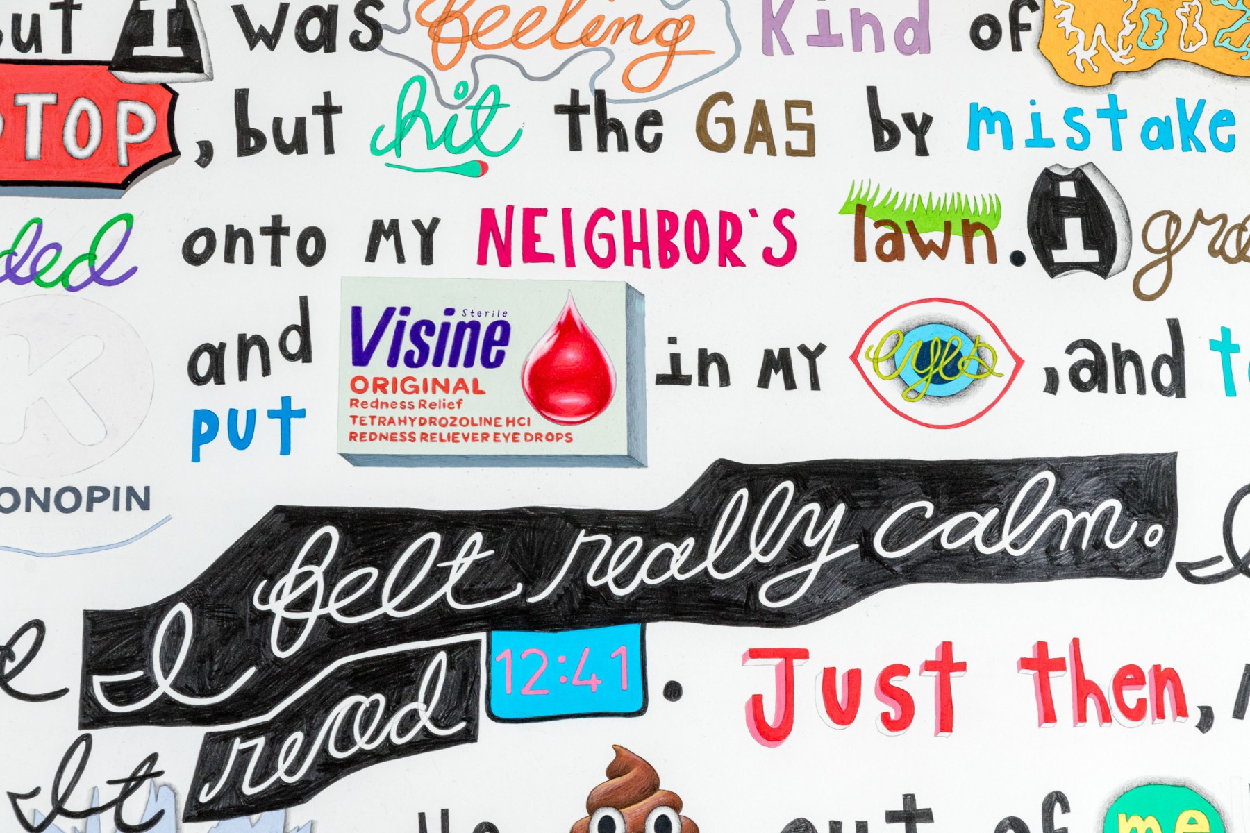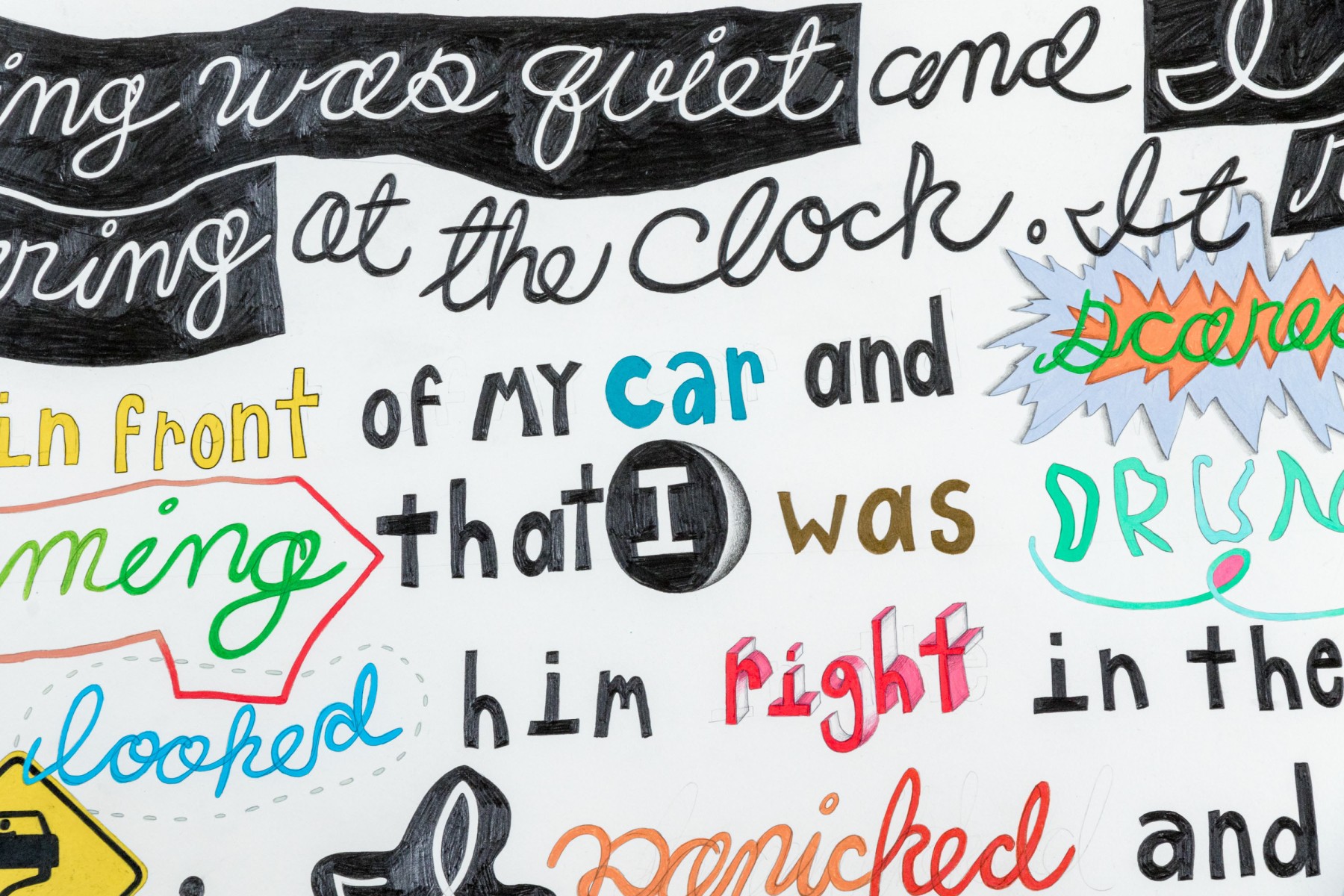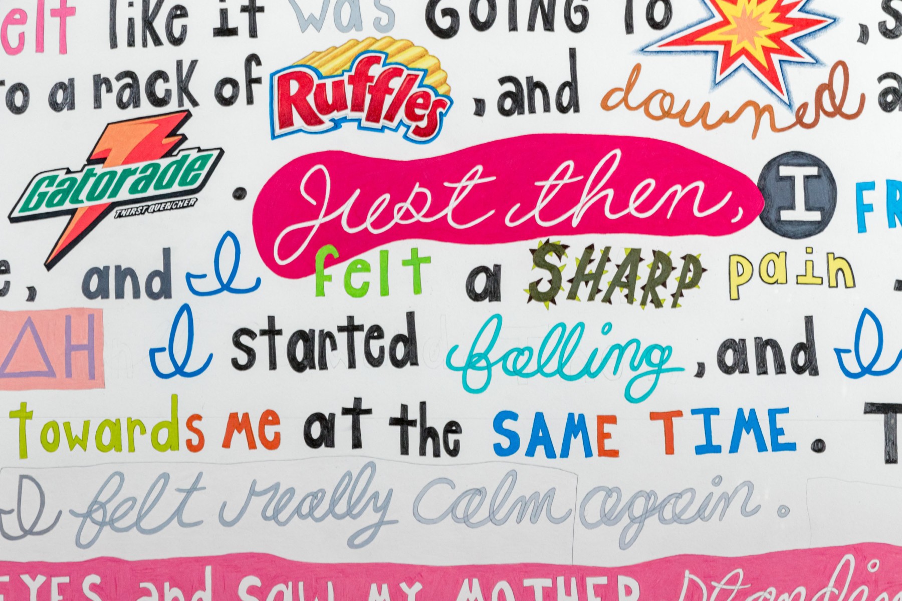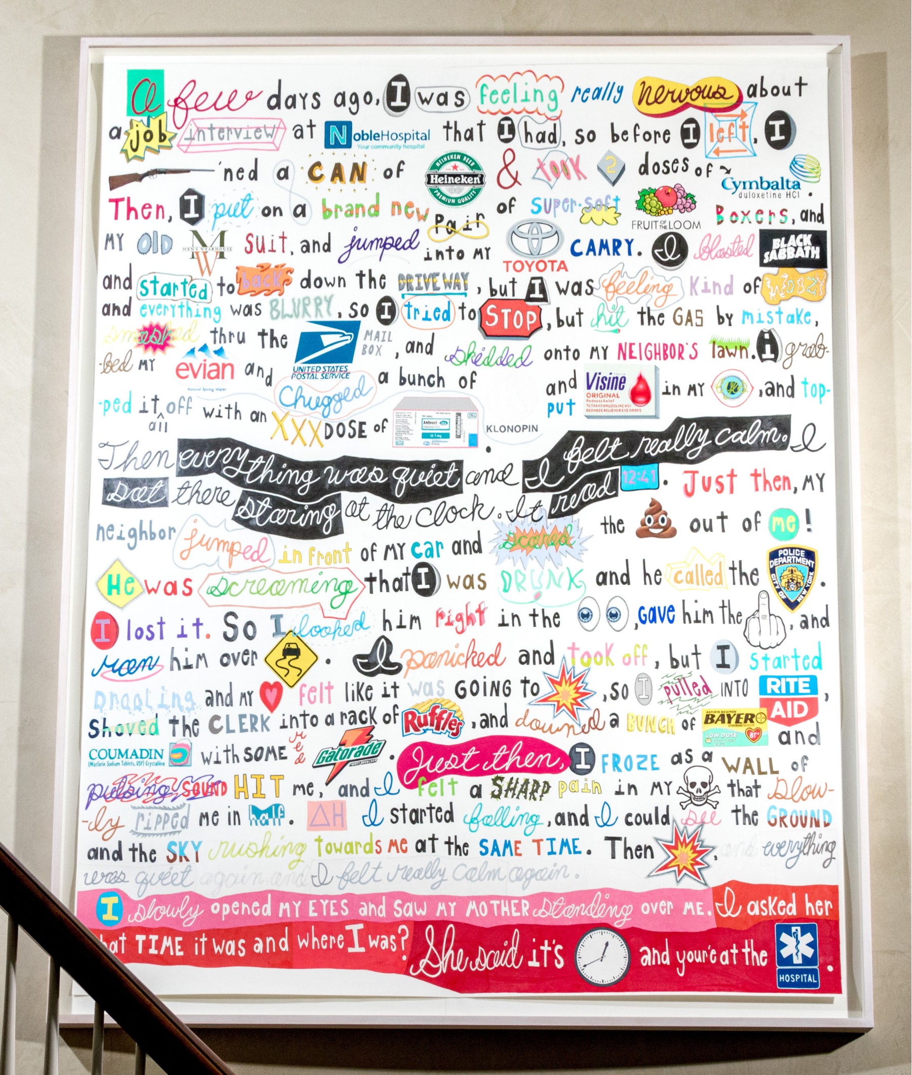 John Jerome O'Connor (American, born 1972) "Alfa" large scale mixed media graphite and colored pencil on paper. Features a vibrant pop style word art story incorporating brand logos and pictorial elements.