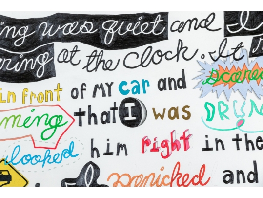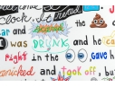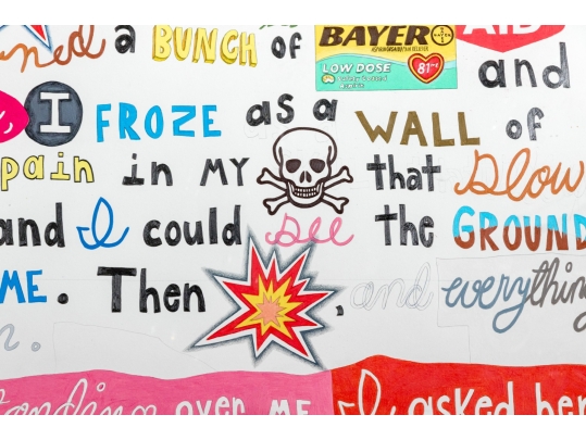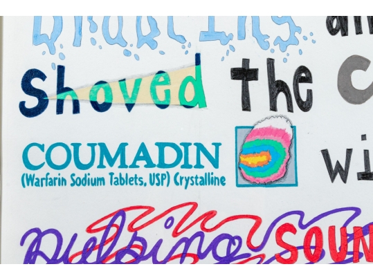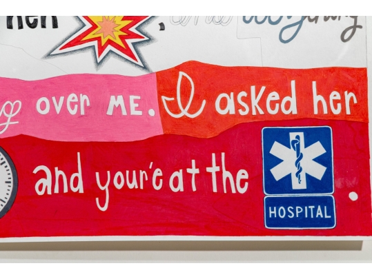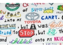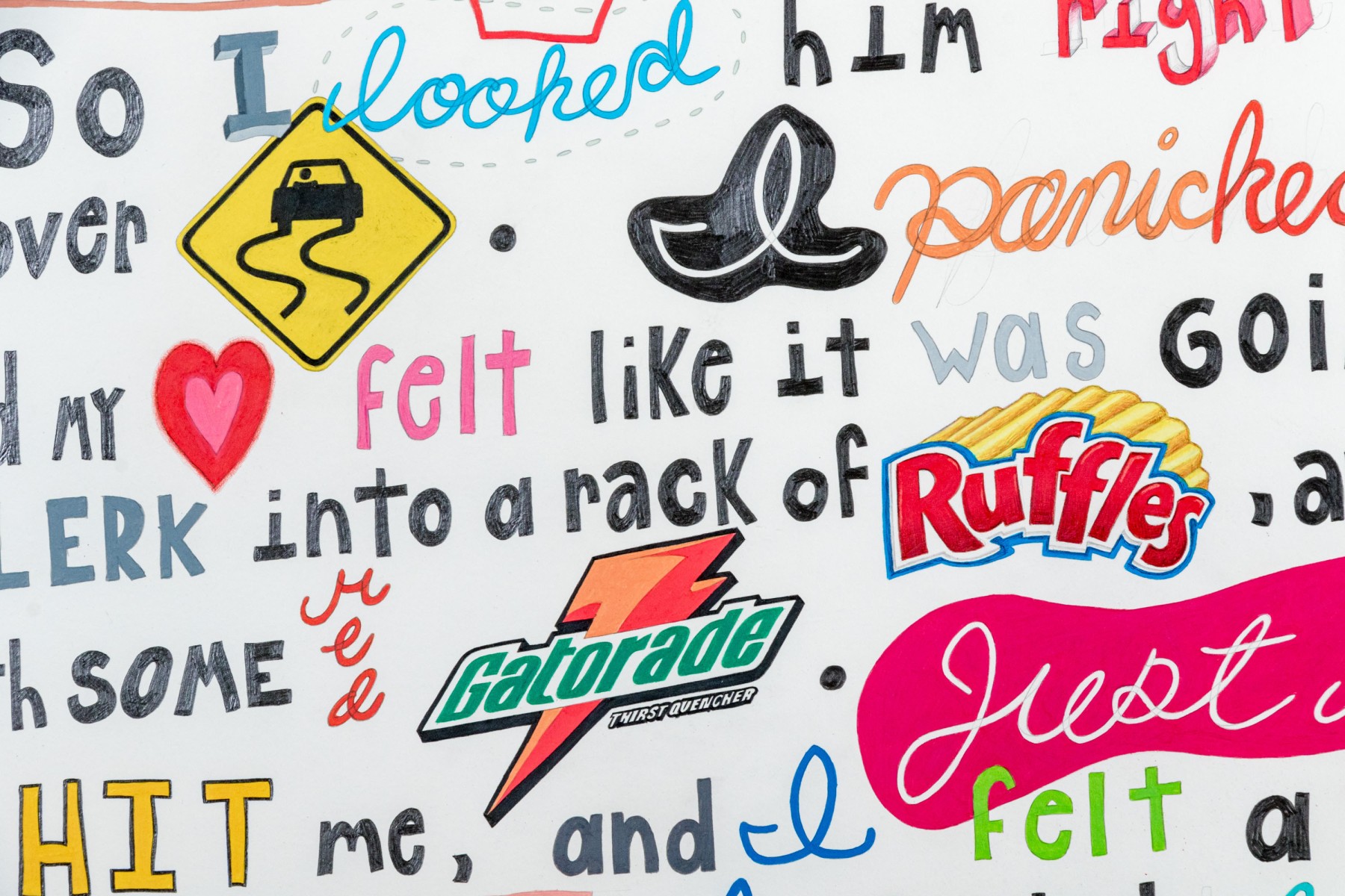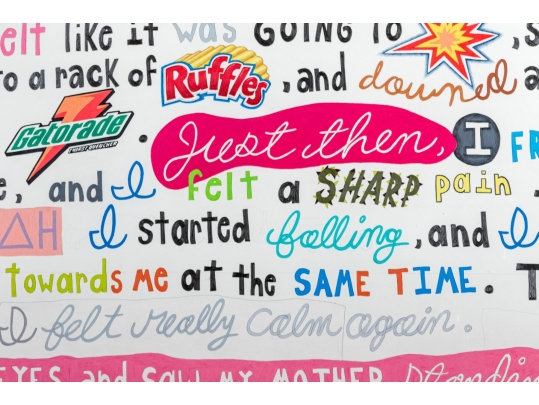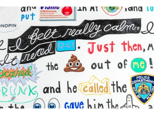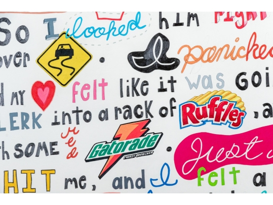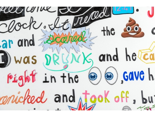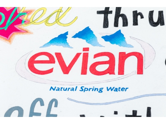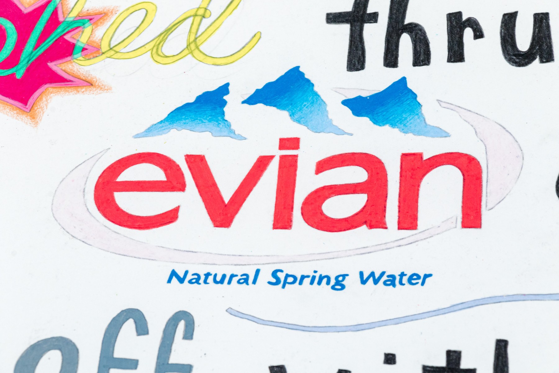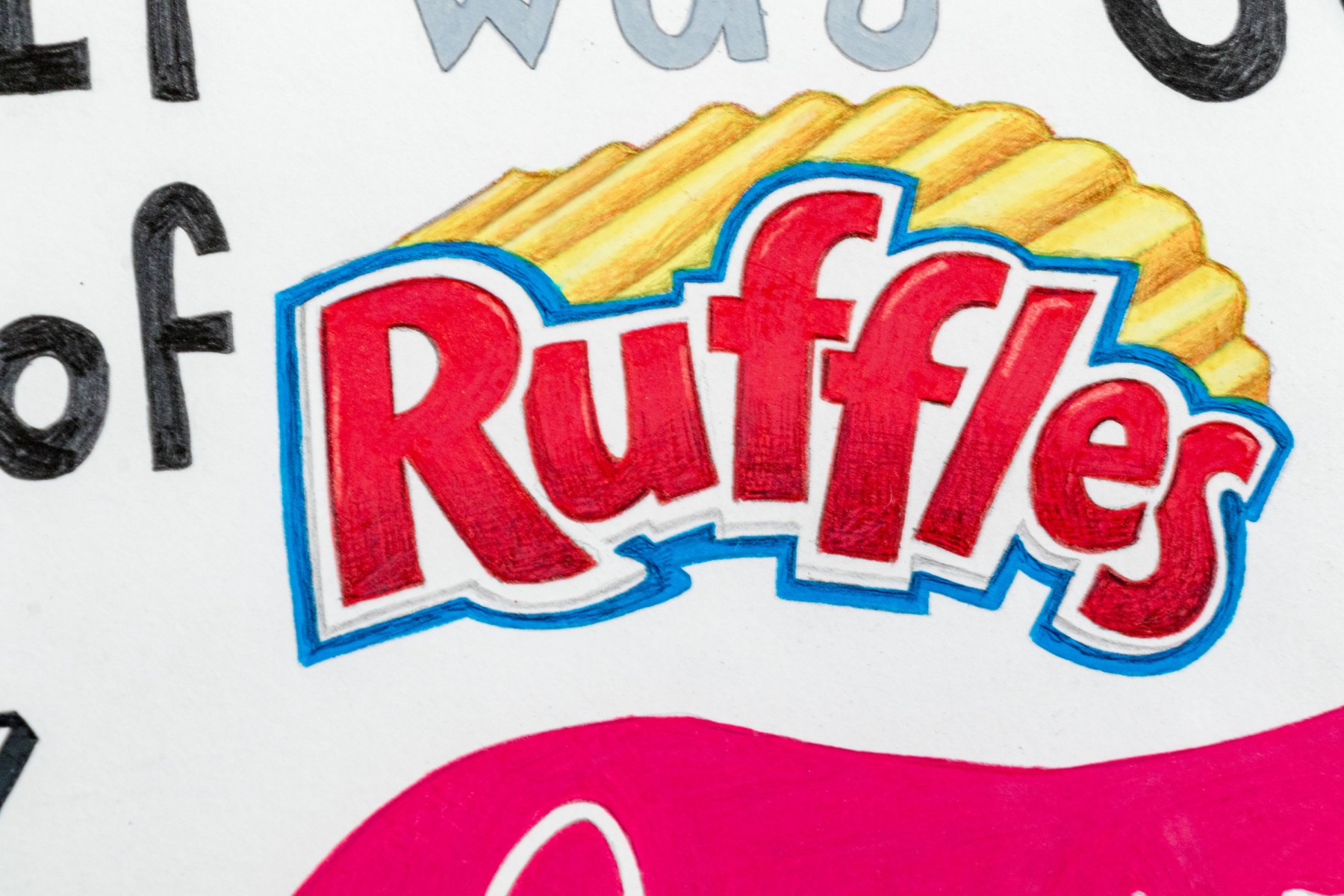 John Jerome O'Connor (American, born 1972) "Alfa" large scale mixed media graphite and colored pencil on paper. Features a vibrant pop style word art story incorporating brand logos and pictorial elements.