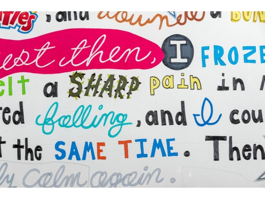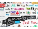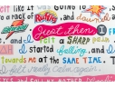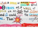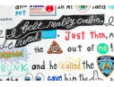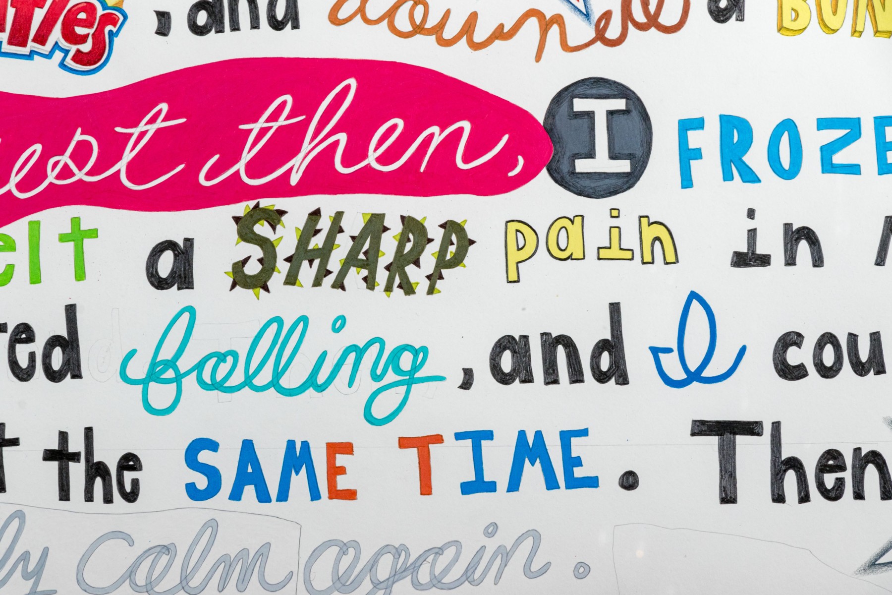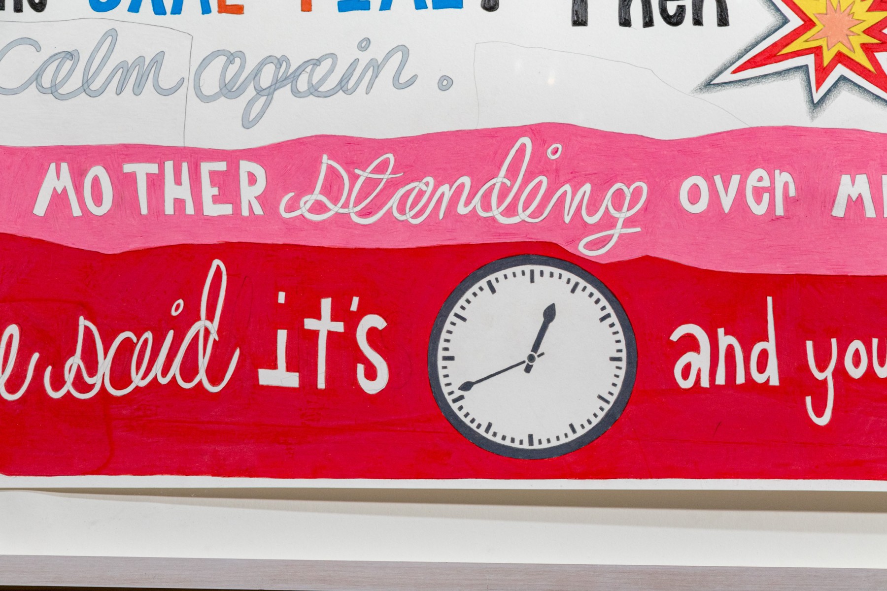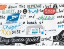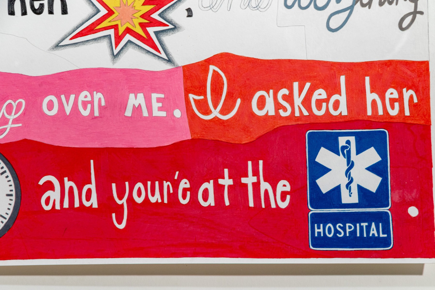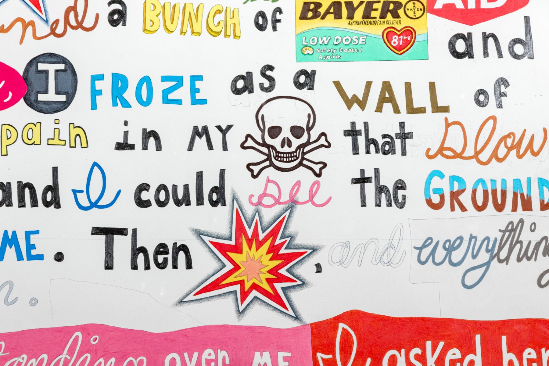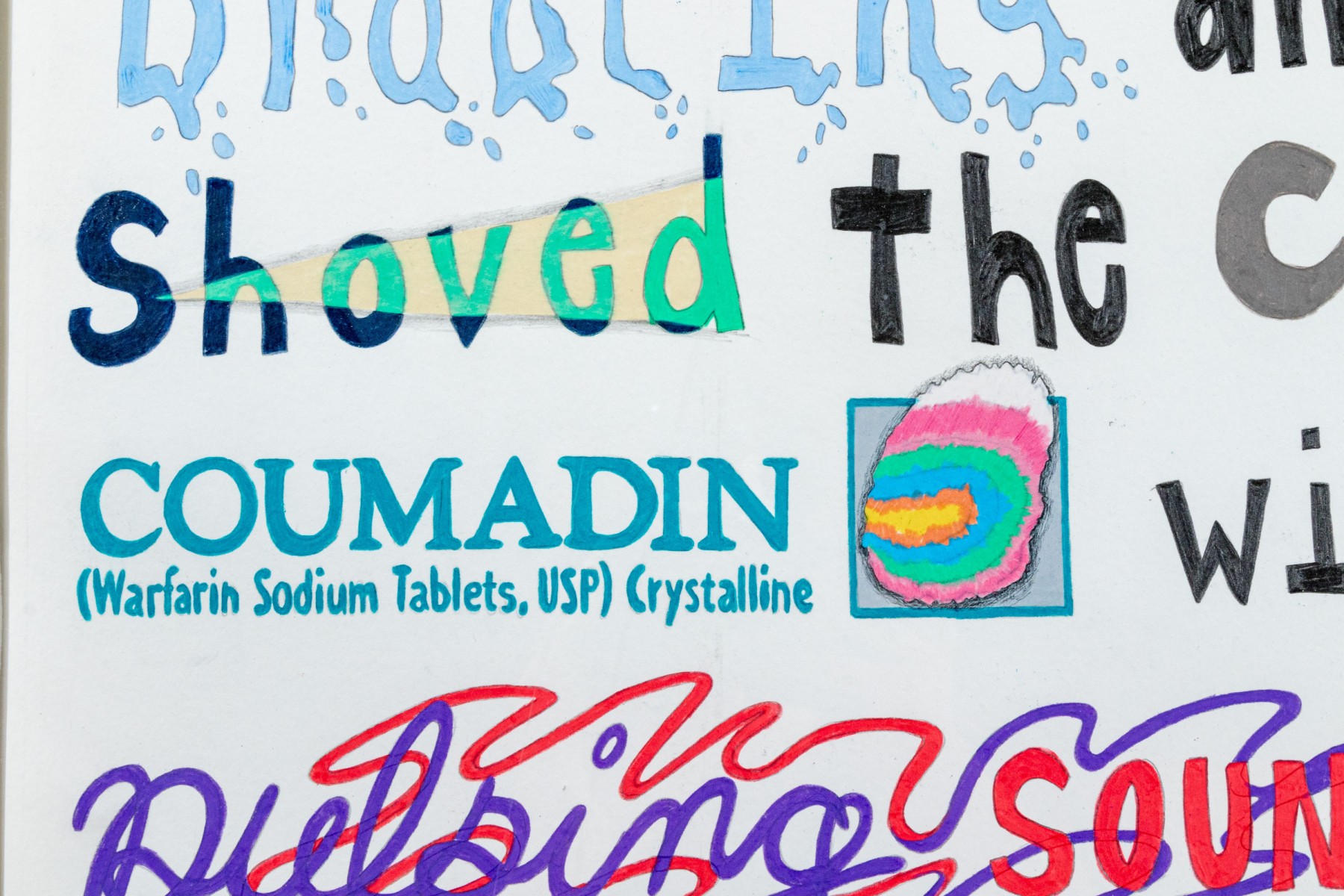 John Jerome O'Connor (American, born 1972) "Alfa" large scale mixed media graphite and colored pencil on paper. Features a vibrant pop style word art story incorporating brand logos and pictorial elements.
