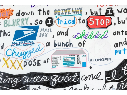 O'Connor provides a description of the "Alfa (Day One)": "First work in a series of 26 pieces documenting the narrative account of an individual's passage through time, as he encounters various physical, emotional, and chemical obstacles."