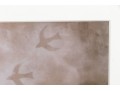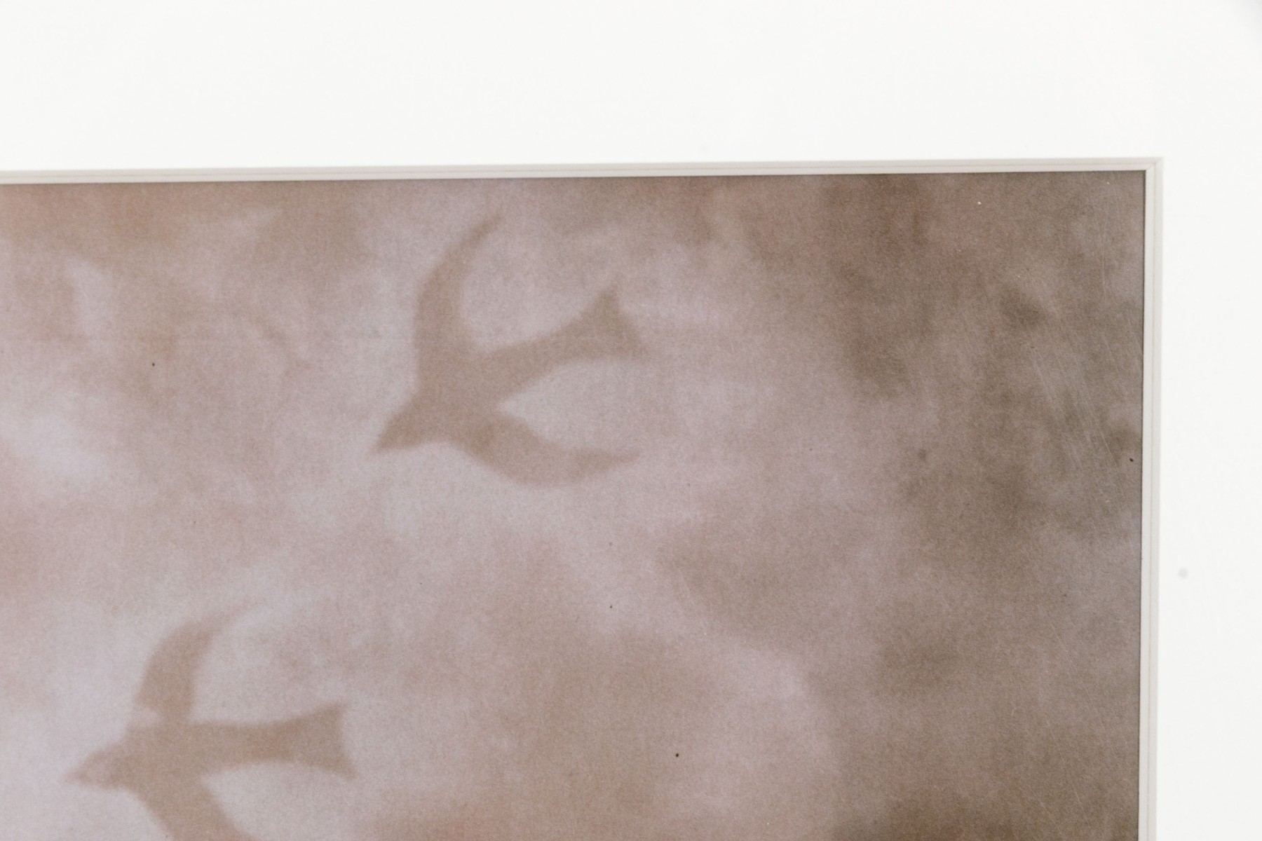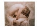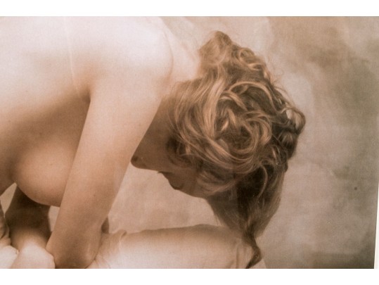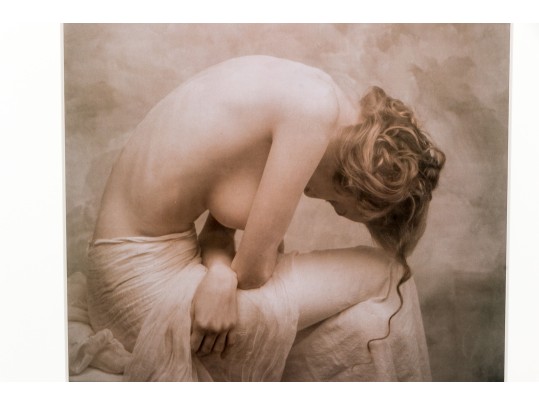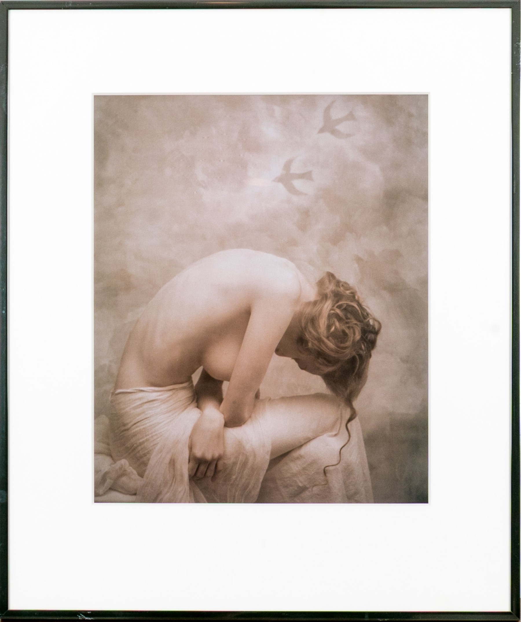Joyce Tenneson (American, b. 1945) "Bird Woman (Suzanne)" photograph depicting a female nude wrapped in a gauzy cream white skirt posed seated and hunched over with curly hair in an updo against a backdrop of two birds flying across a dusty rose/beige ground with a foggy or cloudy appearance. Labeled on the verso denoting that the photograph is signed and numbered 24/50.
