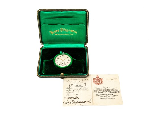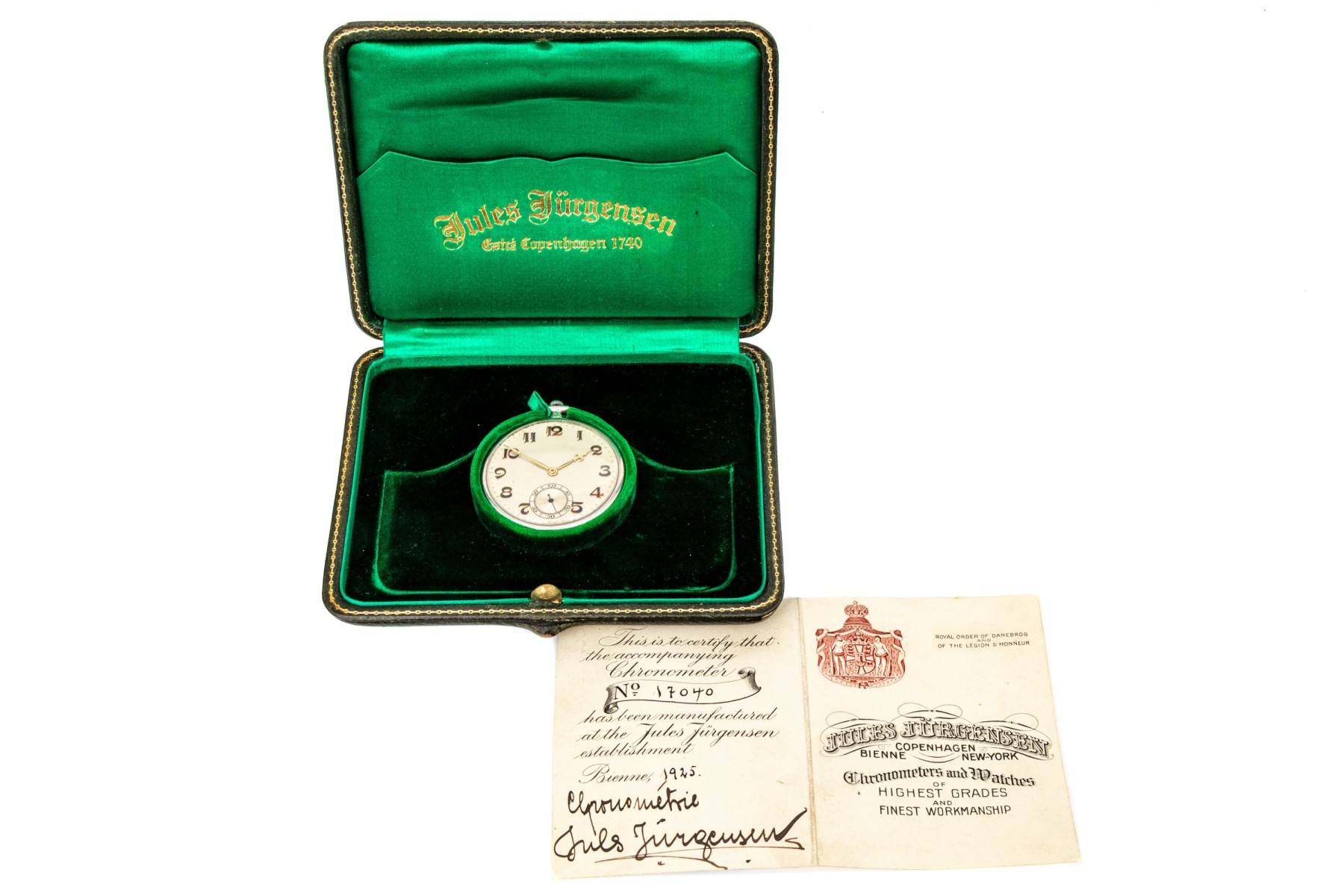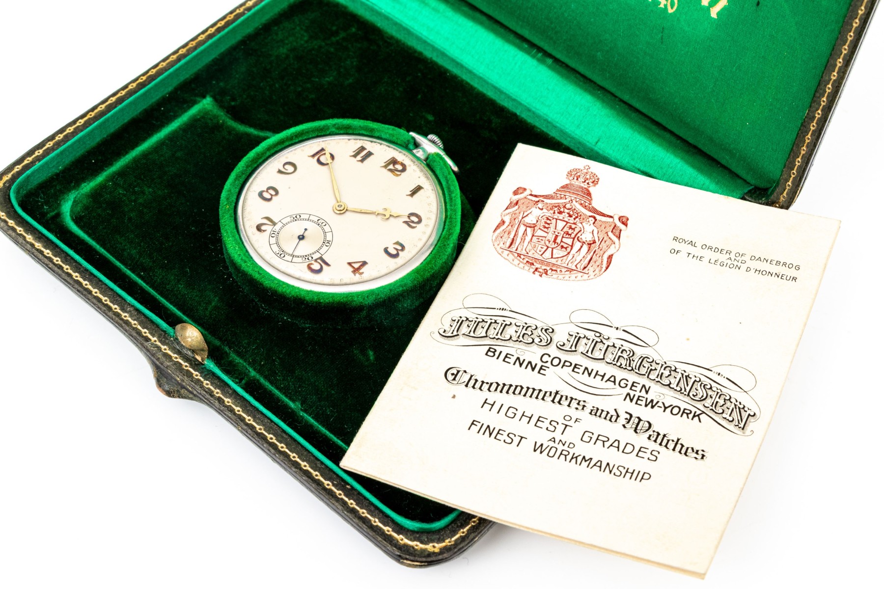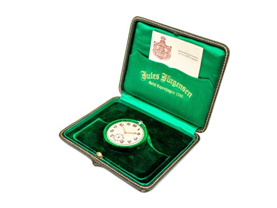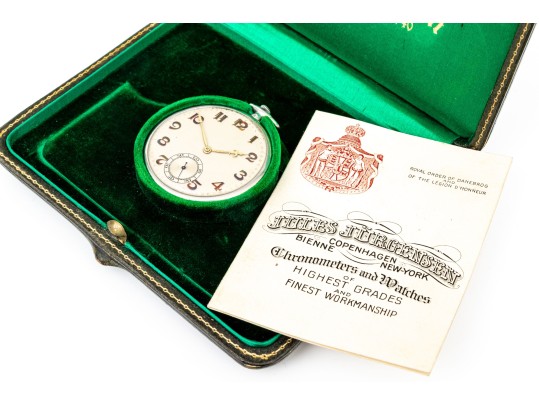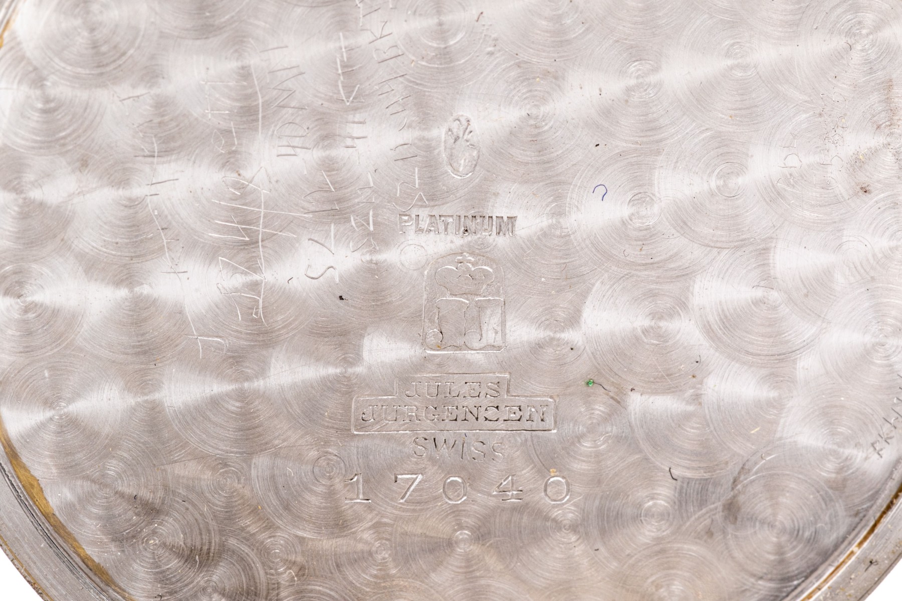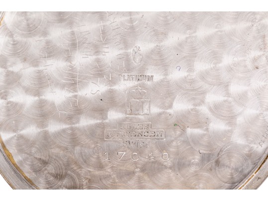 Jules Jurgensen magnificent antique platinum pocketwatch, original box and papers. This amazing pocket watch is an open style, with a silvered dial with arabic numerals, subdial at 6pm; monogrammed on the reverse, and made with a hand wound mechanical movement. This wonderful piece is accompanied by the original box and papers, made in 1925