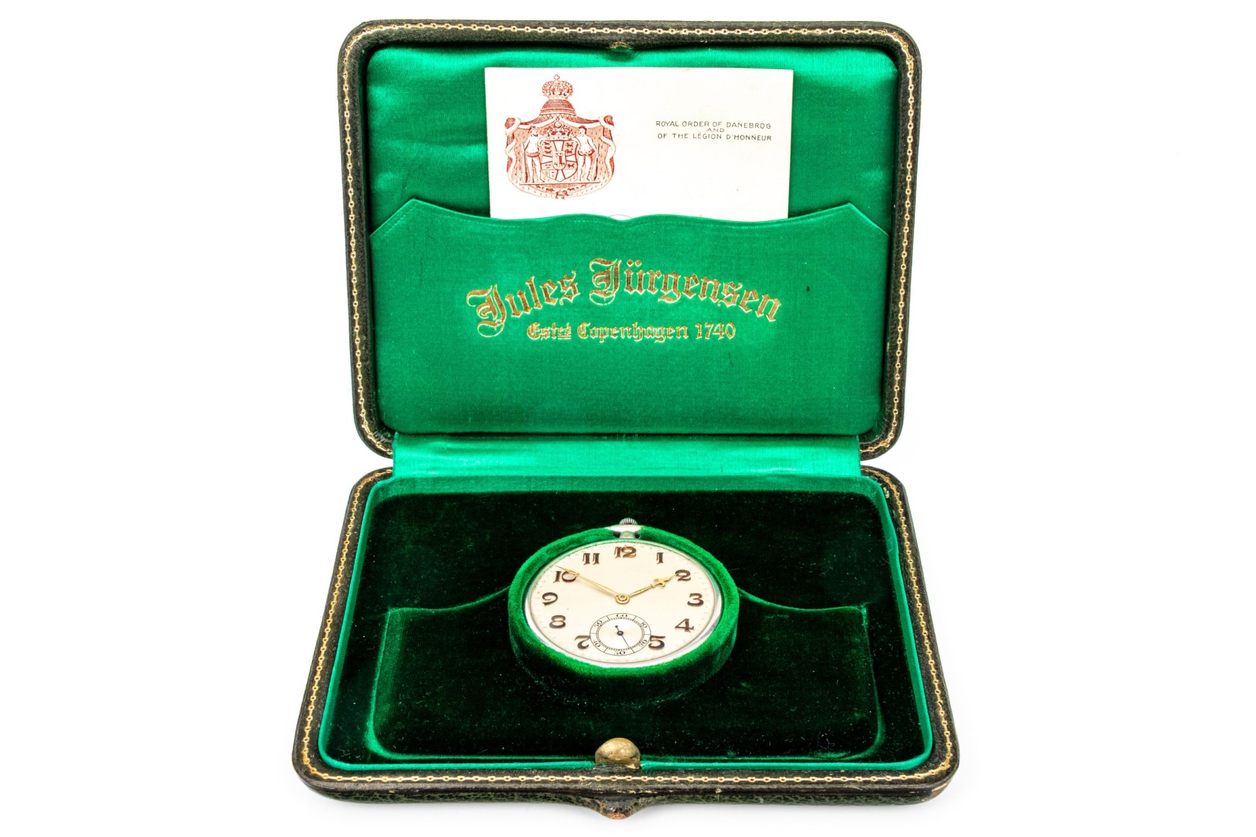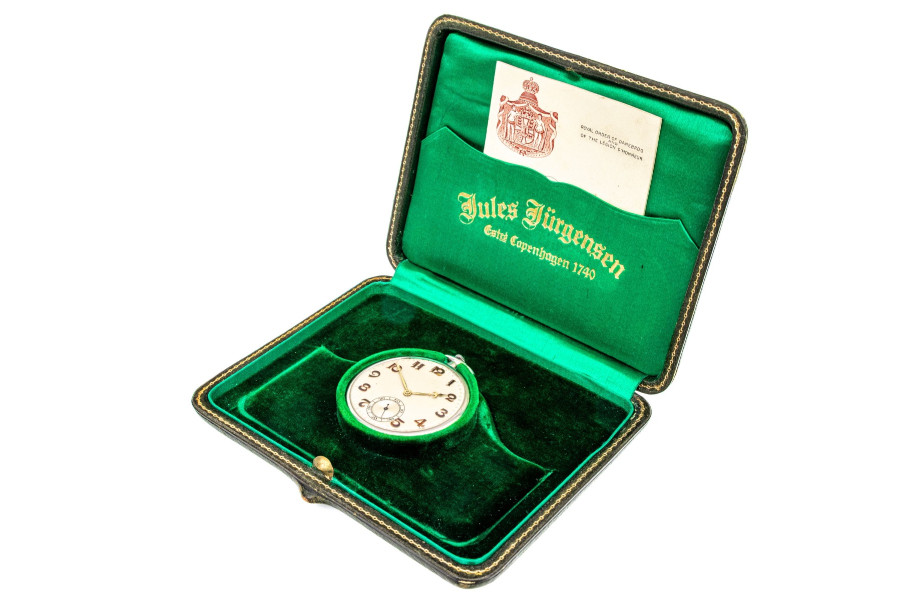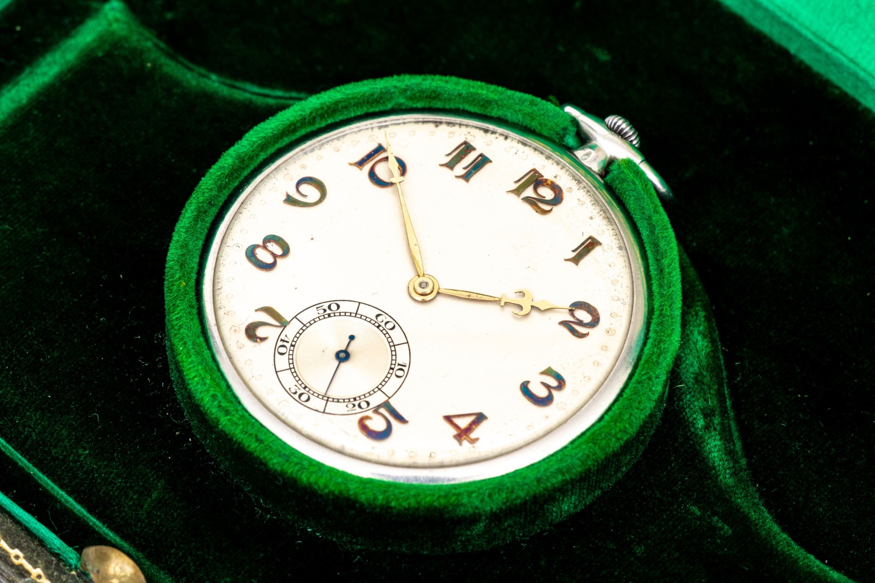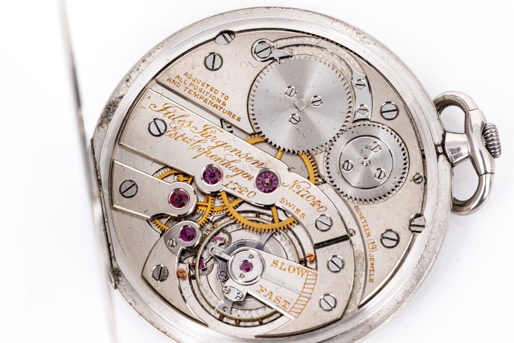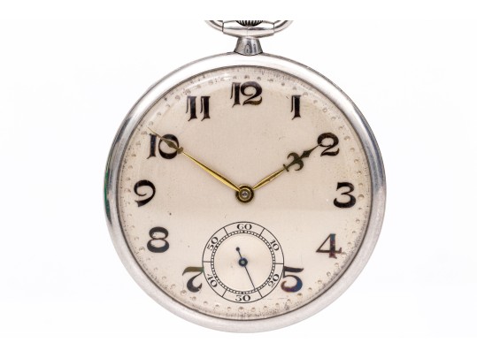 Jules Jurgensen magnificent antique platinum pocketwatch, original box and papers. This amazing pocket watch is an open style, with a silvered dial with arabic numerals, subdial at 6pm; monogrammed on the reverse, and made with a hand wound mechanical movement. This wonderful piece is accompanied by the original box and papers, made in 1925