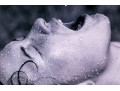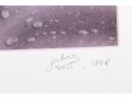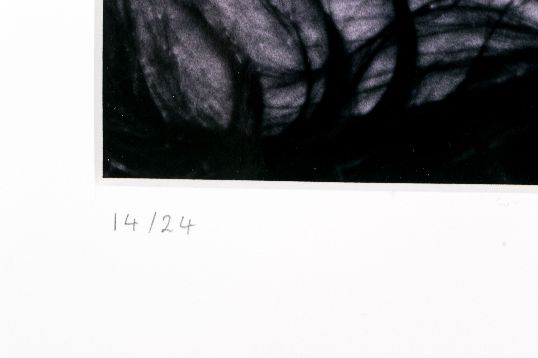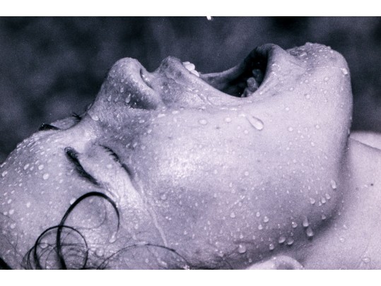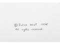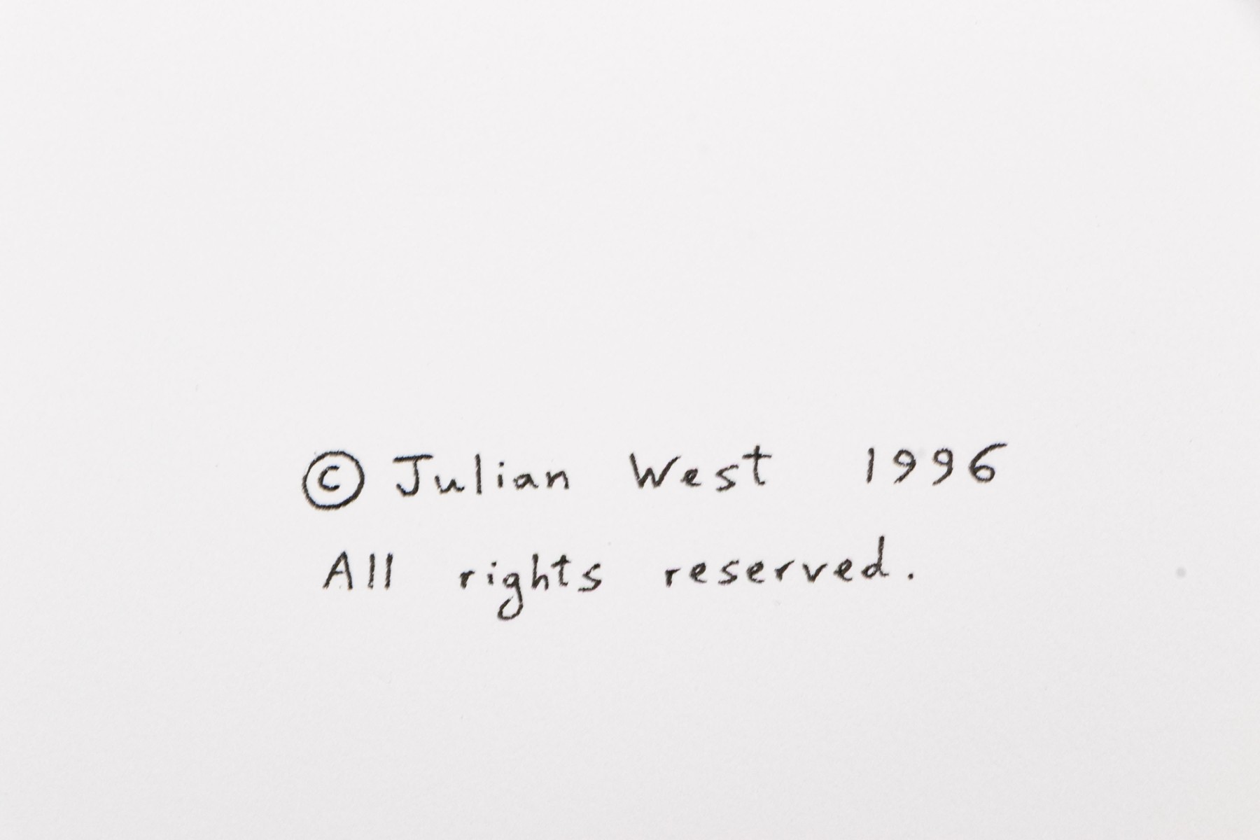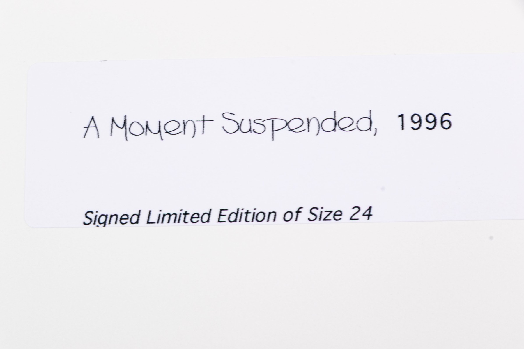 Julian West (American [CA], B. 1964) "A moment Suspended, 1996" mounted photographic print depicting a figure in profile damp with water droplet, mouth wide open under falling droplets against a dappled natural background. Pencil signed and dated 1996 lower right, numbered 14/24 lower left, copyright and artist labels on the verso. Unframed.