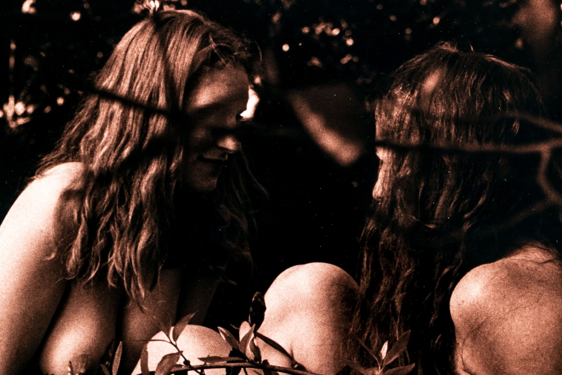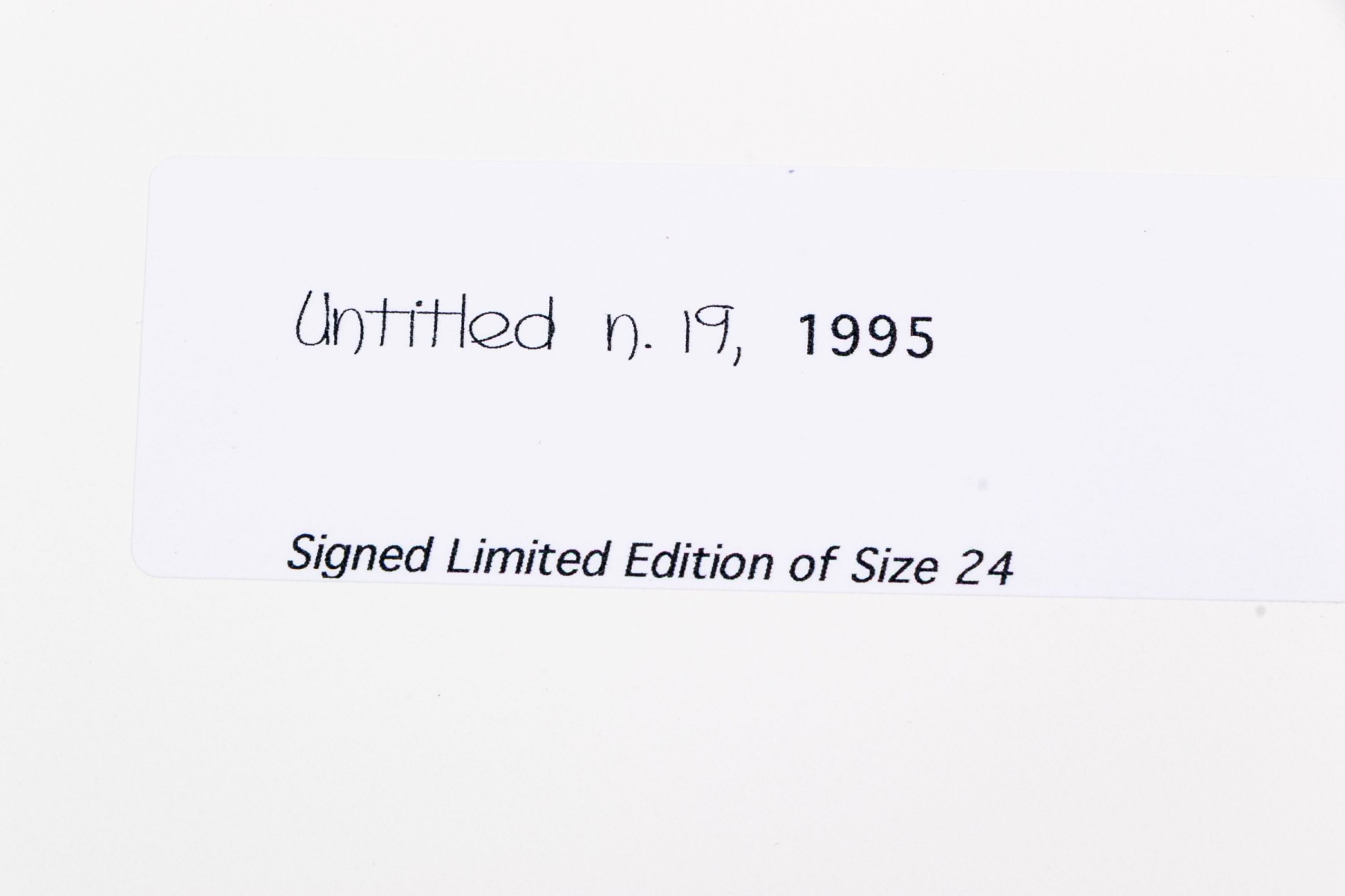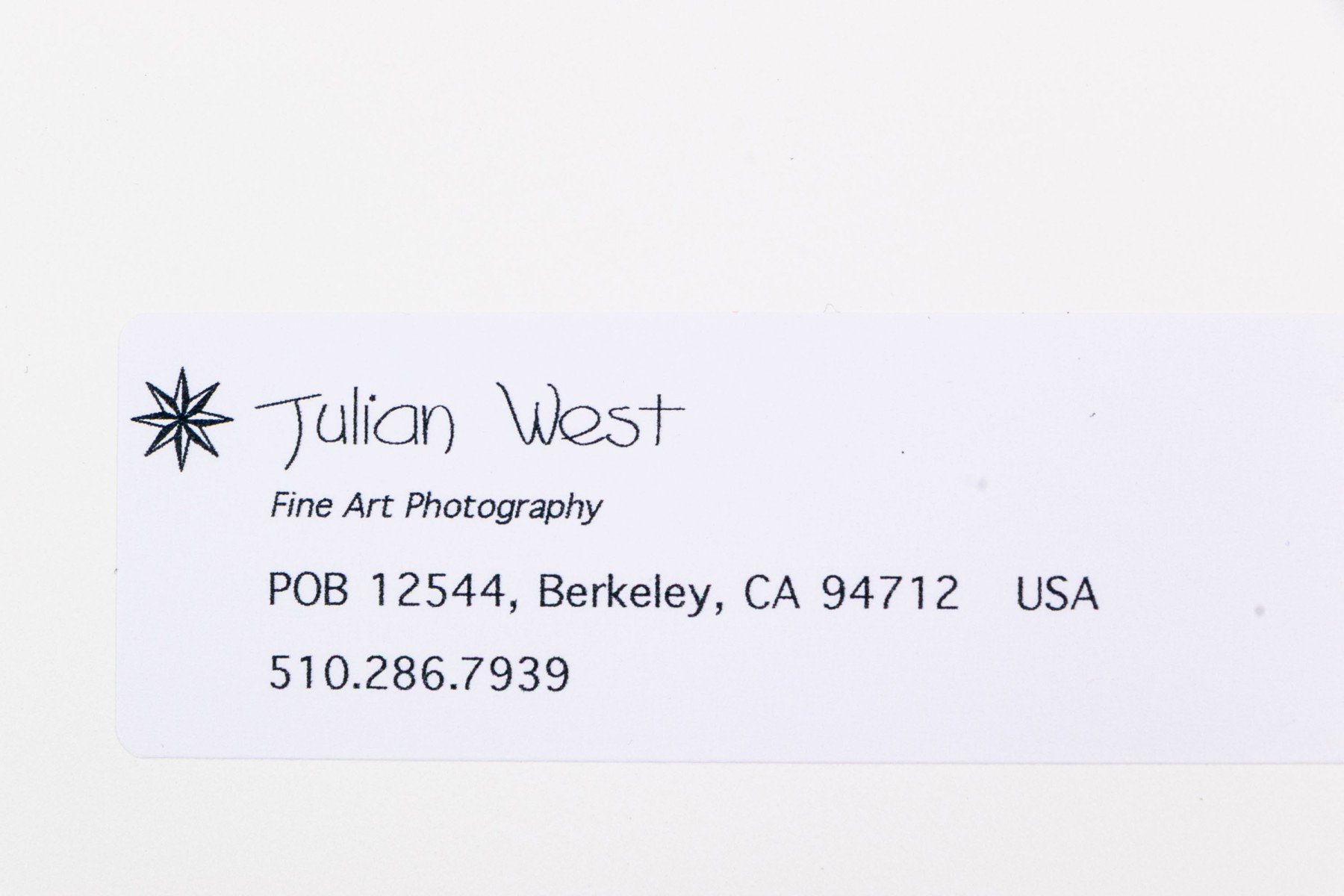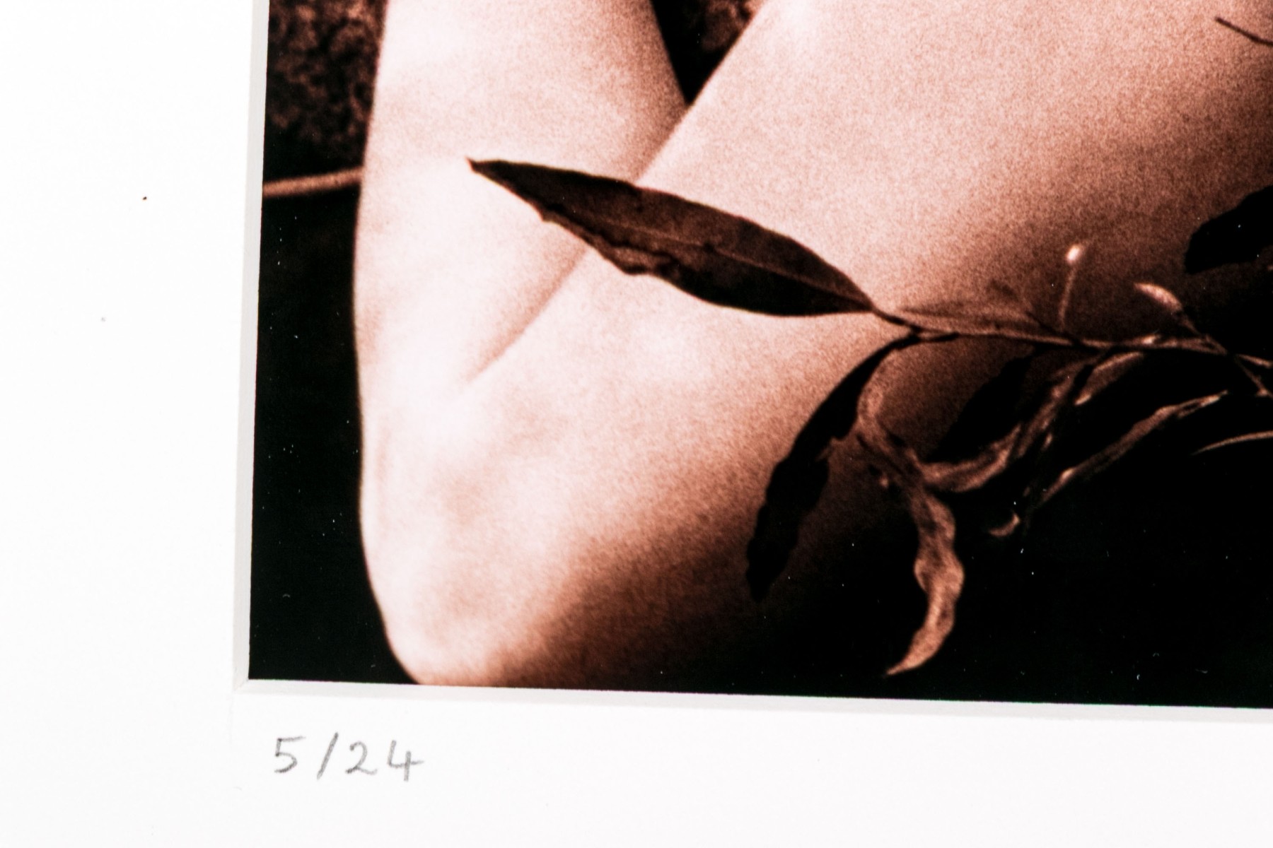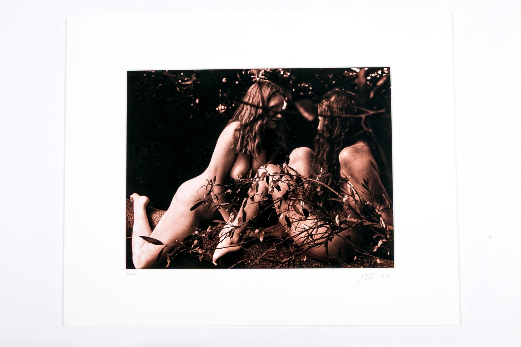 Julian West (American [CA], b. 1964) "Untitled n. 19, 1995" mounted photographic print depicting two nude figures sitting on a fallen tree partially obscured by forest foliage. Pencil signed and dated 1995 lower right, numbered 5/24 lower left, with copyright and artist labels on the verso. Unframed.
