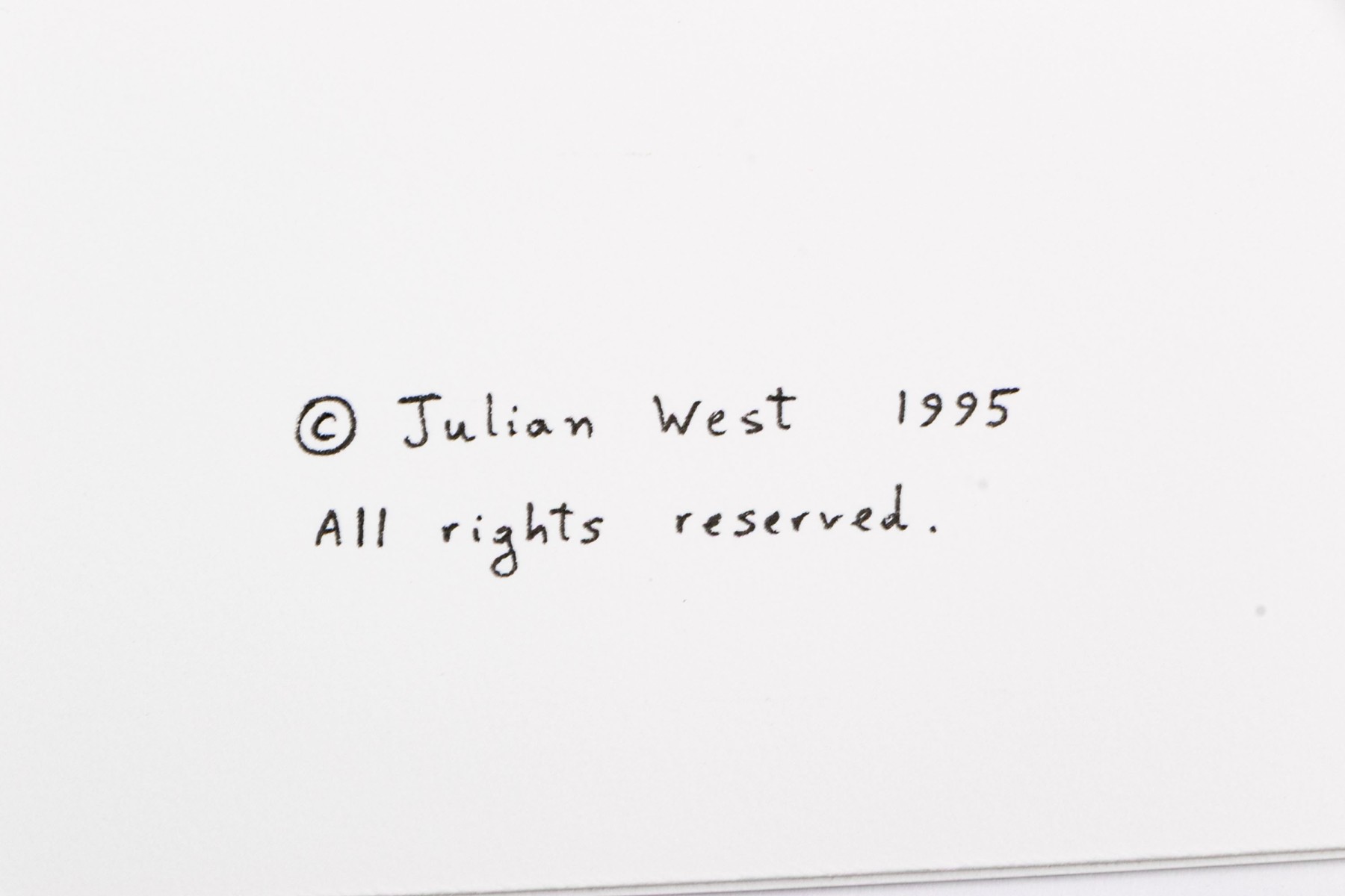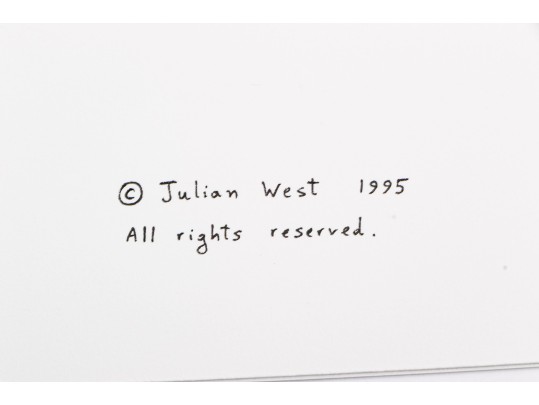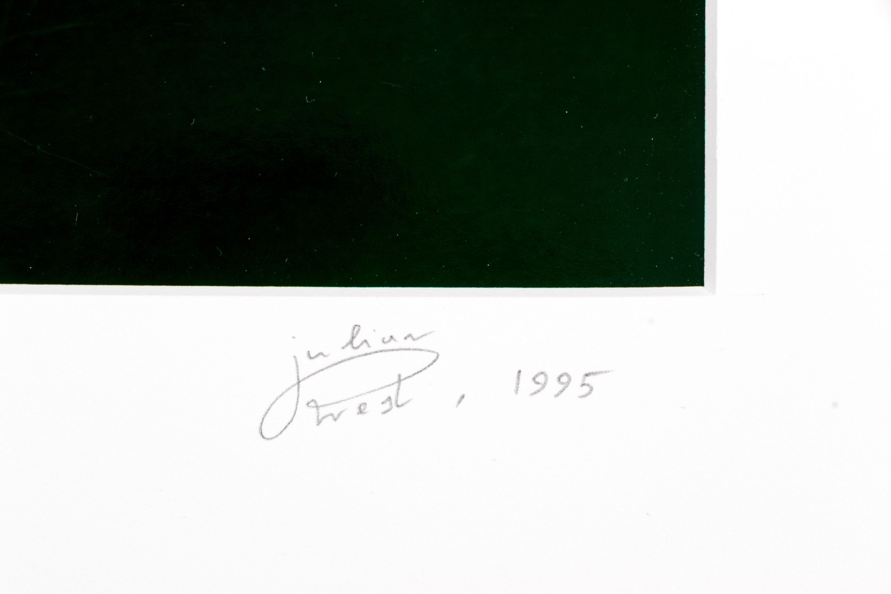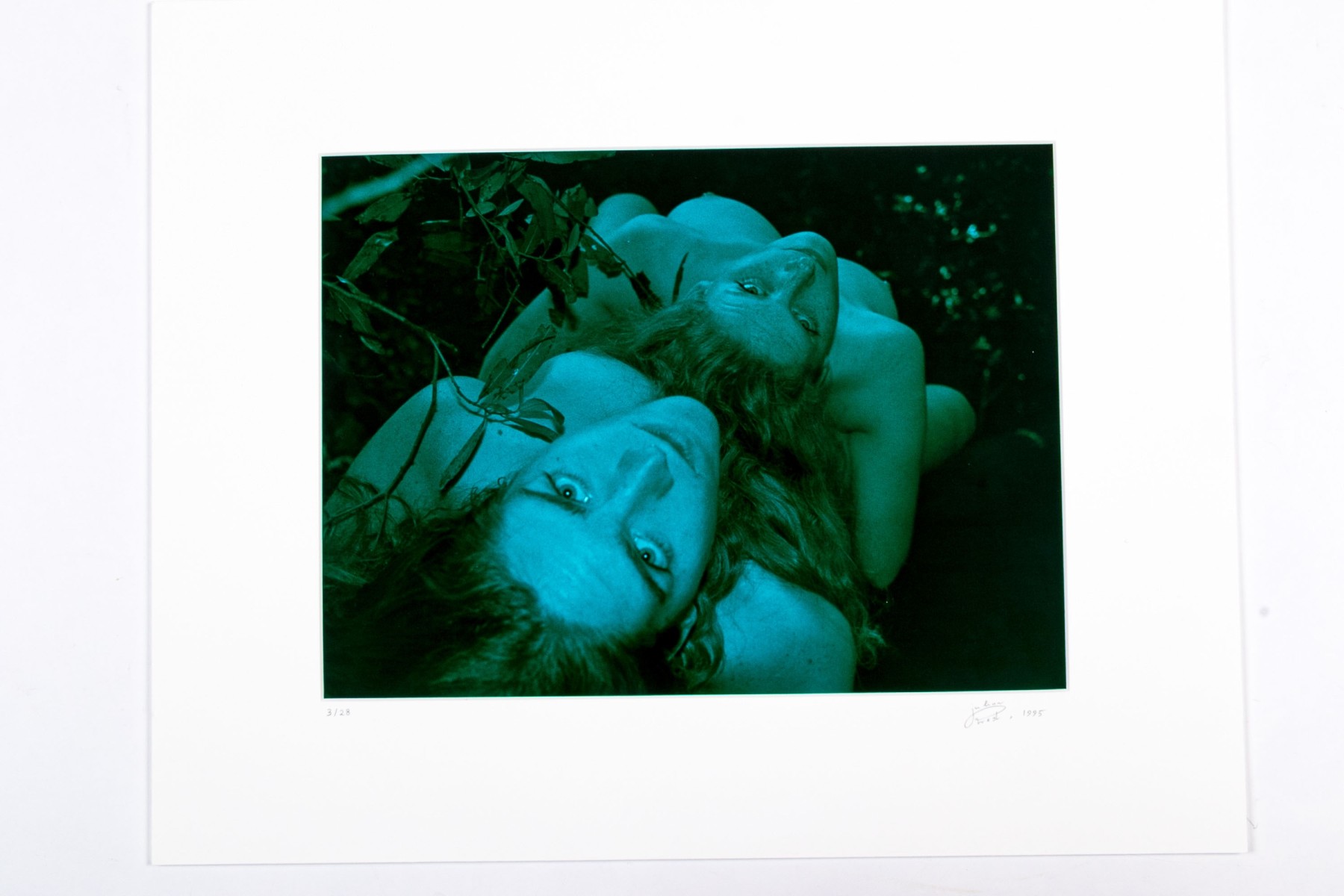 Julian West (American [CA], B. 1964) "Untitled n. 20, 1995" mounted photographic print depicting two nude figures looking up at the viewer surrounded by forest foliage in an atmospheric blue-green tint. Pencil signed and dated 1995 lower right, numbered 3/28 lower left, copyright and artist labels on the verso. Unframed.