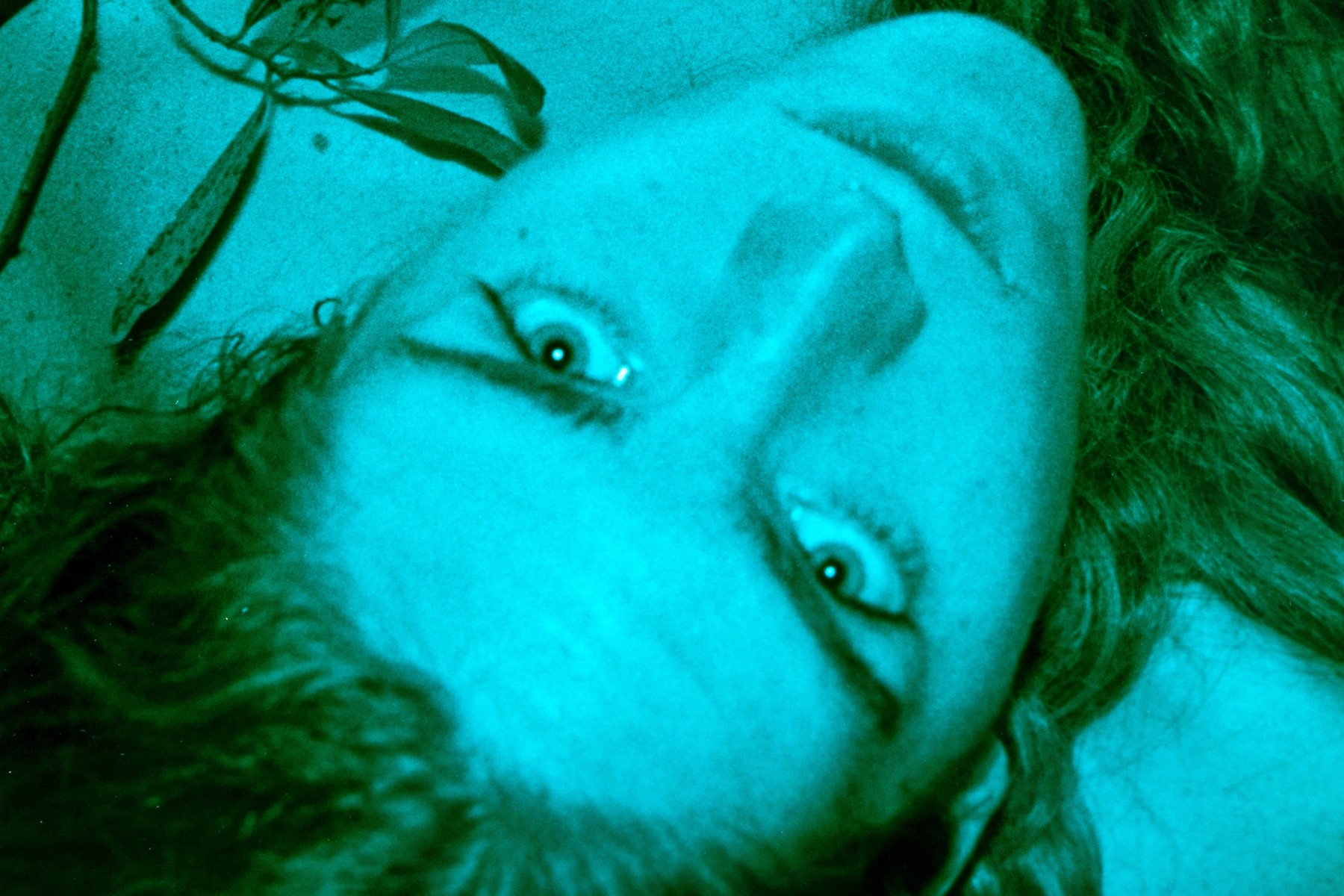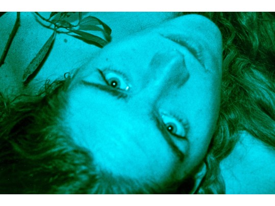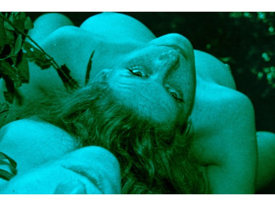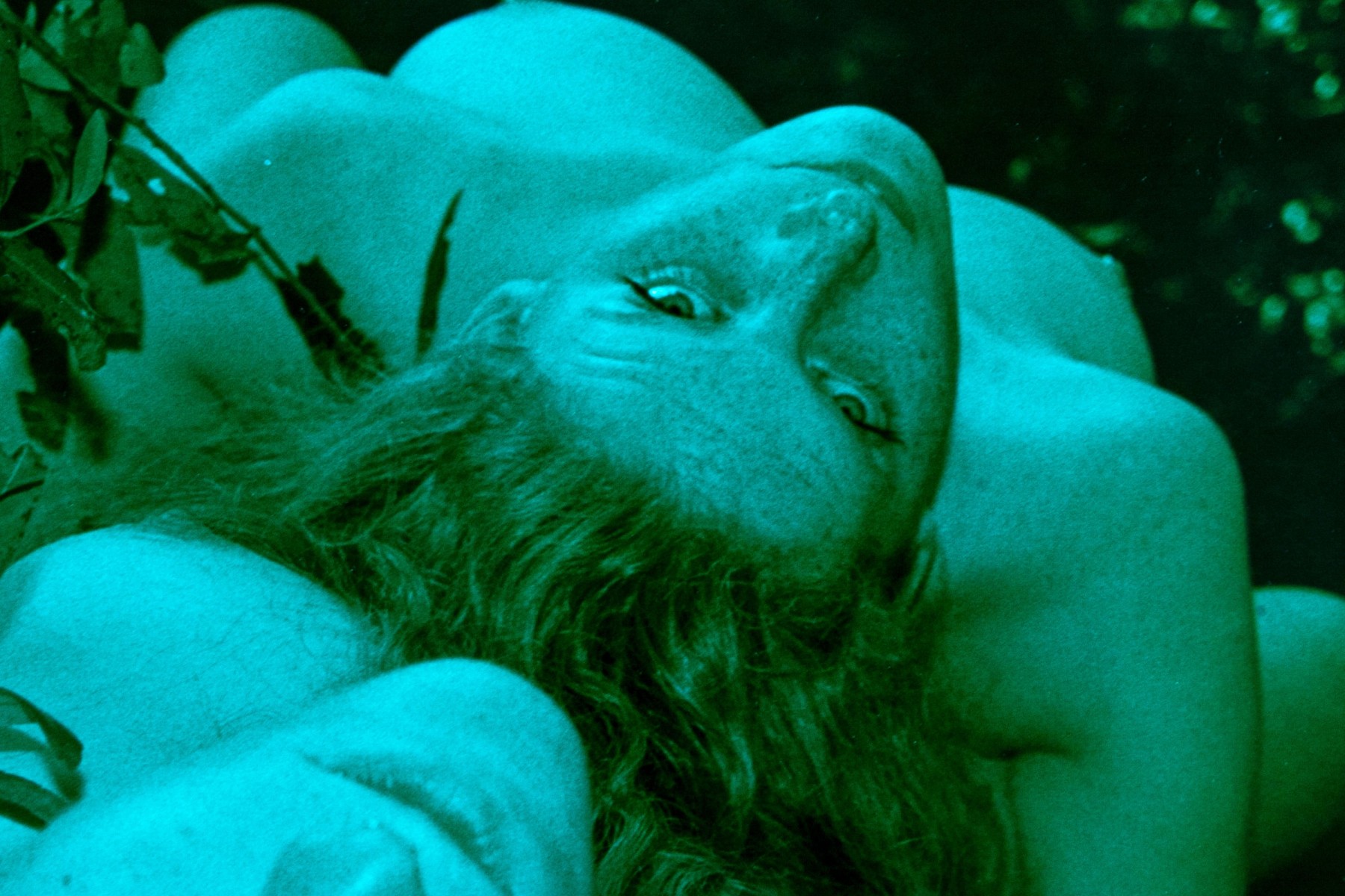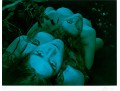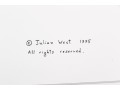 Julian West (American [CA], B. 1964) "Untitled n. 20, 1995" mounted photographic print depicting two nude figures looking up at the viewer surrounded by forest foliage in an atmospheric blue-green tint. Pencil signed and dated 1995 lower right, numbered 3/28 lower left, copyright and artist labels on the verso. Unframed.