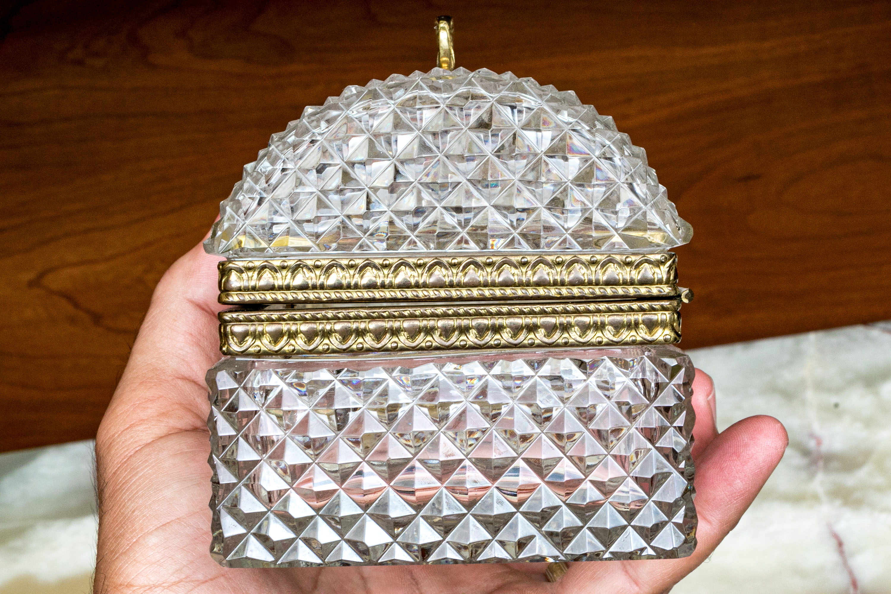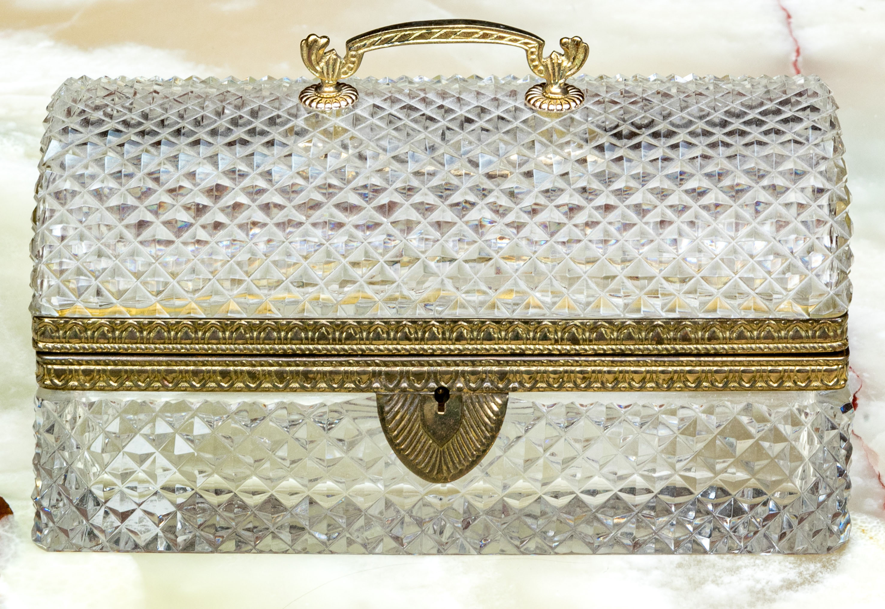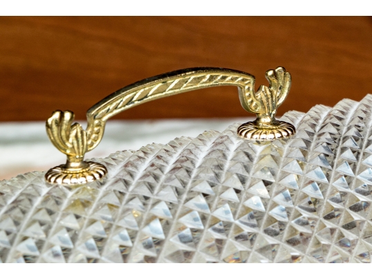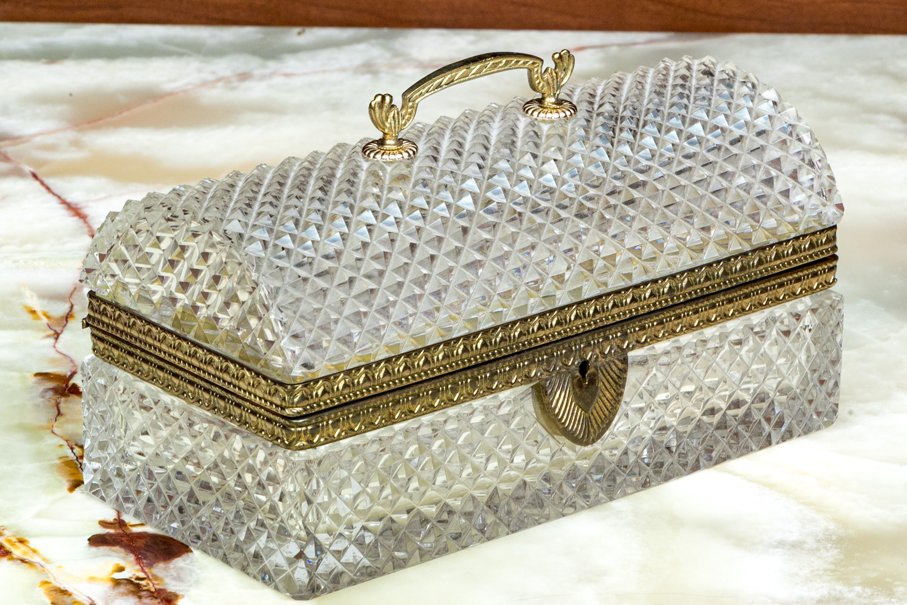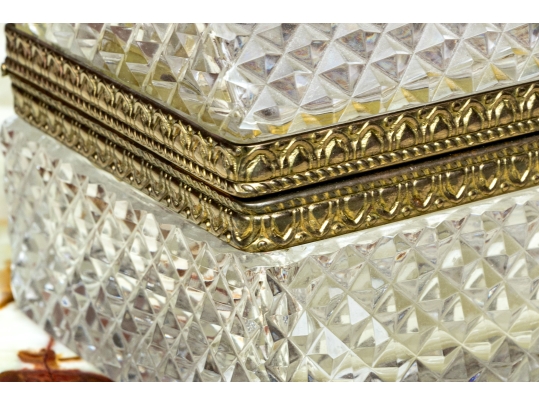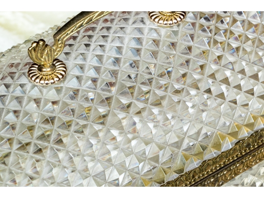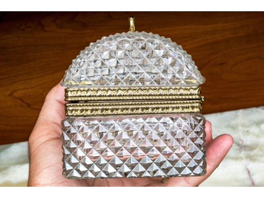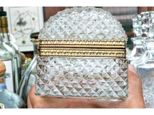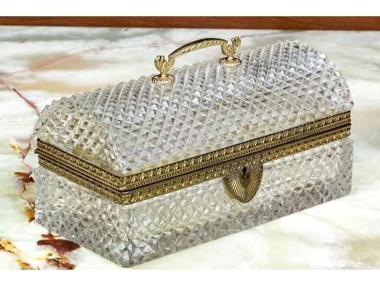 The cut crystal domed lidded box with art deco style gilt metal mounts along with handle atop the domed lid.